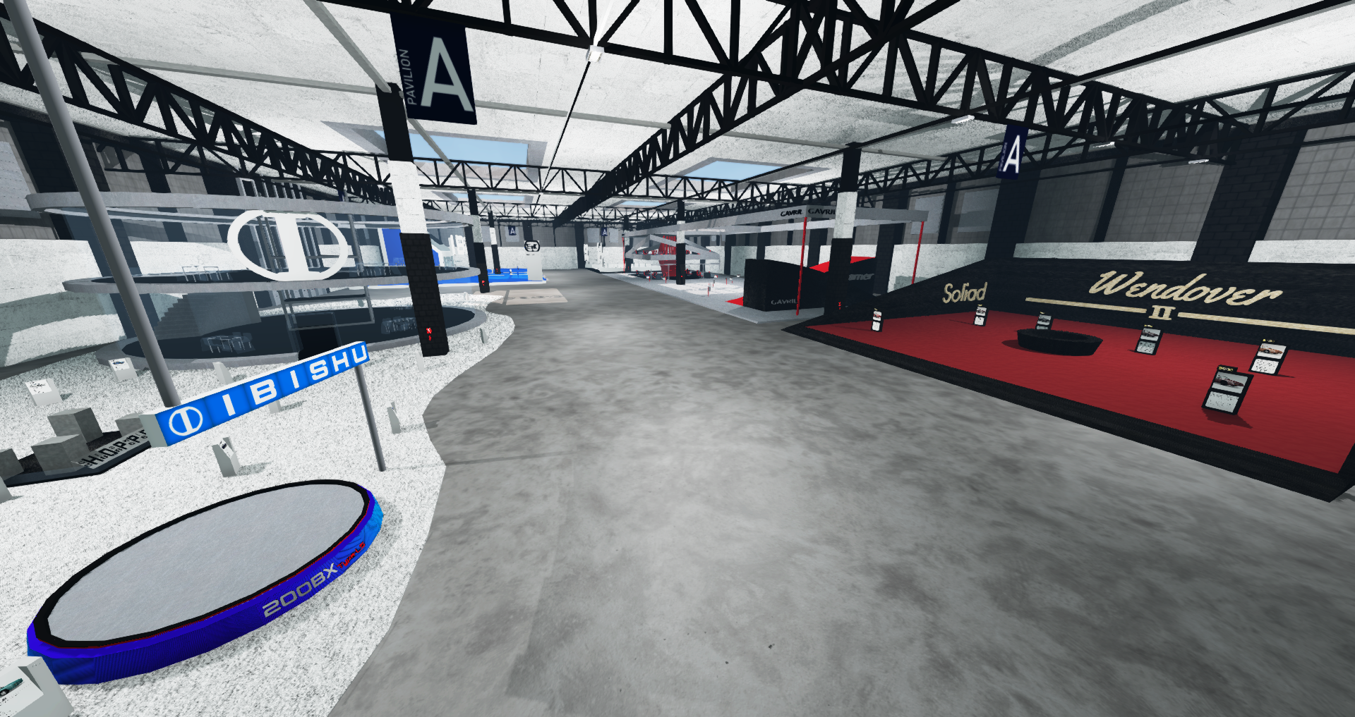 - Custom stands for each brand, with main buildings with furniture and individual information displays for each car shown for sale.