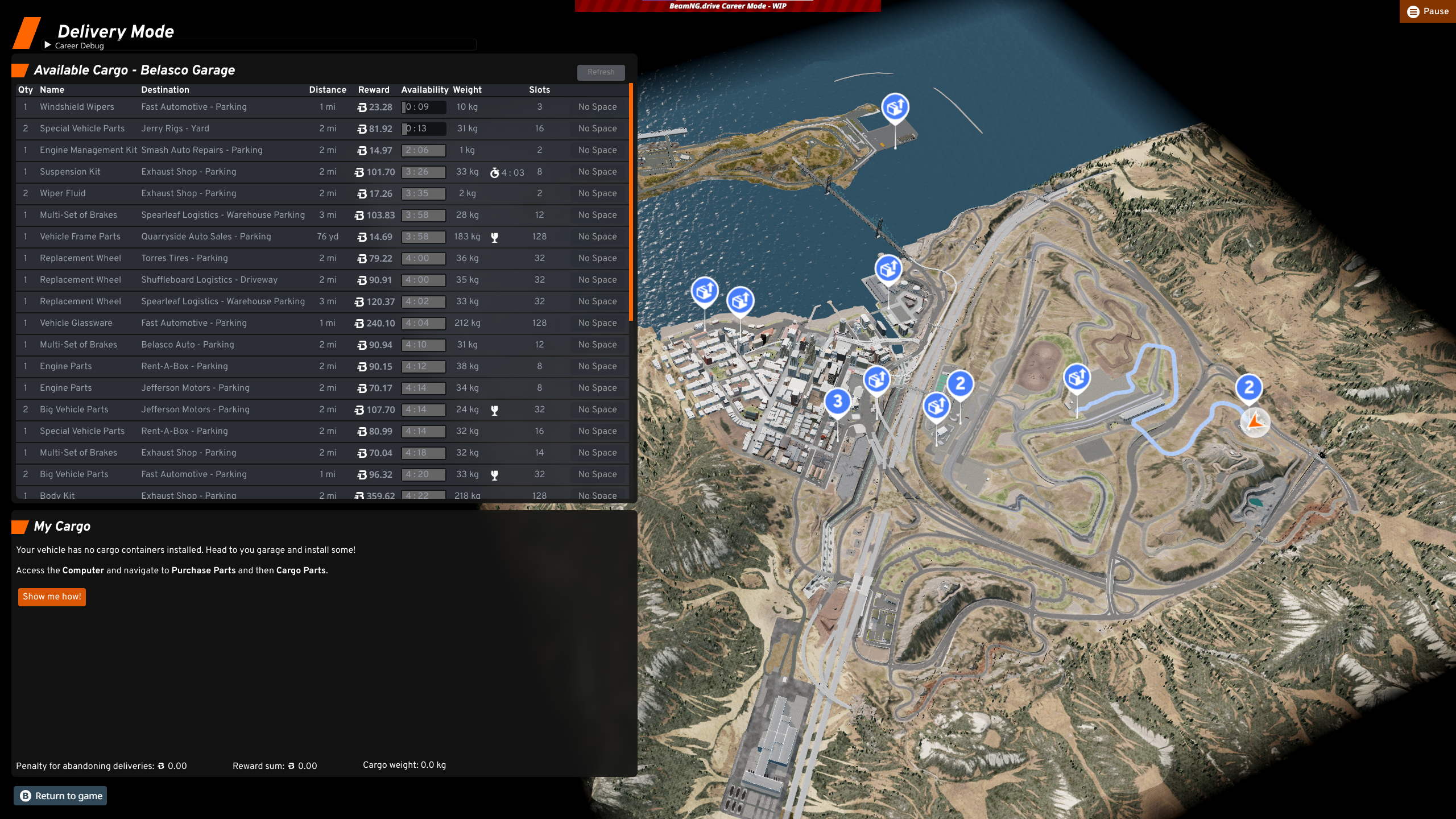 Mod status is currently OUTDATED. The files used to make this mod require changing Career LUA files and Map Files for WestCoastUSA. Both of which had major changes with the 0.31 update. Continuing to use this mod with 0.31 will result in ALL changes made to Career Mode and WestCoastUSA to not show up and may break the map and\or Career mode entirely.
