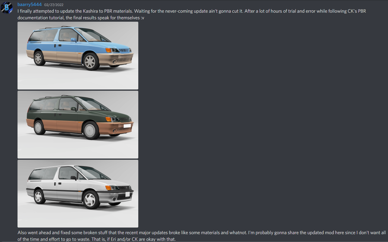 I'm not trying to steal the spotlight away from you, but for the past few months, I actually have been working on a PBR update for the Kashira. The only difference being that I got the a-okay from both Re:Z_IA and Car_Killer. The only reason why I replied now is because you said you needed more time to work on it, but I'll let you save that time and spend it on something else. Here's the proof via Discord, if anyone asks: As for an ETA, there still needs some more work done (such as fixing those darn texture and material issues that y'all have reported so far in 0.24 and 0.25), but all I can tell you is that it's not dead just yet