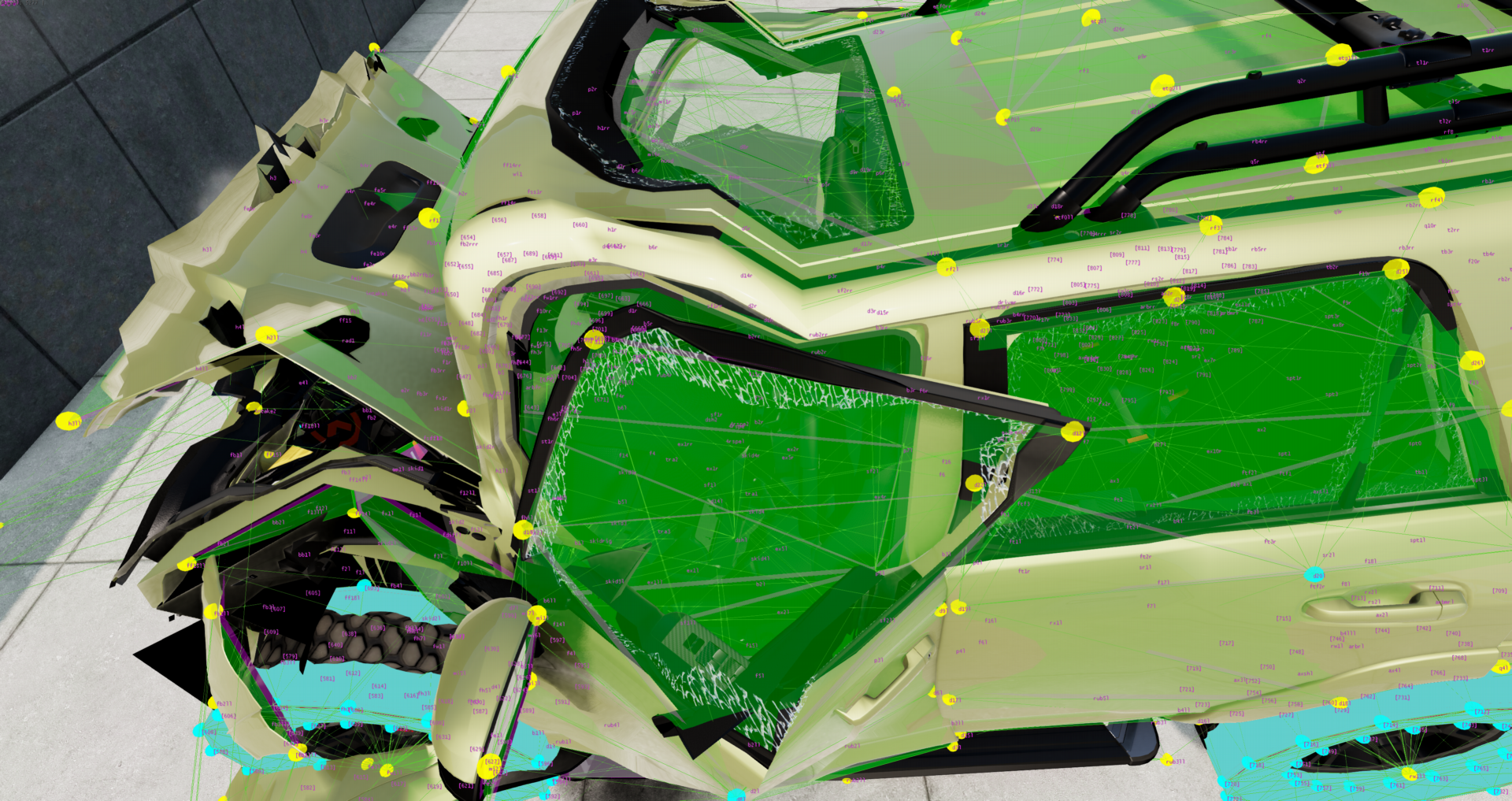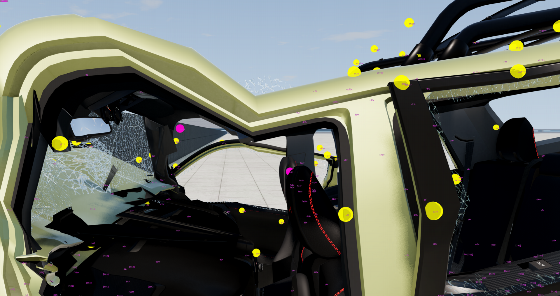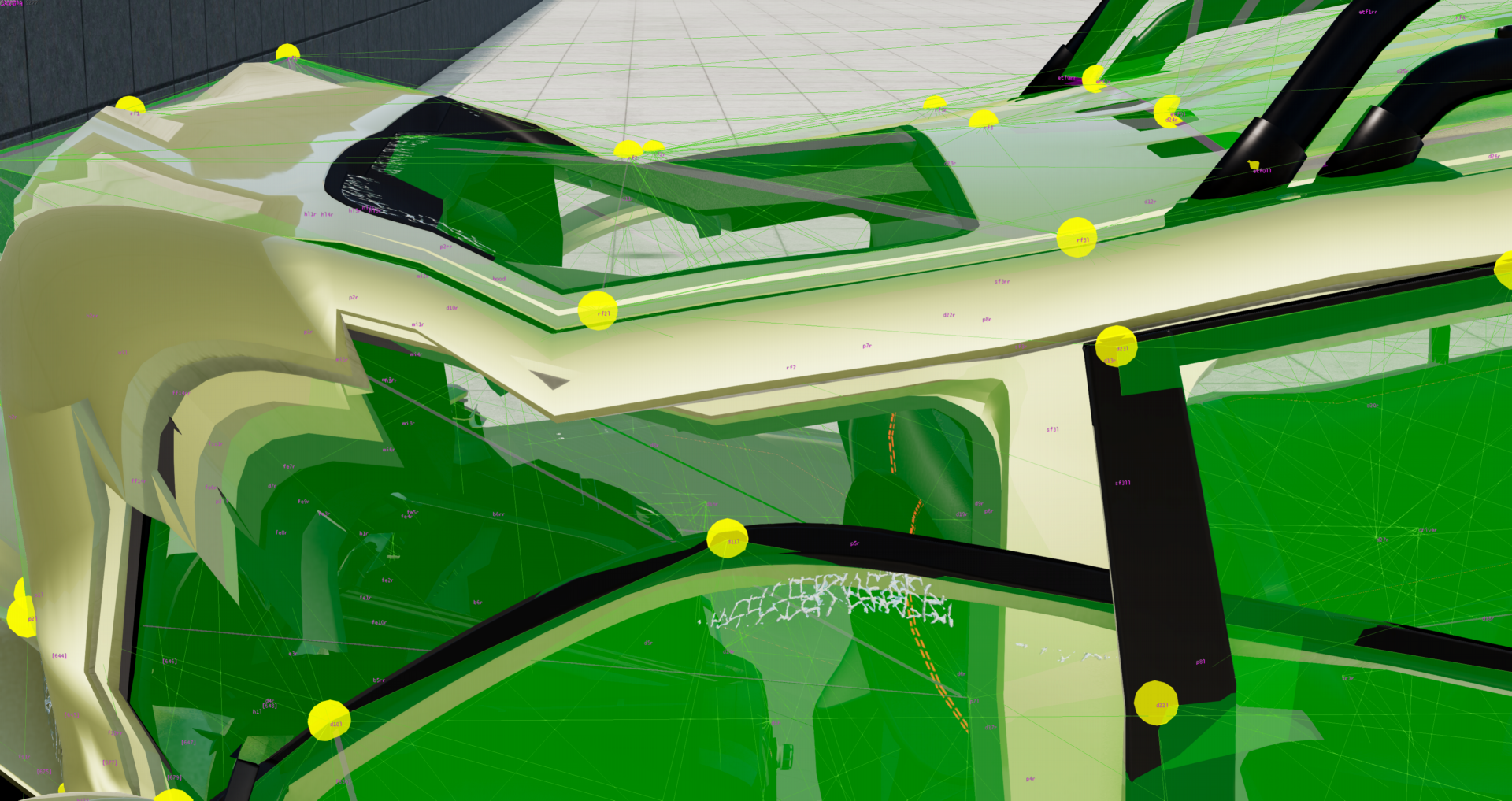 After some checking, it is true that the nodes around and above the B pilar were not placed as correctly as they should, but even after adjusting them...not much changed. In the picture above, you can see the rf2, p8 and p7 nodes sitting where they should, and even with that crash at 150 km/h, the roof still 'bends' on front of it, so not sure what to do here...anyway, since the adjustment did pretty much nothing, I will not release a hotfix, but since at least nodes are better placed now, the adjustment will be included for the next update for sure.