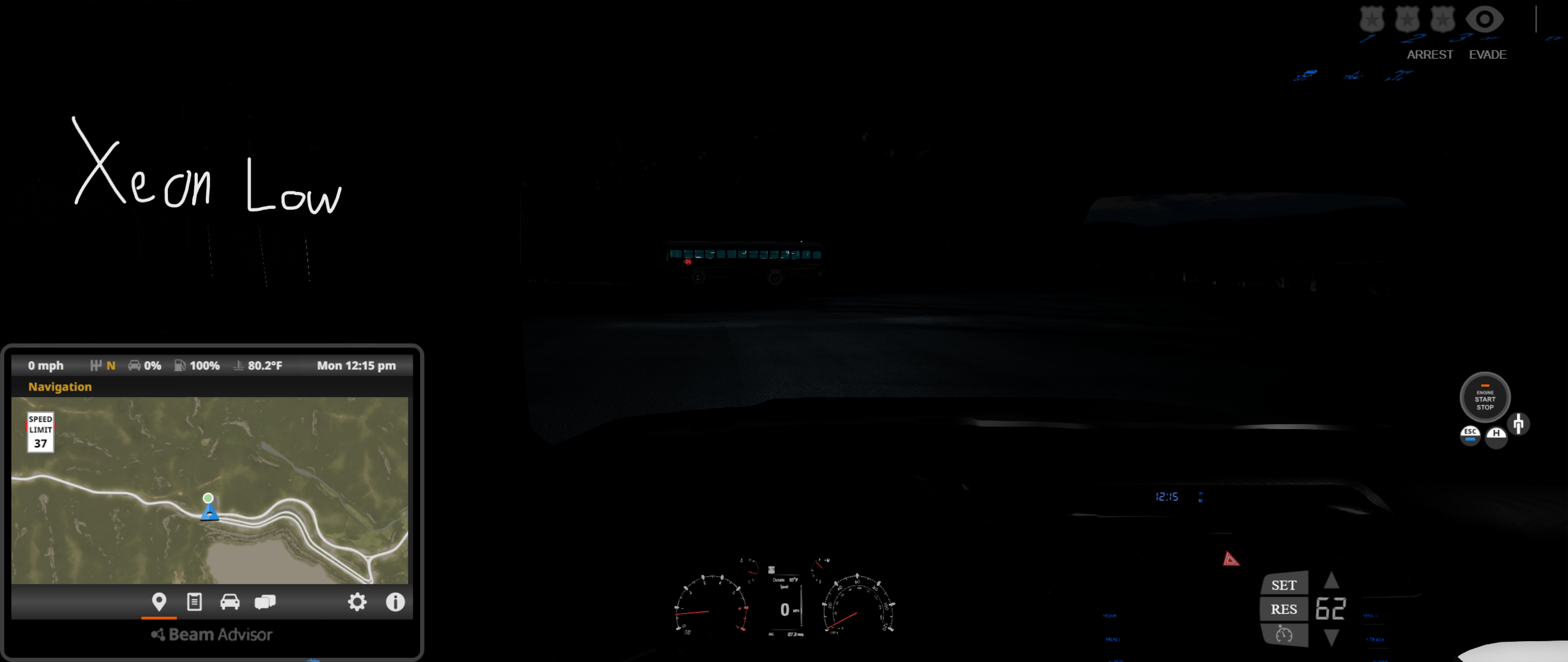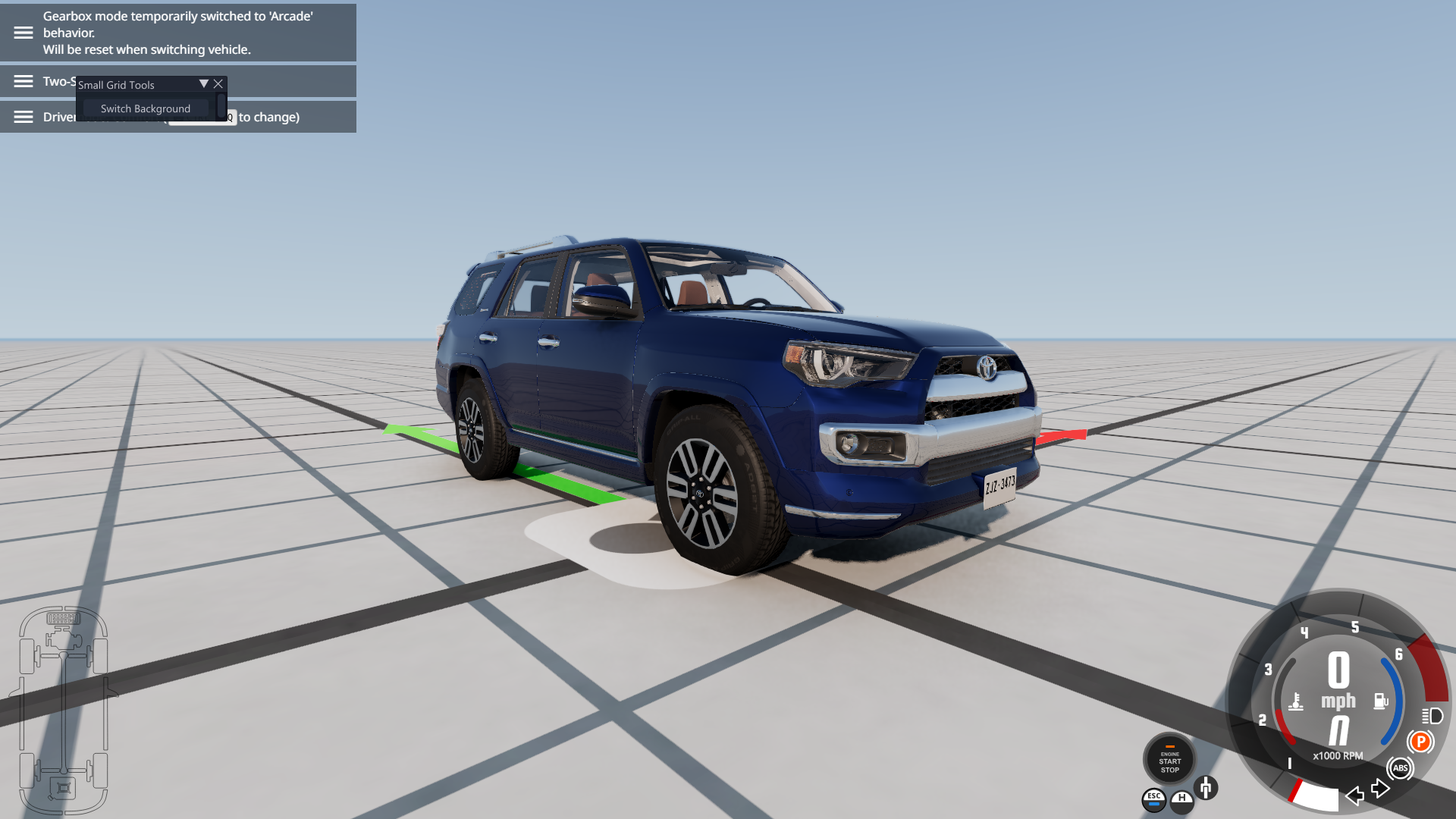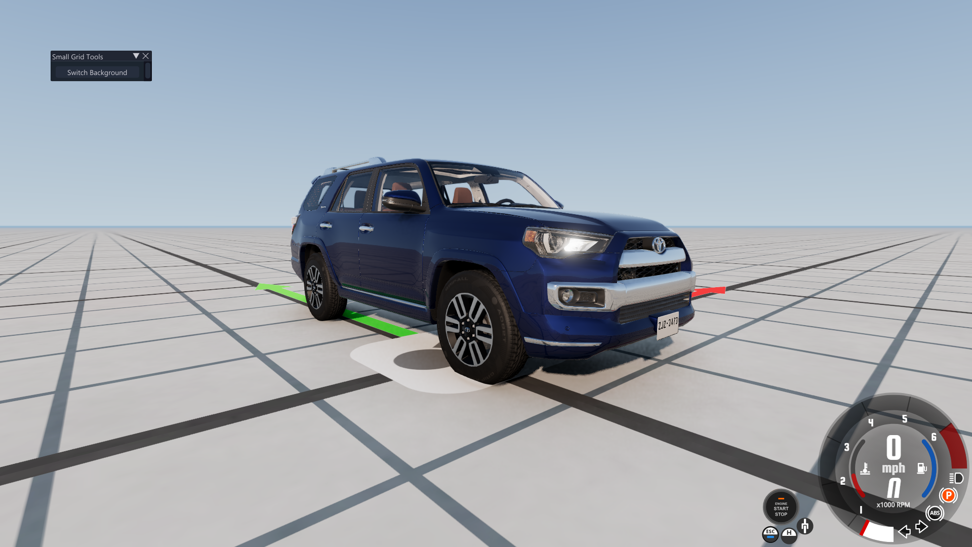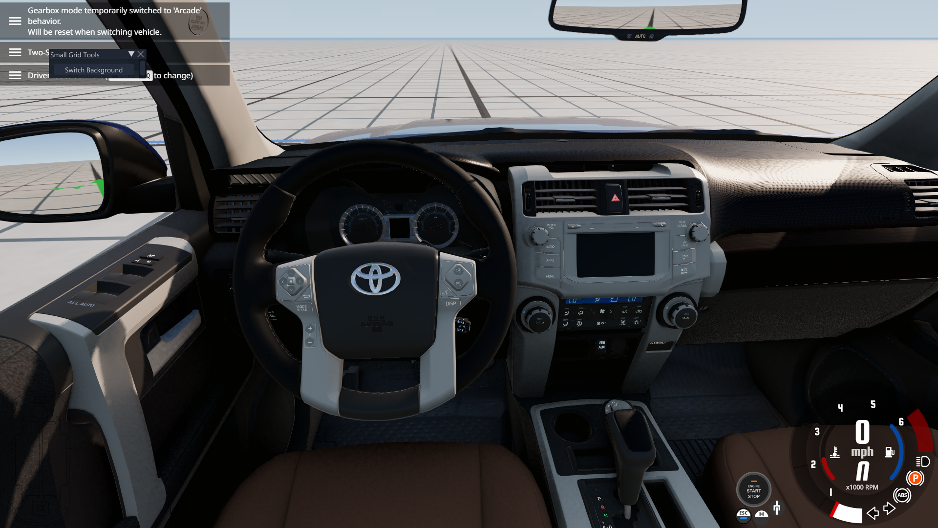 • For some reason, the headlights on the Limited, Nightshade, and TRD Sport trim levels are not playing nice with the game, at least initially when spawning it for the first time, or reloading/resetting it in a session when the default ignition state is set to On. As a result, the daytime running lights, brake lights, gauge cluster, and infotainment screen are "turned off" while the engine is running, and it occurs on both Arcade and Realistic shifting modes. Doing any of the following fixes this problem: turning off the vehicle and then starting it again, switching shifting modes, moving the vehicle forward or backward and then stopping, turning on the headlights, using the turn signals, enabling the fog lights, and disengaging and reengaging the parking brake. You can see this in the following screenshots at 3 different perspectives, where the left is upon initial spawn or reset, and the right is after performing any of the aforementioned functions.