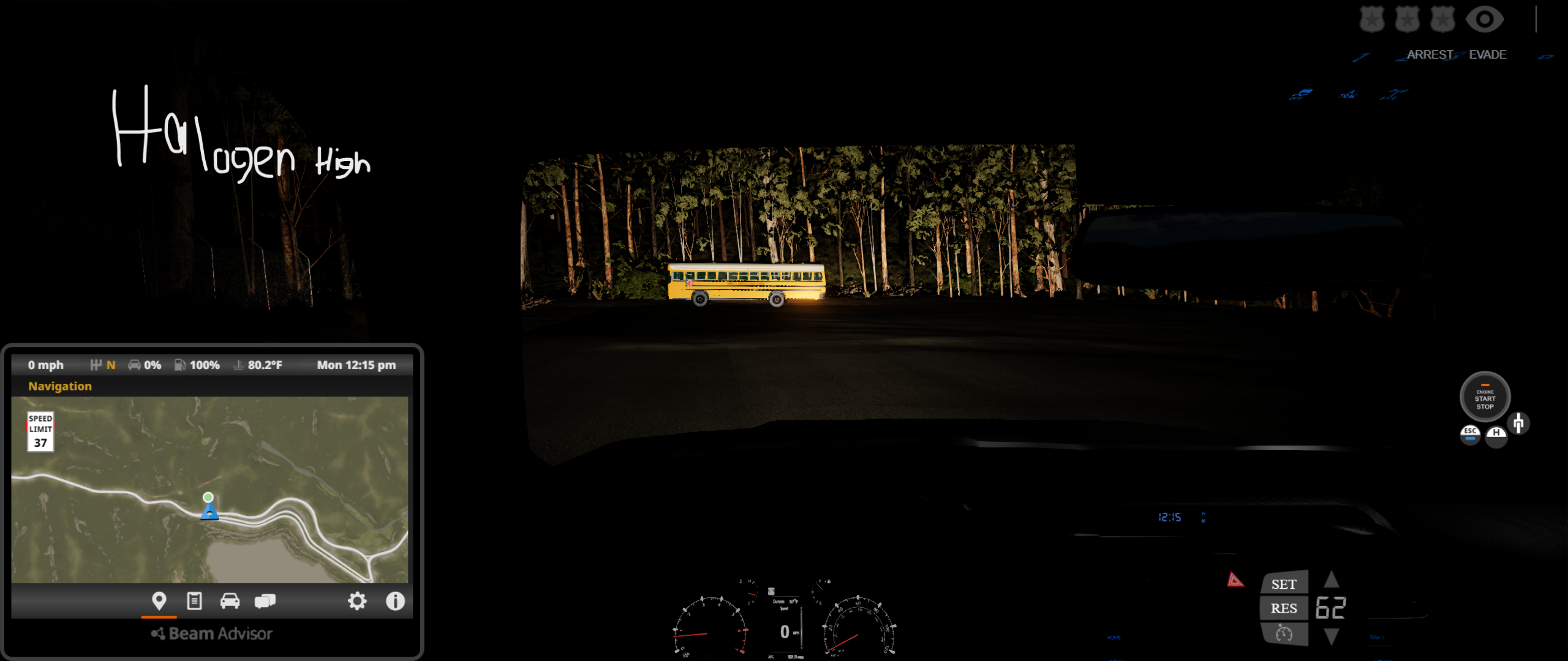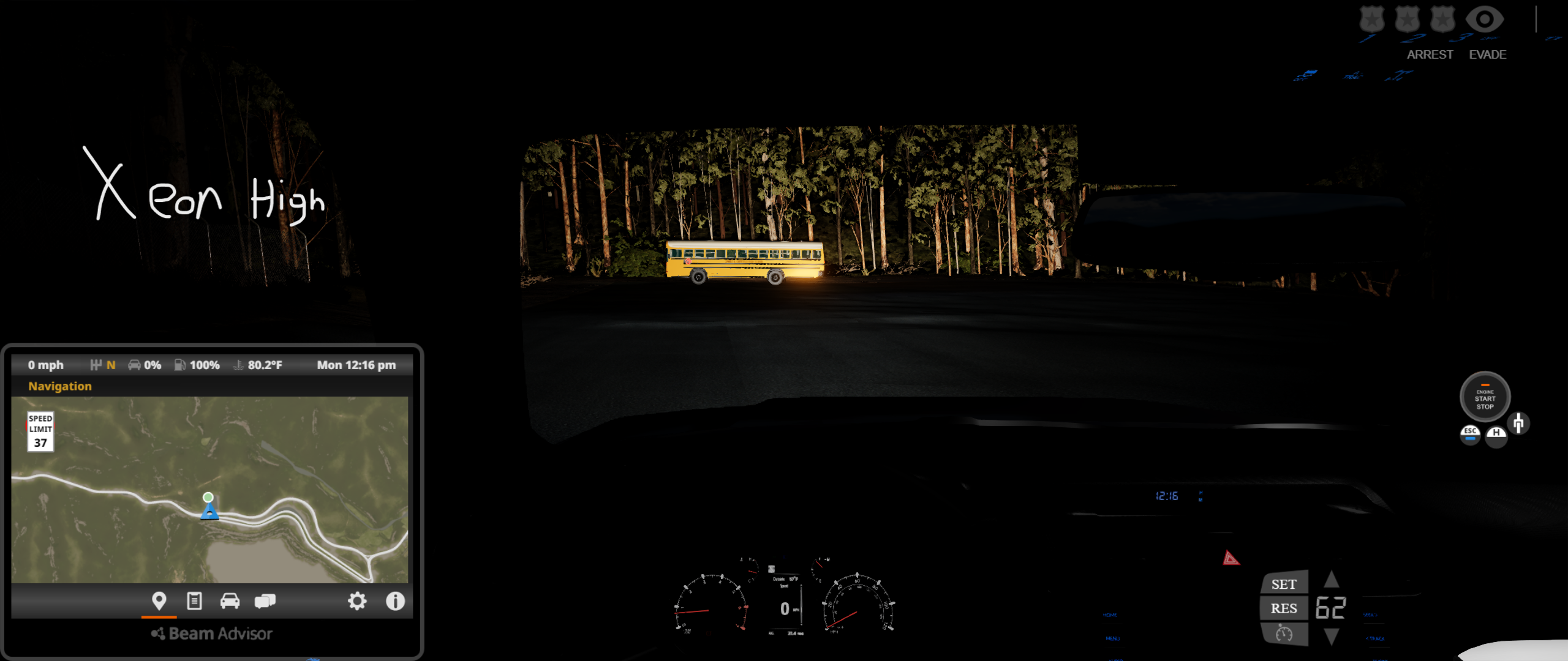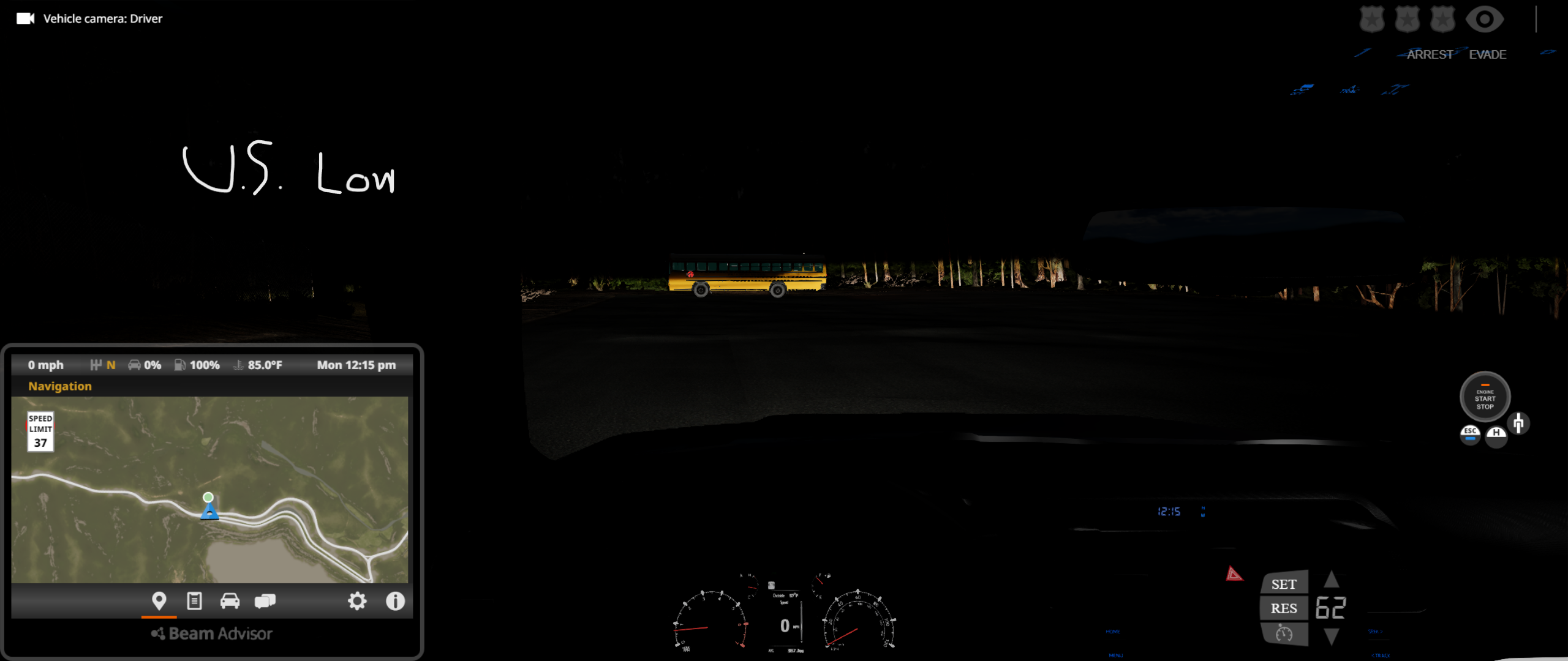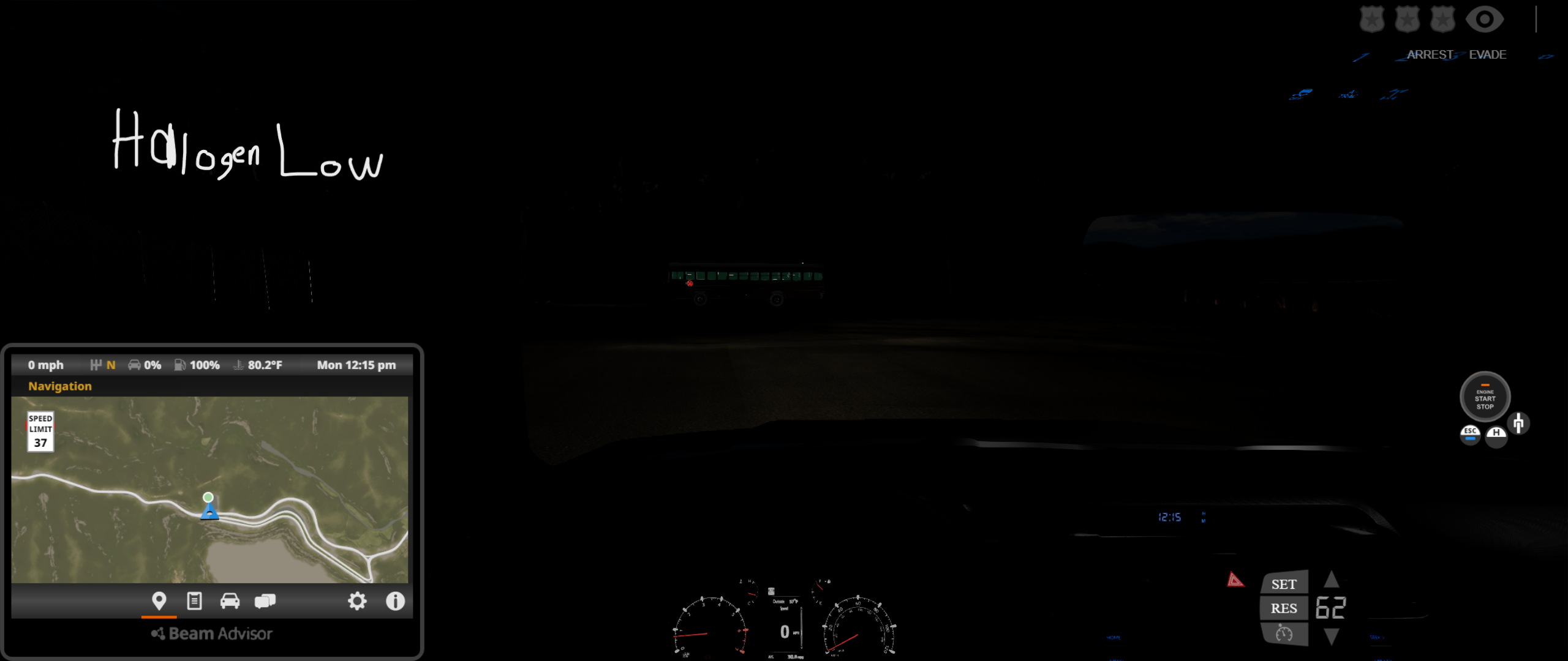 • For some reason, the headlights on the Limited, Nightshade, and TRD Sport trim levels are not playing nice with the game, at least initially when spawning it for the first time, or reloading/resetting it in a session when the default ignition state is set to On. As a result, the daytime running lights, brake lights, gauge cluster, and infotainment screen are "turned off" while the engine is running, and it occurs on both Arcade and Realistic shifting modes. Doing any of the following fixes this problem: turning off the vehicle and then starting it again, switching shifting modes, moving the vehicle forward or backward and then stopping, turning on the headlights, using the turn signals, enabling the fog lights, and disengaging and reengaging the parking brake. You can see this in the following screenshots at 3 different perspectives, where the left is upon initial spawn or reset, and the right is after performing any of the aforementioned functions.