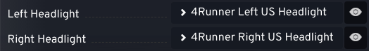 • These US headlights are most likely the root cause, because by swapping to the other set of headlights in the parts selection menu, the issue no longer persists. In other words, all other configurations with the different sets of headlights do not cause the issue. Having at least one of the US headlights selected (left, right, or both) will trigger the aforementioned problem. Even the console outputted some errors relating to the headlights (when ignoring the rest of the console errors).