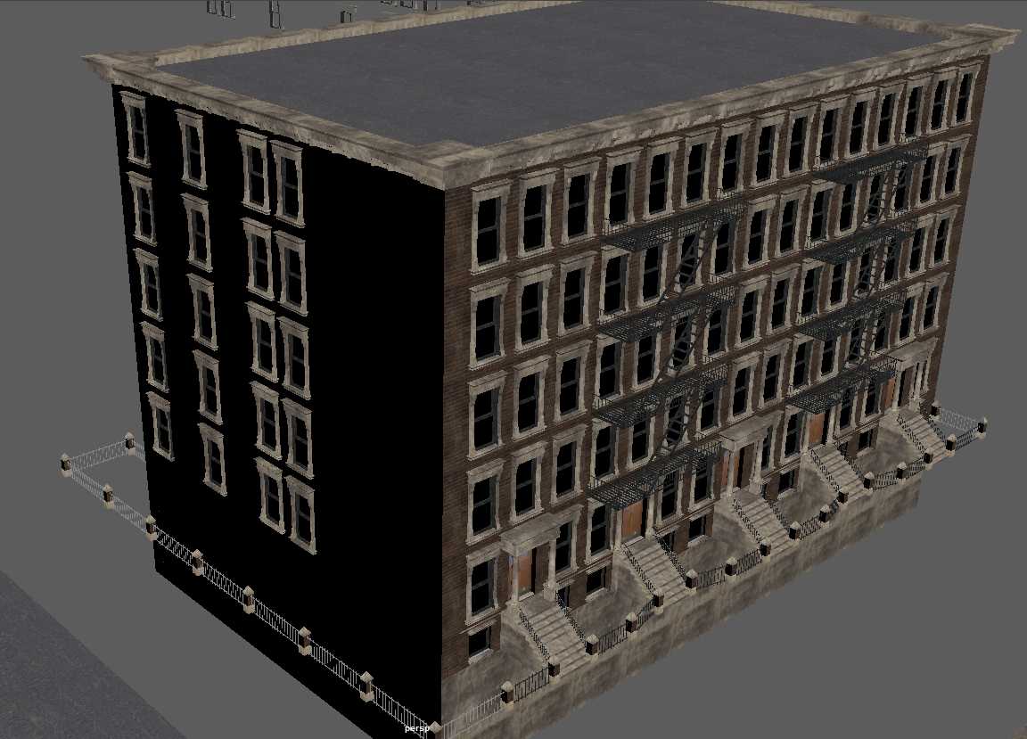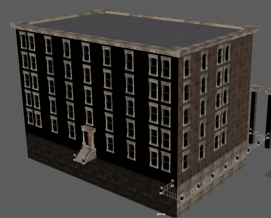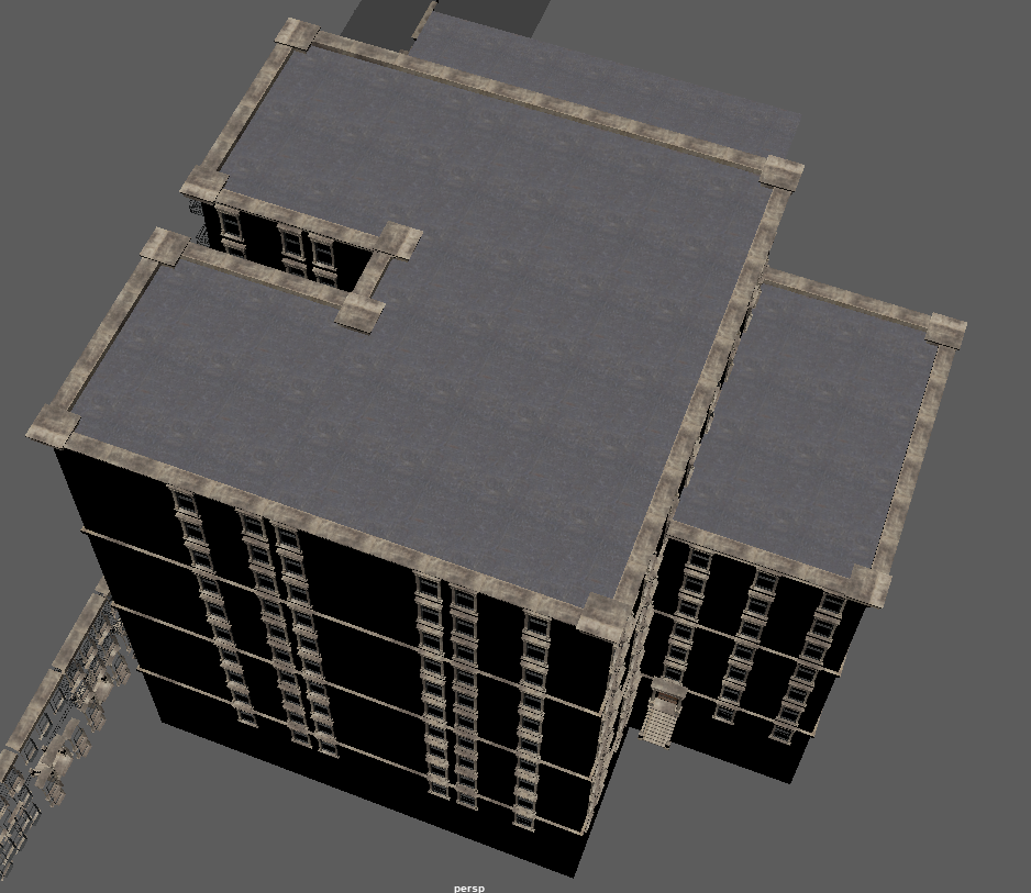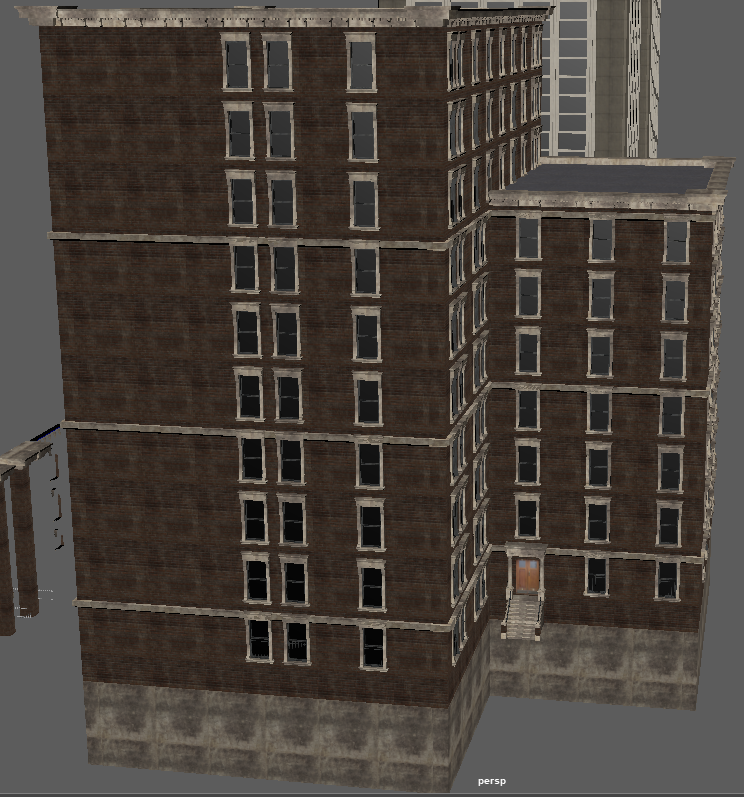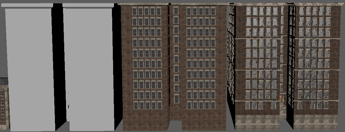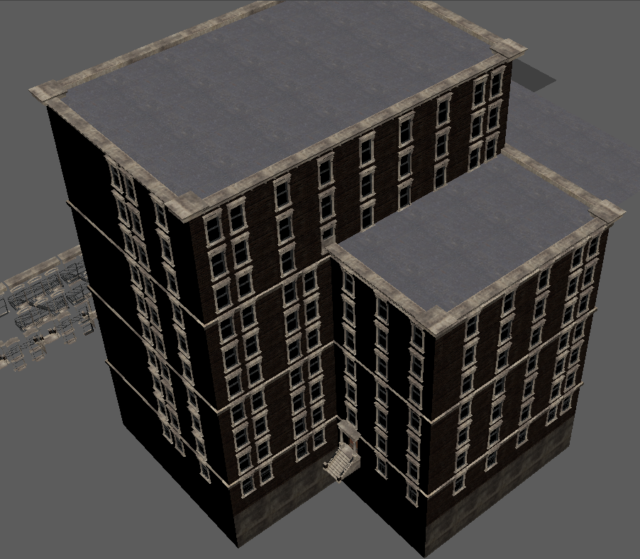 Worry not my friend; this map won't cease development so long as my heart is beating - and I've restarted it myself the last time that happened (just over 10 years ago woke up with no heartbeat, broke a rib or two but got it going again with a few good whacks to the chest - being that moving my fore-arms was the only thing I could do and couldn't even scream). So needless trivial details out of the way; this project is NOT going away. It will stay being worked on, if only that I (among others) have invested FAR too much into this, to just goof off and throw it all to the wayside. It gives me purpose, too, and that itself is quite important when you're rather drastically physically disabled more often than not (some days I'm pretty good and can walk around for a bit, other days it's a struggle to get to the latrine or the shower). So thank-you. Do not feel bad about limited income, for this is the way most of the world lives. Chances are more than likely that most of the people you meet in the day - some 9 out of 10 - or even 19 out of 20 - are in the very same position as you. Just keep working hard towards your goals, and like this project, things will get better one day. My father said 'it might seem terrible, but if you're down at the bottom of the hill looking up at possibility and a better financial future, you really have no way to go but UP'. 75% of people making 6-figure salaries are living at (or just-about at) paycheck-to-paycheck, as things are no-longer like they were 20~25 years ago. Just don't forget to enjoy life along the way. I'm glad you find fun in the chases in this map, they can be a hoot. I am continually refining the AI here and there as I chase it into various corners of the map (or it does such to me!), so there will be plenty of fun to be had in the future here. Entirely on the modeling end, I've made some more brick boxes. Oh boy MOAR BRICK BOXES! Wow! Oh, and again, I can't say this enough (evidently), appearances will be more varied when it comes to exterior finishes in the map (read: more than just red bricks with beige trim). This is just what's being used in the modeler. Making the 10 floor version of the collision mesh and low-detail LOD model was quick and painless, as I've imported them over from the 7-floor model and was able to quickly update the size/texture as-needed. Also, the other three buildings are relatively similar, and are made to fill the void of medium-sized brick boxes we need for areas of the map with moderate to low land value, where the rest of us can afford to shack up. All buildings feature 'burglar bars' on the lowest floor windows and fairly accurate collision meshes including roofs where you won't get stuck (edges are ramped), though fire escapes do NOT currently have collision meshes. The only time fire-escapes will have collision meshes, is if you would have a reason to walk them (like a 'player home' type area at the end of one) or if they're close enough to the ground that player interaction is likely. I will make 'assist' collision meshes if there are jumps/ramps nearby so you don't pass through it readily and break immersion, but only when needed for jumps, to keep CPU free for other physics and draw call duties.