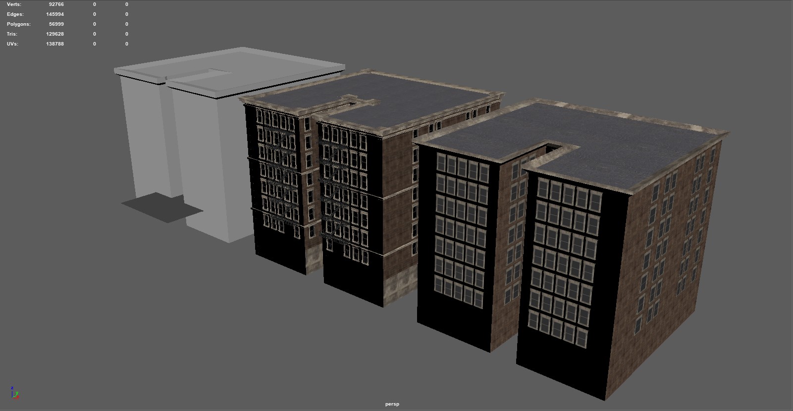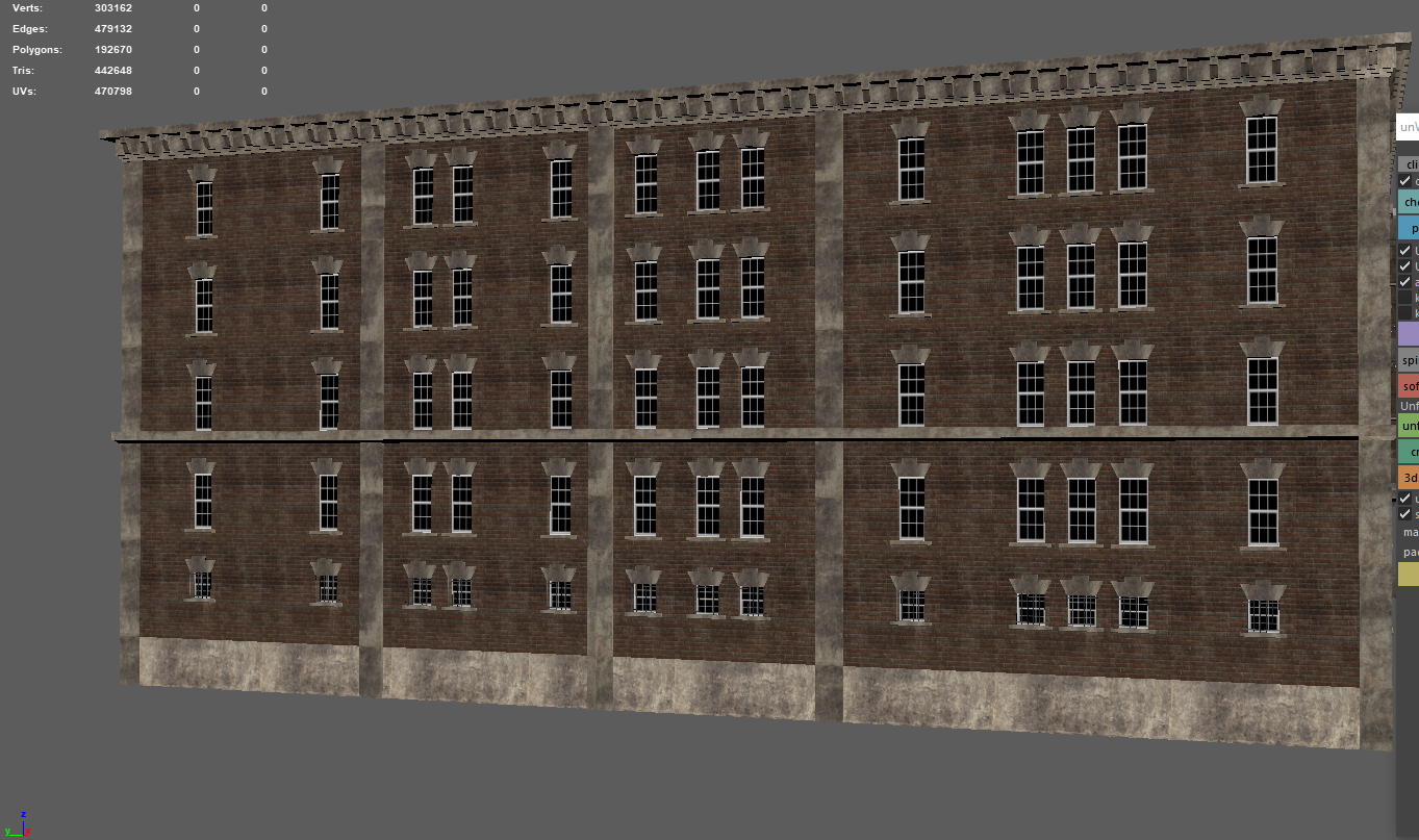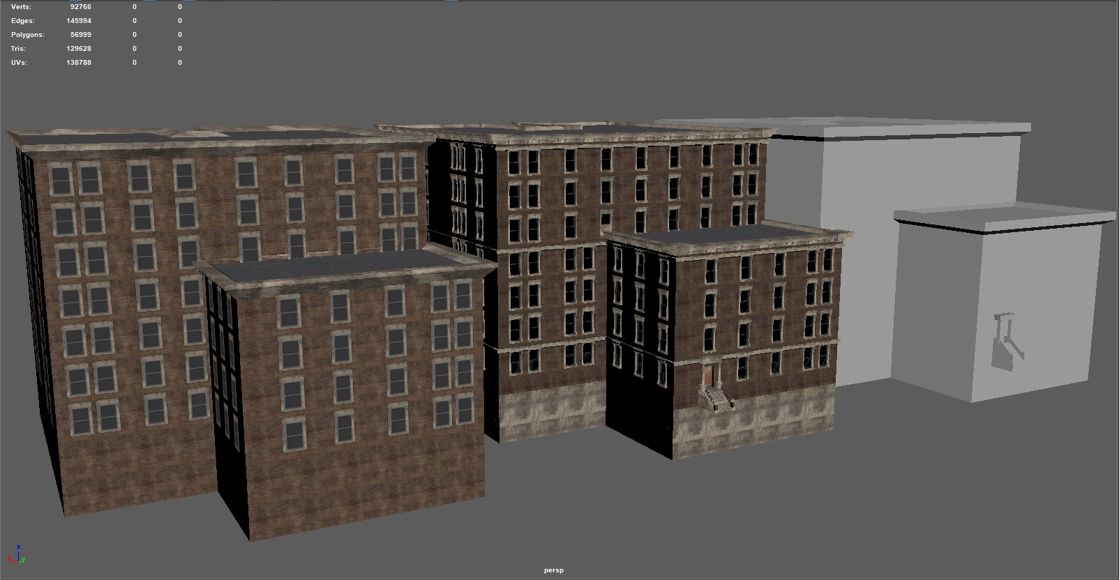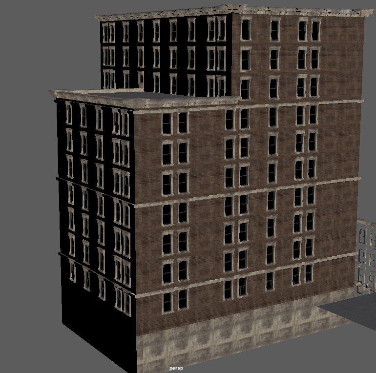 Worry not my friend; this map won't cease development so long as my heart is beating - and I've restarted it myself the last time that happened (just over 10 years ago woke up with no heartbeat, broke a rib or two but got it going again with a few good whacks to the chest - being that moving my fore-arms was the only thing I could do and couldn't even scream). So needless trivial details out of the way; this project is NOT going away. It will stay being worked on, if only that I (among others) have invested FAR too much into this, to just goof off and throw it all to the wayside. It gives me purpose, too, and that itself is quite important when you're rather drastically physically disabled more often than not (some days I'm pretty good and can walk around for a bit, other days it's a struggle to get to the latrine or the shower). So thank-you. Do not feel bad about limited income, for this is the way most of the world lives. Chances are more than likely that most of the people you meet in the day - some 9 out of 10 - or even 19 out of 20 - are in the very same position as you. Just keep working hard towards your goals, and like this project, things will get better one day. My father said 'it might seem terrible, but if you're down at the bottom of the hill looking up at possibility and a better financial future, you really have no way to go but UP'. 75% of people making 6-figure salaries are living at (or just-about at) paycheck-to-paycheck, as things are no-longer like they were 20~25 years ago. Just don't forget to enjoy life along the way. I'm glad you find fun in the chases in this map, they can be a hoot. I am continually refining the AI here and there as I chase it into various corners of the map (or it does such to me!), so there will be plenty of fun to be had in the future here. Entirely on the modeling end, I've made some more brick boxes. Oh boy MOAR BRICK BOXES! Wow! Oh, and again, I can't say this enough (evidently), appearances will be more varied when it comes to exterior finishes in the map (read: more than just red bricks with beige trim). This is just what's being used in the modeler. Making the 10 floor version of the collision mesh and low-detail LOD model was quick and painless, as I've imported them over from the 7-floor model and was able to quickly update the size/texture as-needed. Also, the other three buildings are relatively similar, and are made to fill the void of medium-sized brick boxes we need for areas of the map with moderate to low land value, where the rest of us can afford to shack up. All buildings feature 'burglar bars' on the lowest floor windows and fairly accurate collision meshes including roofs where you won't get stuck (edges are ramped), though fire escapes do NOT currently have collision meshes. The only time fire-escapes will have collision meshes, is if you would have a reason to walk them (like a 'player home' type area at the end of one) or if they're close enough to the ground that player interaction is likely. I will make 'assist' collision meshes if there are jumps/ramps nearby so you don't pass through it readily and break immersion, but only when needed for jumps, to keep CPU free for other physics and draw call duties.