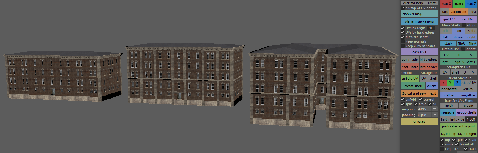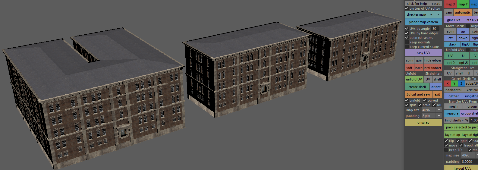 The building I was making a while back out of modular bits is finally 'done' enough to ship it into the map. I will make the LOD very basic but it'll do well enough. Collision-meshes will be done as-needed / when-needed, as like LOD's, they're not part of the prefab stuff at all - only the main model in full detail has modularity (before it's shipped out it gets merged into one piece to avoid murdering your PC with draw calls; Fallout 4 also had the same issue with too many draw calls when you went crazy base-building). This building is a bit of a strange one, but it's really an apartment building that looks like a red-brick version of some classic brown-stones from the front with individual entrances and all, and a single exit in the back. These hybrid-style buildings are much more common than one thinks. There will be different colors and variations of this building, but I also will try to avoid exact duplicates with varied textures to keep the variety up and hence things immersive/interesting. Pictures taken from within the modeling program.