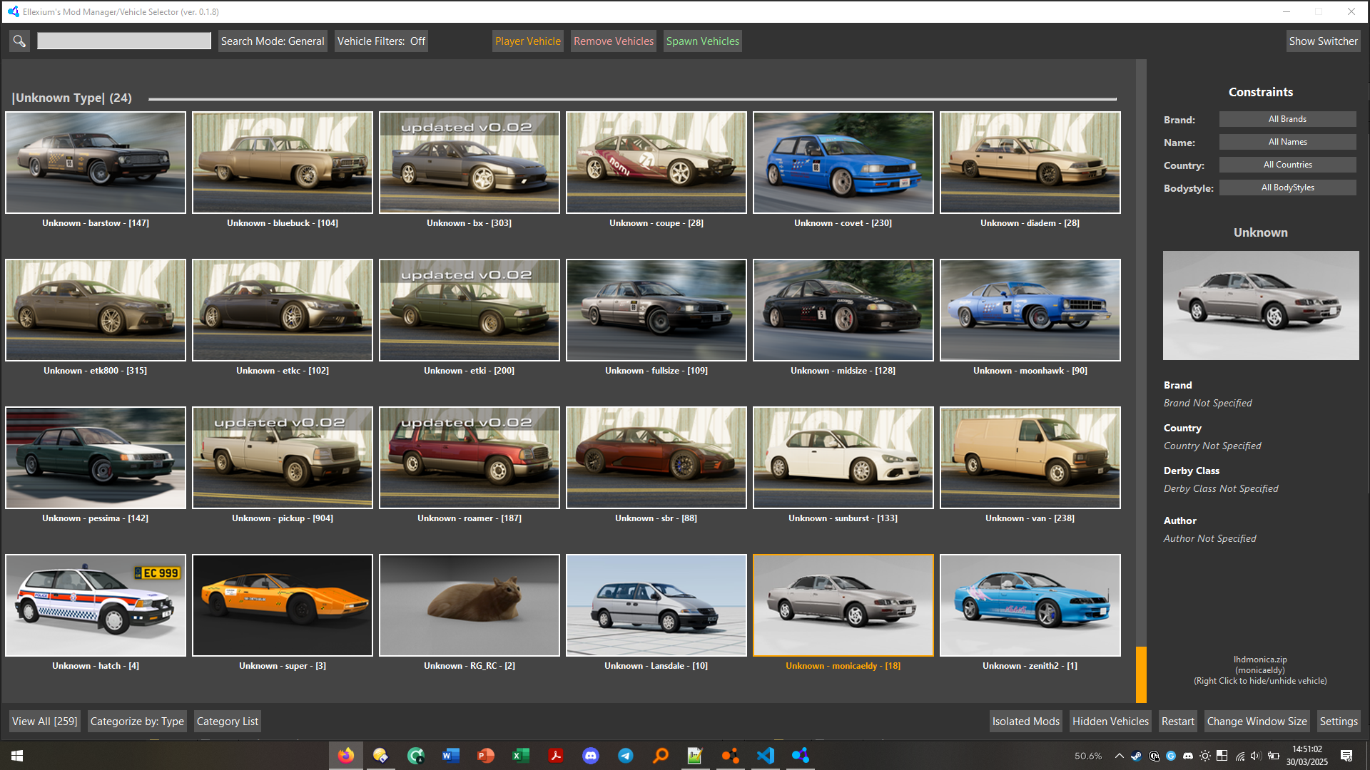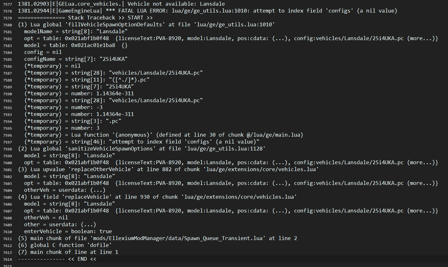 Unfortunately, I'm having an issue where a bunch of vanilla vehicles are showing up as "Unknown" as the manufacturer (see pics) Given the thumbnails and the fact that this only started recently, I assume its due to a mod I installed. This isn't an issue with the game's built in selector. Some of the configs don't spawn - but when I go to find them in the game's built in selector, they simply aren't there. This seems to persist when regenerating cache / reinstalling the manager fully. I have some ideas of how I could narrow it down, but am short on time right now. I'll update with more details later. The reason I'm posting this now is just incase it rings a bell and you know what the underlying issue could be. Additionally, I notice these thumbnails all have a similar style (the roamer, etc) - does anyone recognise what mod this is? I couldn't seem to find it through googling the word or reverse searching the image. It's potentially the cause. Also - when I deep cleaned cache, the manager controls disappeared from my game and I had to re-add them. Might be worth adding a check & warning for this - could just check that the relevant lua files exist + have correct contents in the user folder? Reason I also mention contents too is, there was a time earlier when the controls appeared but had no bindings. EDIT: I'm also noticing that I'm getting a super long "Initialising data..." on each launch now, before it was short after the first one. Maybe its failing to save caches properly? I have plenty of disk space. Is there a logfile I could provide Also, when I open the Roamer, it just restarts the manager UI (not hard crash - restarts the window, back to initialising data)... Ill probably add my EllexiumModManager folder to a 7z now before troubleshooting, incase it has some hints as to whats breaking it so badly. Also, sometimes it takes a REALLY long time on "Populating Caches...", way longer than Initialising Data ever did.... before, I never even saw that screen Thanks