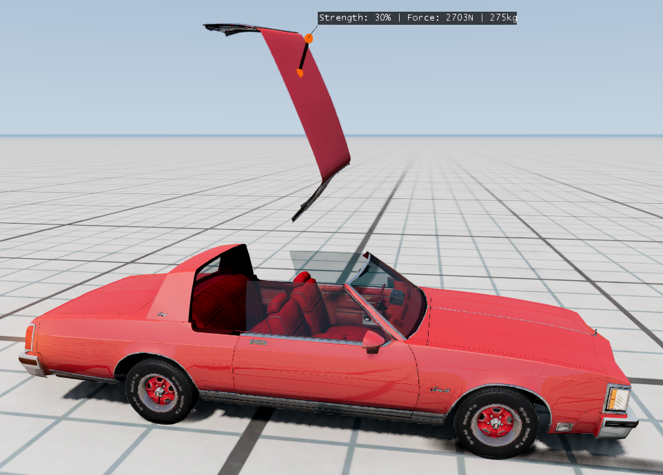 When researching stuff for the Delta 88 pace car recently, I found out that it actually had a unique removable hardtop convertible body. It was not normally available for this car in this generation, they built this body specifically for the race. Today I wondered how hard it would be to make something similar in game, and... It currently just works with couplers like a trailer, but I want to figure out some lua to also make the windows roll down when it's removed. It's meant to be for a replica of the pace car, not factory made, probably someone just cut it with a chainsaw and added some latches and small reinforcements, so it's not the safest design in the world... You will get smacked in the face by the windshield on a high speed crash lol