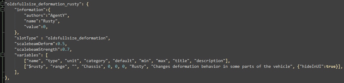I managed to find a way to get the same behavior for rusty parts as in the old version without creating lots of part duplicates. Basically, there is now a new part in selector where you can pick whether the vehicle will deform like normal or like a rusty one. Like the rusty frames in the old version of the mod, it makes the whole vehicle weaker by default using the same scale modifiers as I use on my mods. Additionally, it adds a hidden variable to the vehicle. Then on every parts that needs dedicated deformation finetuning (which is most of the metal parts of the car actually), it checks whether the variable exists, and if yes, it multiplies the scalers by whatever value it needs. The frame has the most drastic and complex changes in behavior, I could have made a separate rusty frame but it was also possible to do it this way. Just to prove that it works: Normal vs rusty car crash test Also funny thing, since I added openable doors, on some rusty cars they get deformed when closing and some will even break the latch then, I will keep this because it's funny
