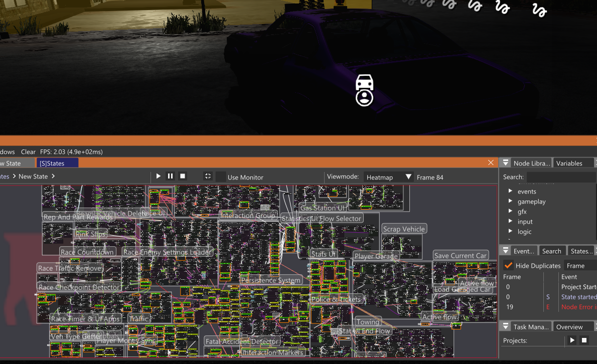 Yeah I can totally understand that lol, I gave up organizing pretty quickly seeing the framerate dropping. Keeping everything as compact as possible with no regard for flow is so I can link stuff without using the window edge camera panning which is impossible to control at low FPS. The other solution is to bring all nodes you want to link in the same area to add stuff but that takes a while too. The editor has other bugs as well, hidden links seem to prevent right clicking to add new nodes in random areas of the graph, sometimes flow would just stop at "bundles" (simple flow in, flow out node to help organize everything) until I relink them. Storing as many variables as possible in a lua table helps because using getter/setter nodes just adds to the editor FPS drop.