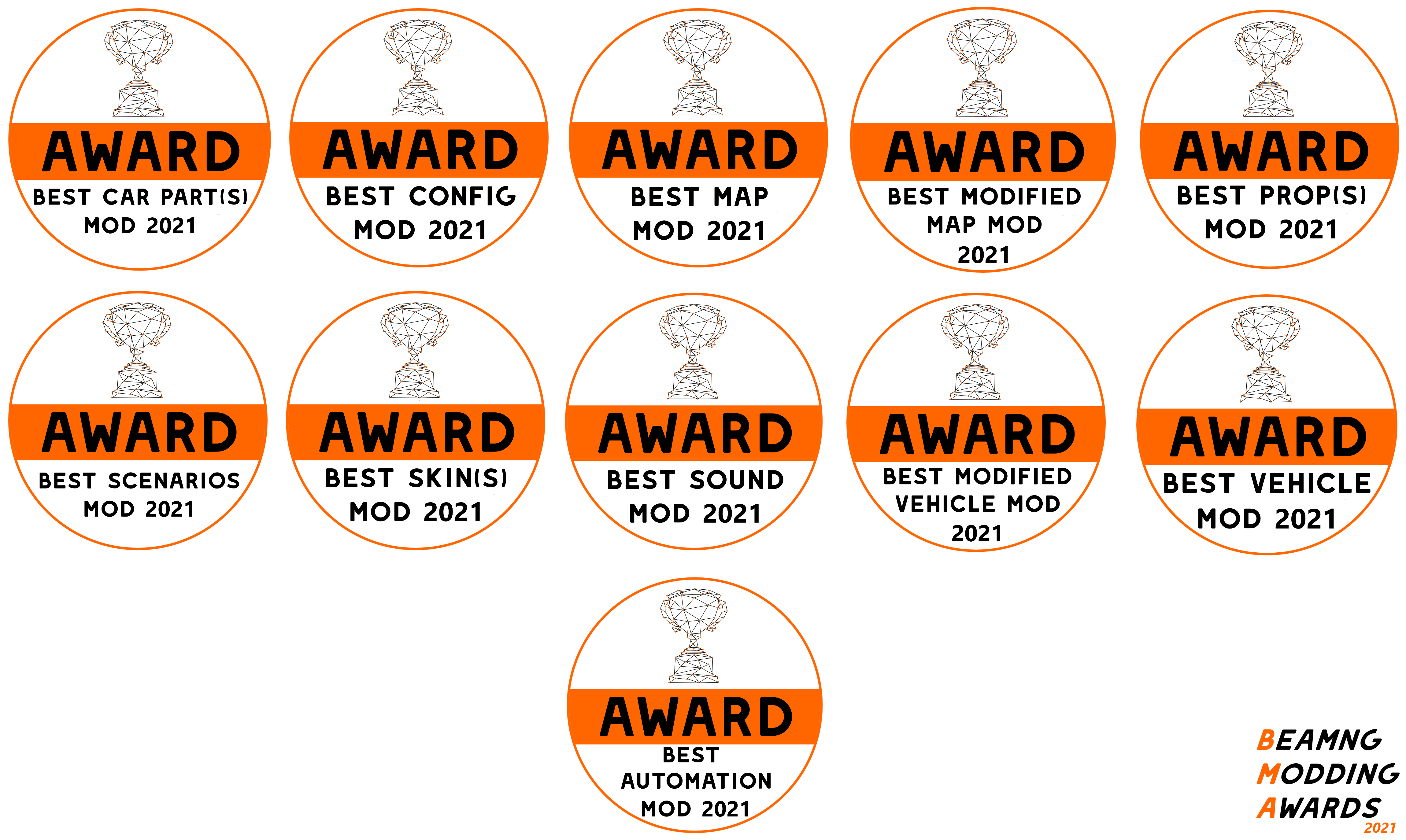 Let's go for the BeamNG Modding Awards 2021! The principle of the BeamNG Modding Awards is simple, people submit the mods they want to see in the competition then the BeamNG community votes and the most voted mods win the award of their category! The categories : The winners don't get any prize in order to avoid any unnecessary drama. It's purely for fun! Phase one of the BeamNG Modding Awards has just started, you have until December 20th midnight (Paris time) to submit the mod(s) you want to see in the competition using the form on the website, no account needed! The BeamNG Modding Awards 2021 is the first edition of this event, so it's not going to be perfect. The goal of this event is to share a nice moment between all and to discover mods as well as to congratulate some modders for their work! Links : The Website : https://kemroindustries.wixsite.com/beamngmoddingawards The Discord : https://discord.gg/dqRtbFqMVC