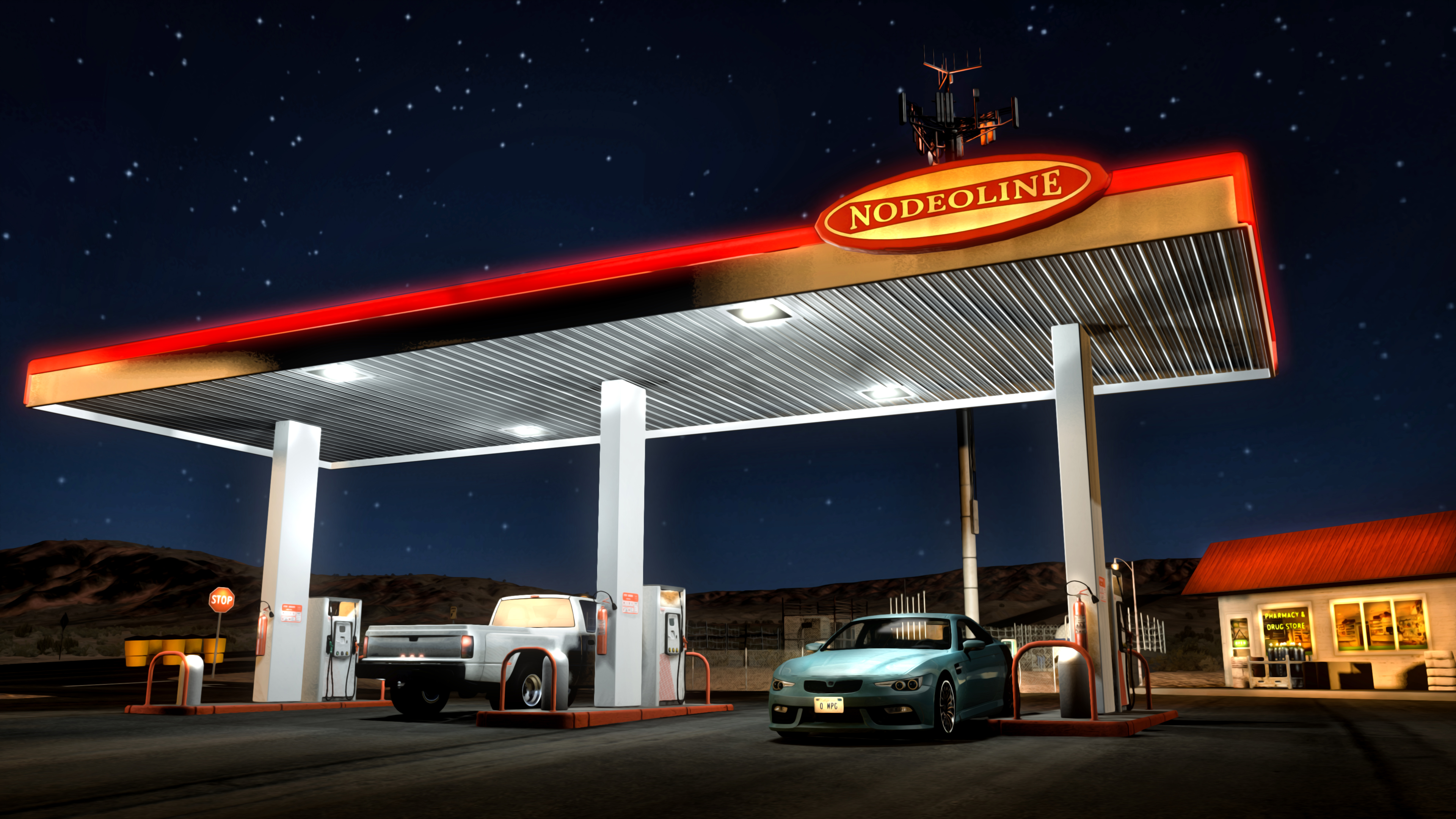 It's still the Nevada Interstate but I put some additional work into the "diner" at one of the intersections, added a few vanilla gas station parts and set up custom lights. EDIT: the LED strip is just an illuminated photoshop layer. I bet, there are options in the editor itself to set surface lights, but I'm quite new on that topic. OT: Sorry for posting this much, but at least I've got some new material ^^