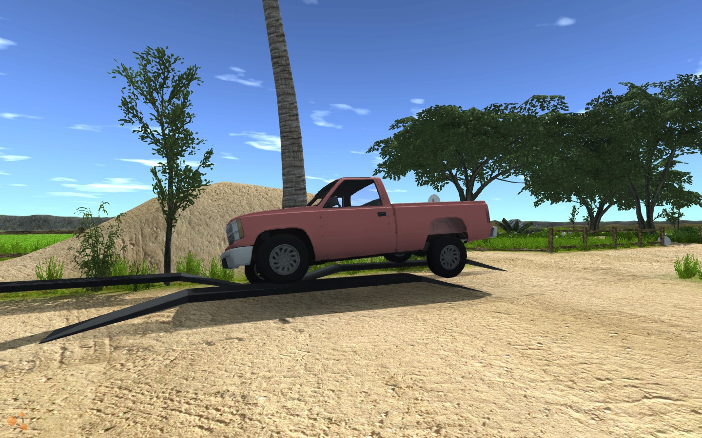The first time I started this map, I had some texture issue with the spawn platform and a ramp. I went to the main menu, started it again, and everything was fixed. Also, I love the map, it's great for testing off-road vehicles and crashing.