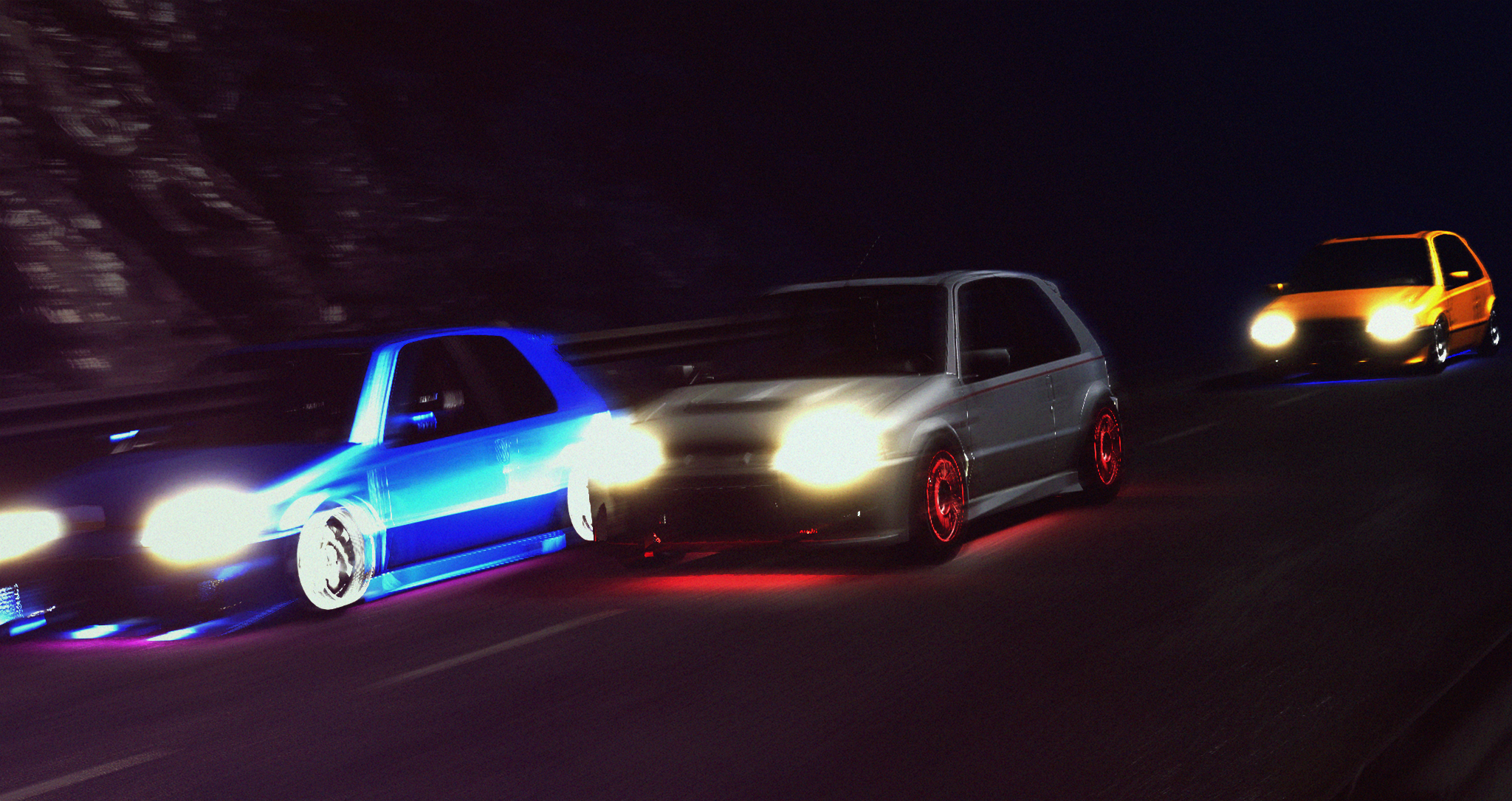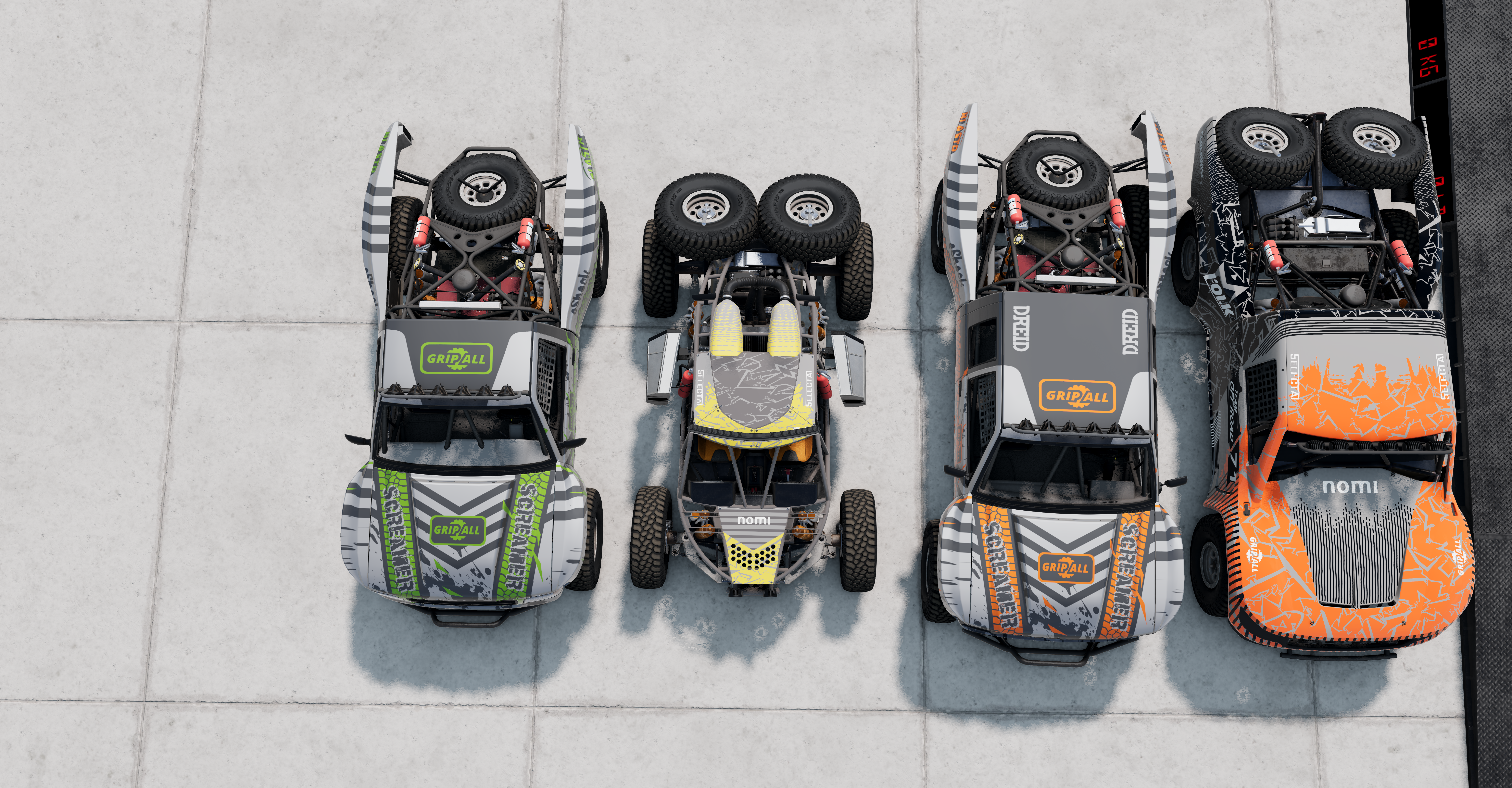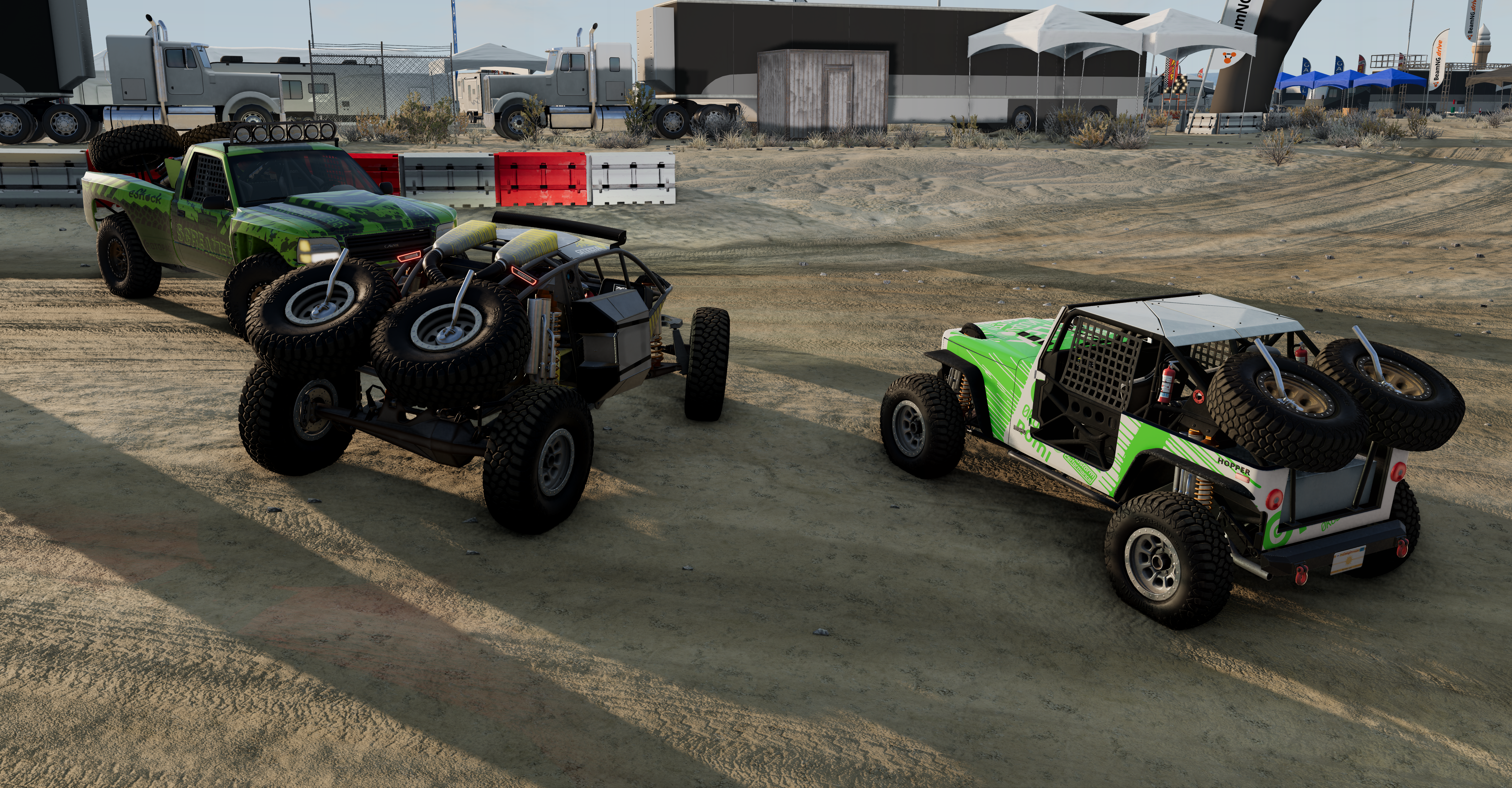 2nd from left is my SP Rock Racer Trophy (dual SP 1000 spare wheels, two extra side fuel tanks to 350L total, dual fire extinguishers, dual throttle body intake). Here is the question, if I could upgrade only one of the two Gavril Prerunners into trophy truck (by adding one extra spare wheel, weight reduction of frame, fuel tank enlargement and giving performance upgrade to the engine, model will be included), should I upgrade the short cab (3090 kg) or the extended cab (3310 kg)?