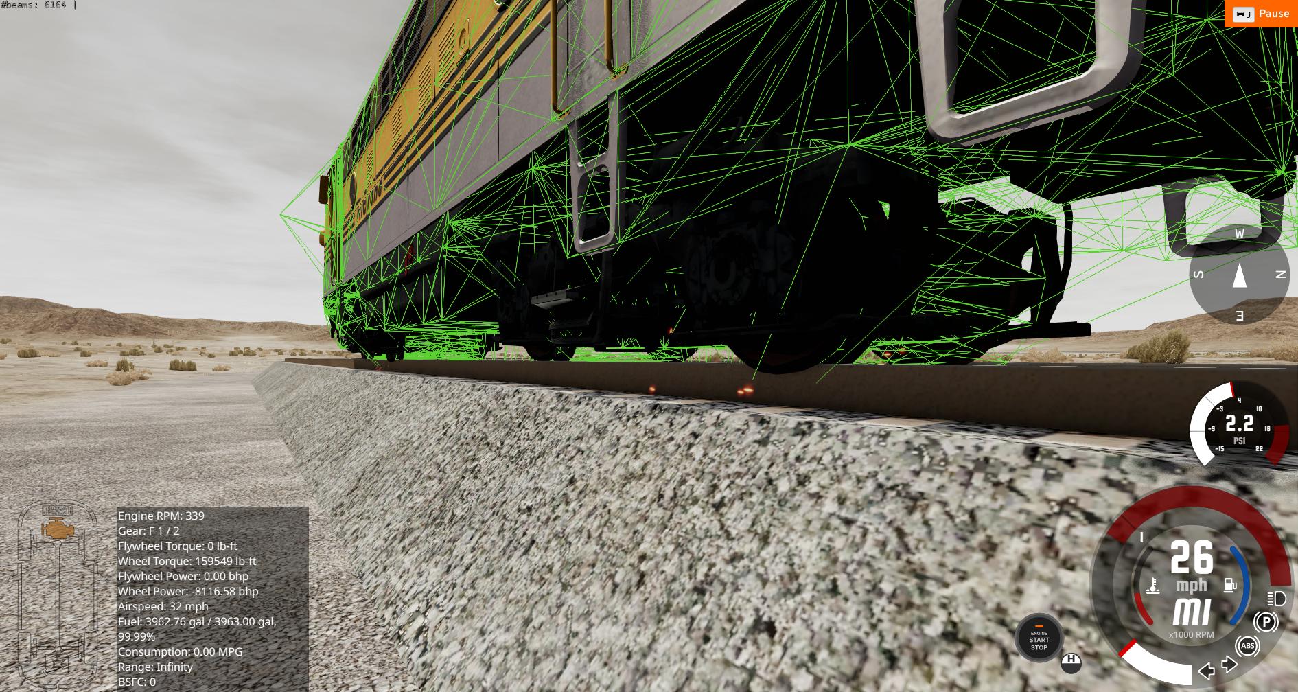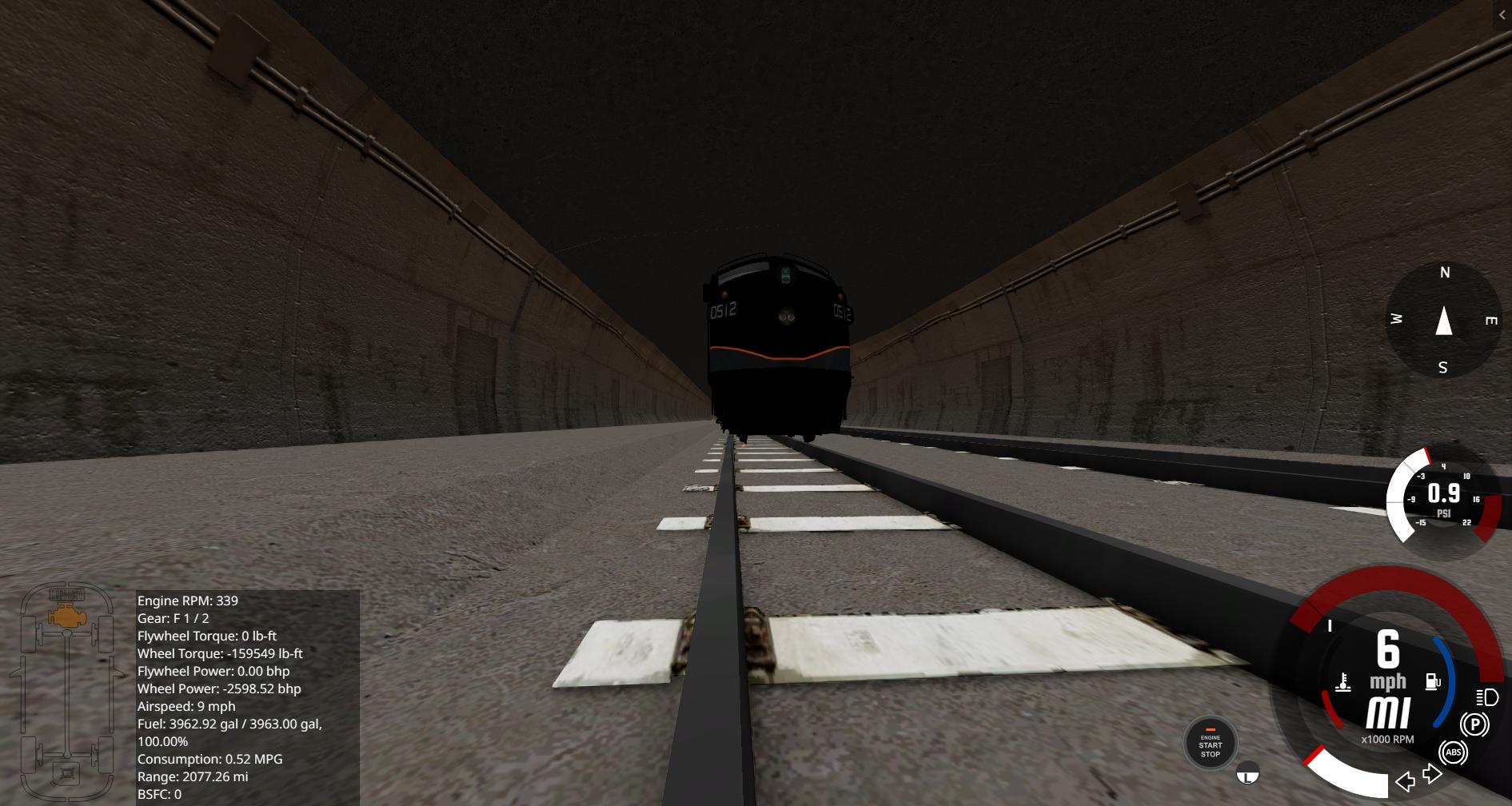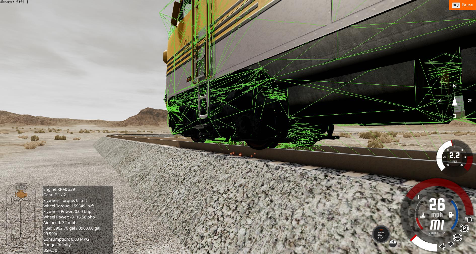 Looks like most of the suspension related problems are gone, great work. I tried the test version on a few maps with different tracks. Now it goes nicely over straight gaps, bumps and dips. Some slippage may happen after curves on not so well placed tracks. Usually it's the outer front wheel of the bogie that digs into the rail and stalls the speed. Here I was going backwards over a small rail step: This happens in Rocky Coast, Vapor, and Africa, all using the same rail parts. No problems at full speed on Sultan Peak's perfect tracks. No slips on Maseukowice's rather edgy railway loop or on the station junctions. Doesn't like Los Injurus track joints at all. Or the bends in River Highway. Just fix the oil starvation issue and the test version is good enough for release, if you ask me. Maybe there's some tweaking left, but so are in map makers' tracks and rail placement .