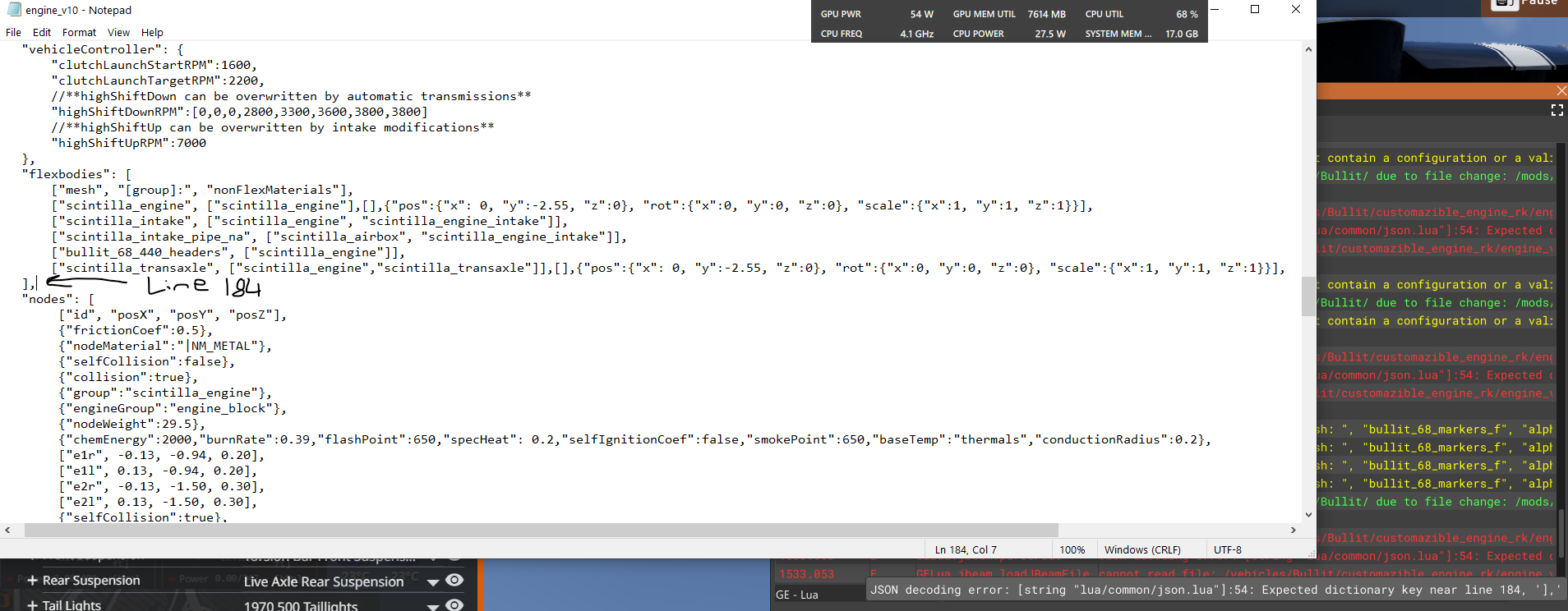 Been doing some messing about with rk's customizable engines and the bullit charger mod to use different engine models but when trying to rotate some of the models the console is constantly throwing up expected dictionary key near line x I haven't got a clue what a dictionary key is as I've been mostly copying in stock code but does anybody see the issue here? --- Post updated --- The engine block itself rotated fine and didnt throw up the issue but the transmission isnt a fan, the rest of the models and nodes can be ignored for now as I can sort them later