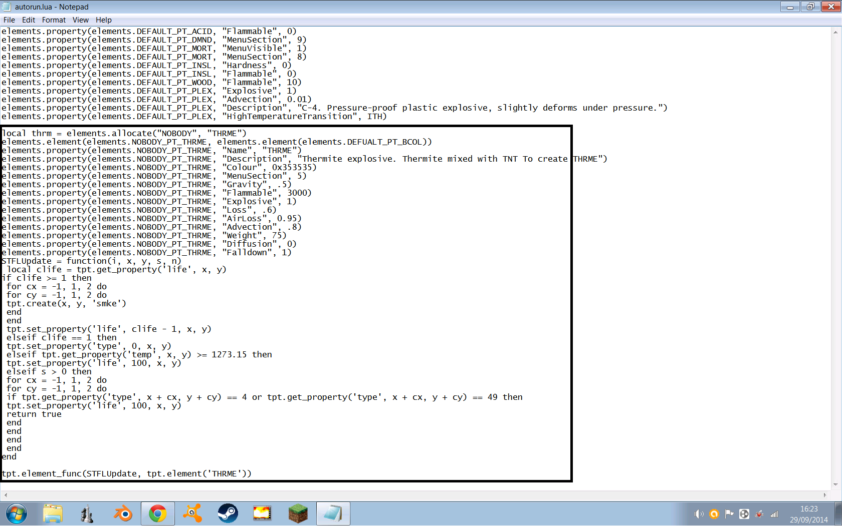 I need help from BlueScreen here since he Created a TPT mod, Anyway So i tried making my own element (If that goes well i may make a mod) But i am having an issue So i taught myself what code to use with BlueScreen's mod But When i run it i get this error The code i used Please help i am very confused.