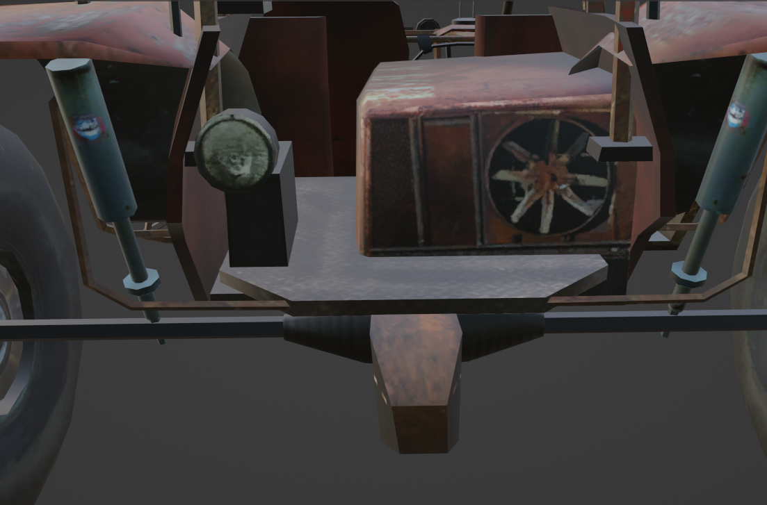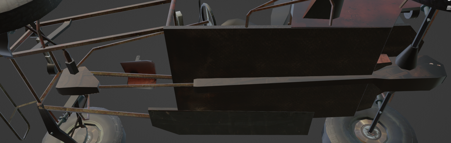 Since all of the parts are in, I am going to start working on the textures for the new skin. It will still be a worn look, but with much higher definition. I will be using the textures from the backyard kart as a base for the frame and floor since it has a decent setup node-wise for worn and painted metal.