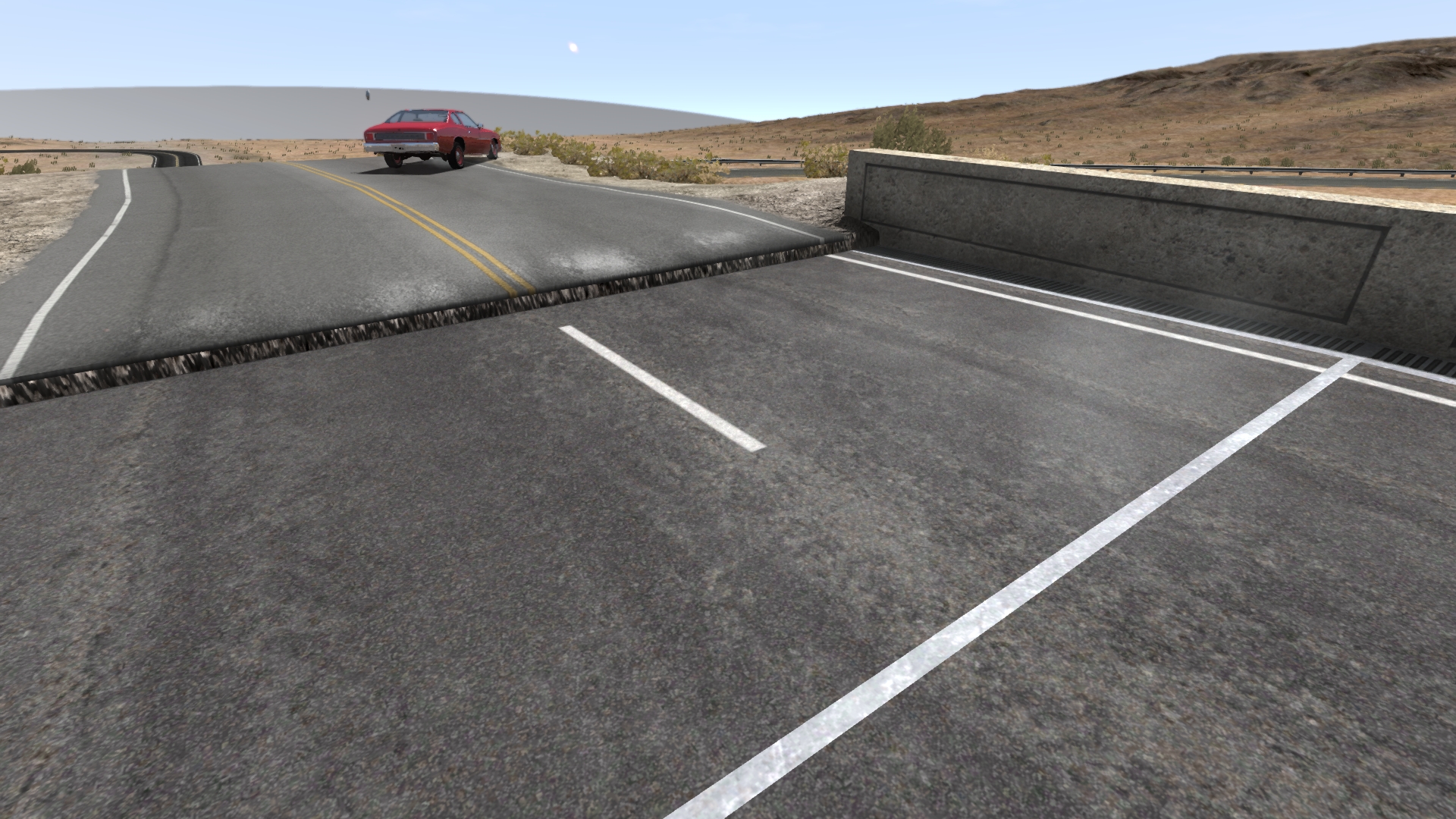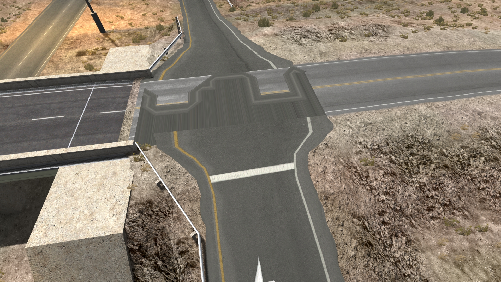 Edit, the pic of the 'newly paved' area keeps an older texture here (as in: it's in the last version of the map), I've banked this turn now too, in both directions. It flattened out as you got to the end, causing you to lose it as you crested the incline. Added a guide-rail in the center for crossover crash prevention (wait, did I just prevent crashes in a car accident sim?). Expect to feel the pavement changes, though the bump is very minor, it's there.