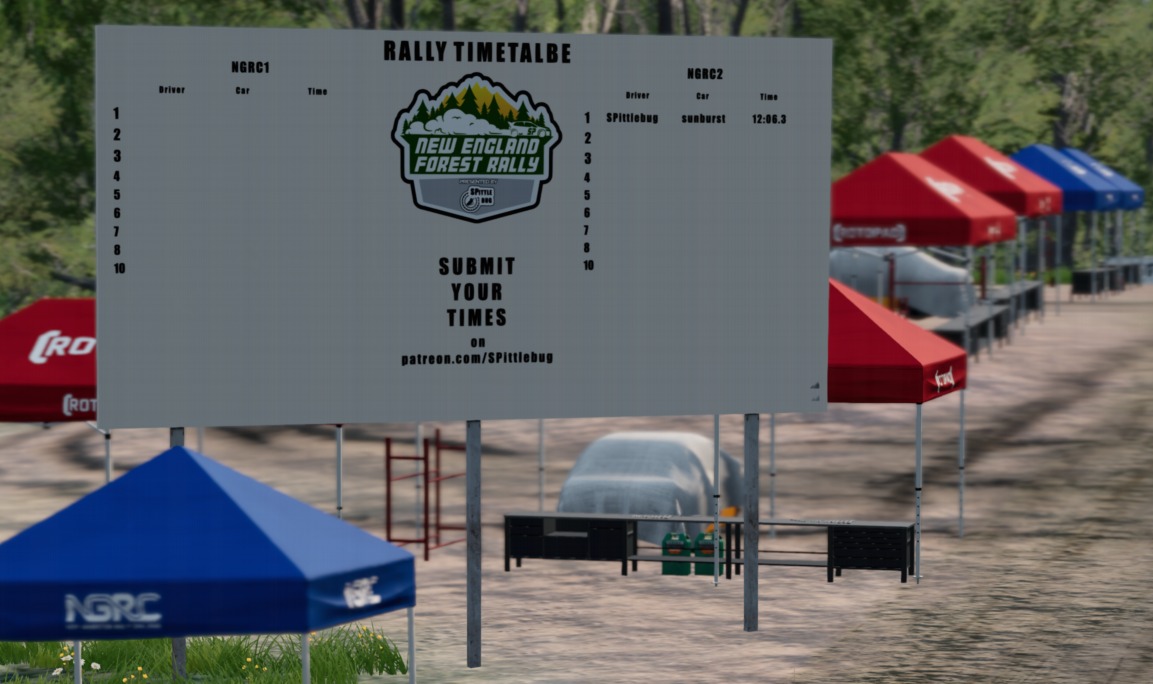 the map is now available on the repository: https://www.beamng.com/resources/new-england-forest-rally.36849/ if you have downloaded an older version of the map please delete it when you download the new on from the repo and clear your cache to make sure there are no conflicts! The SPittlebug Rally Challenge is now live! Get your times on the Leaderboards! The map and rally loops are completely free to play! Only paid Patreon membmers can submit their times to the leaderboards! Consider it as an admission ticket to the rally, and a nice way to support this project! There is a big leaderboard at the Service Park and smaller timeboards at the start and end of each stage. These will be updated at the end of each month, and competitors will get a deadline to submit their times. Find the rulebook and admission for the competition on patreon.com/SPittlebug