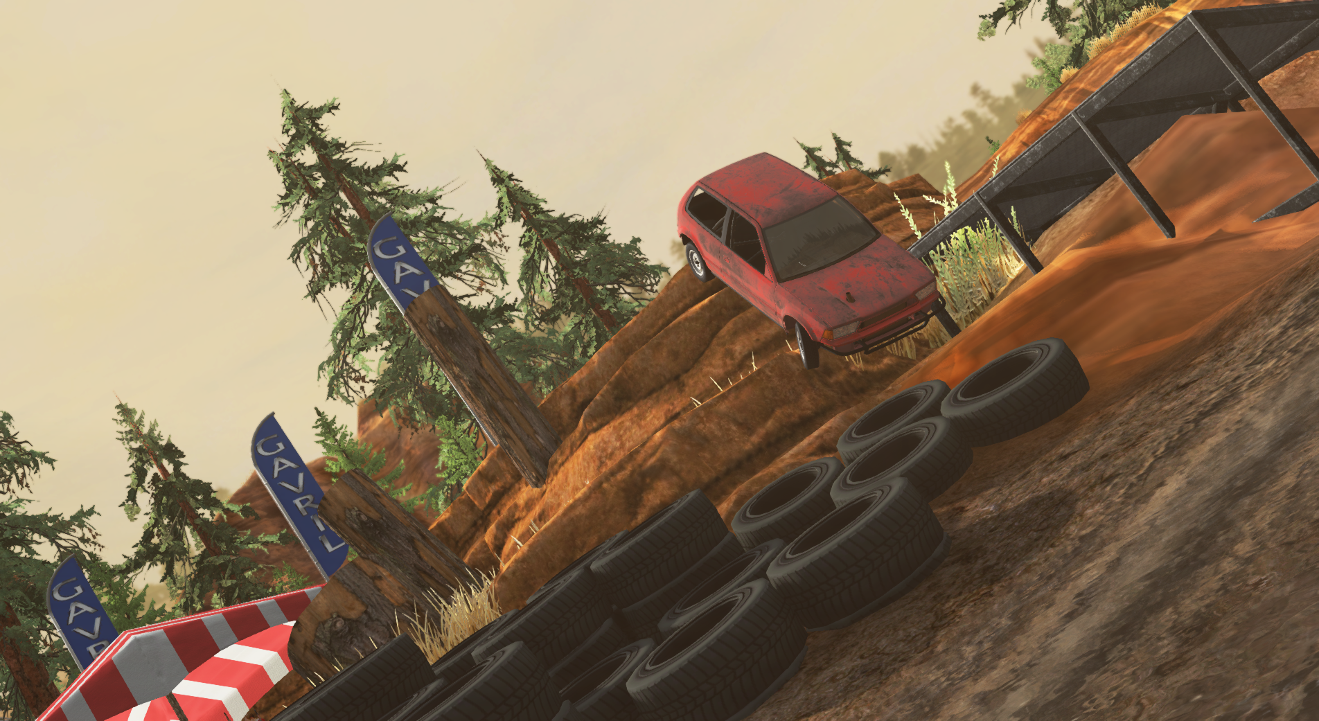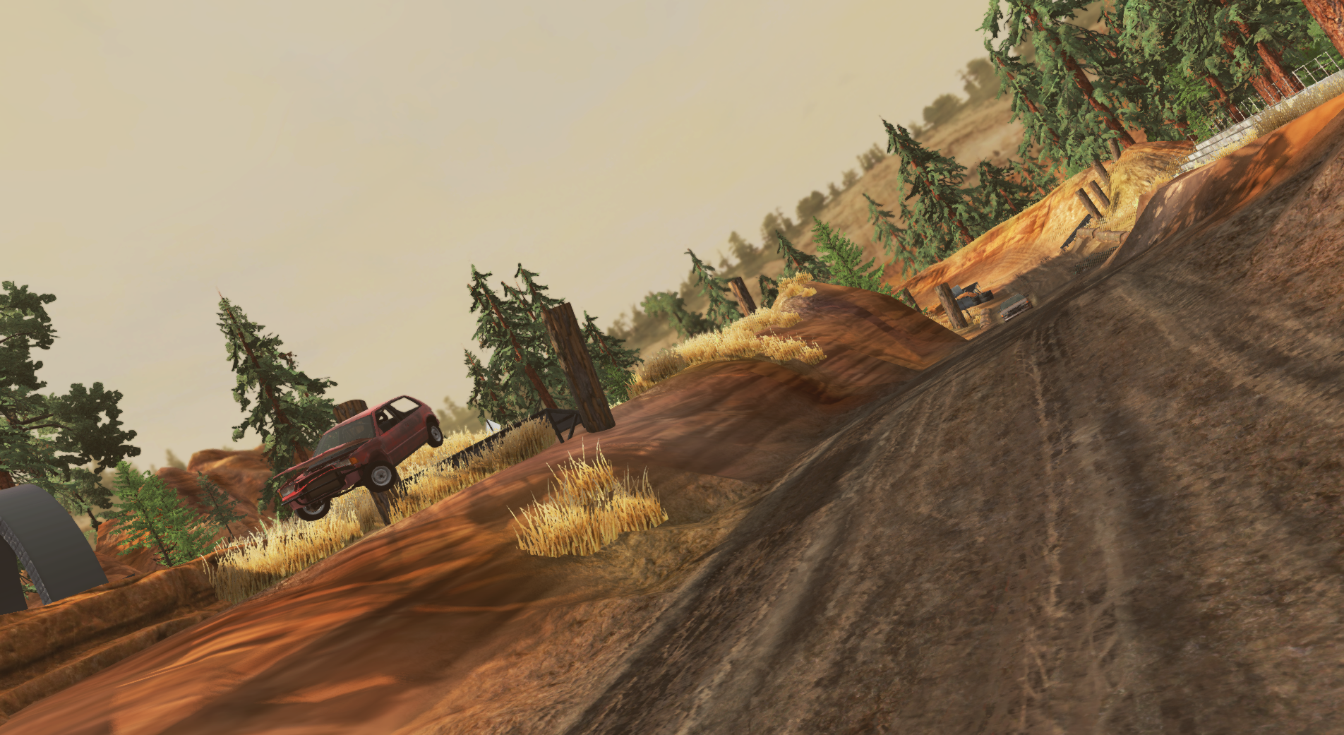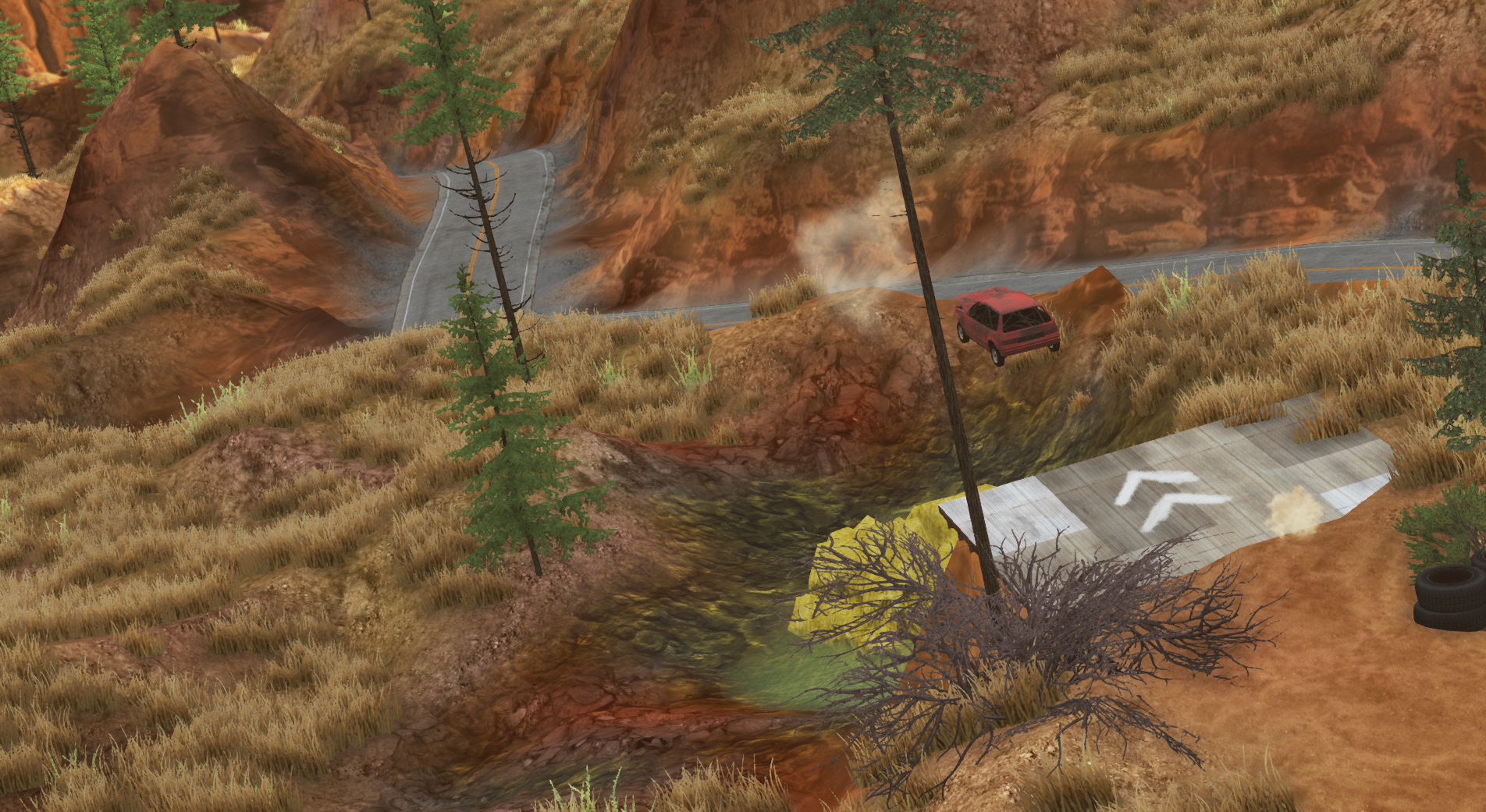 So I tried making a MotorStorm styled... oval track that actually works as intended. Faster, less nimble vehicles can take the embankment ramp and try to jump over some of the mud. Smaller, more nimble vehicles can either take the high and dry dirt path, or can take the inner embankment ramp and try to jump over the tires and onto the dirt path (a lot easier said), whereas the bigger jeeps and trucks can just plow through the sludge on the straight. and yes in the video I managed to lose to the AI I had just made for this track lol --- Post updated --- Oh and some more screenshots: