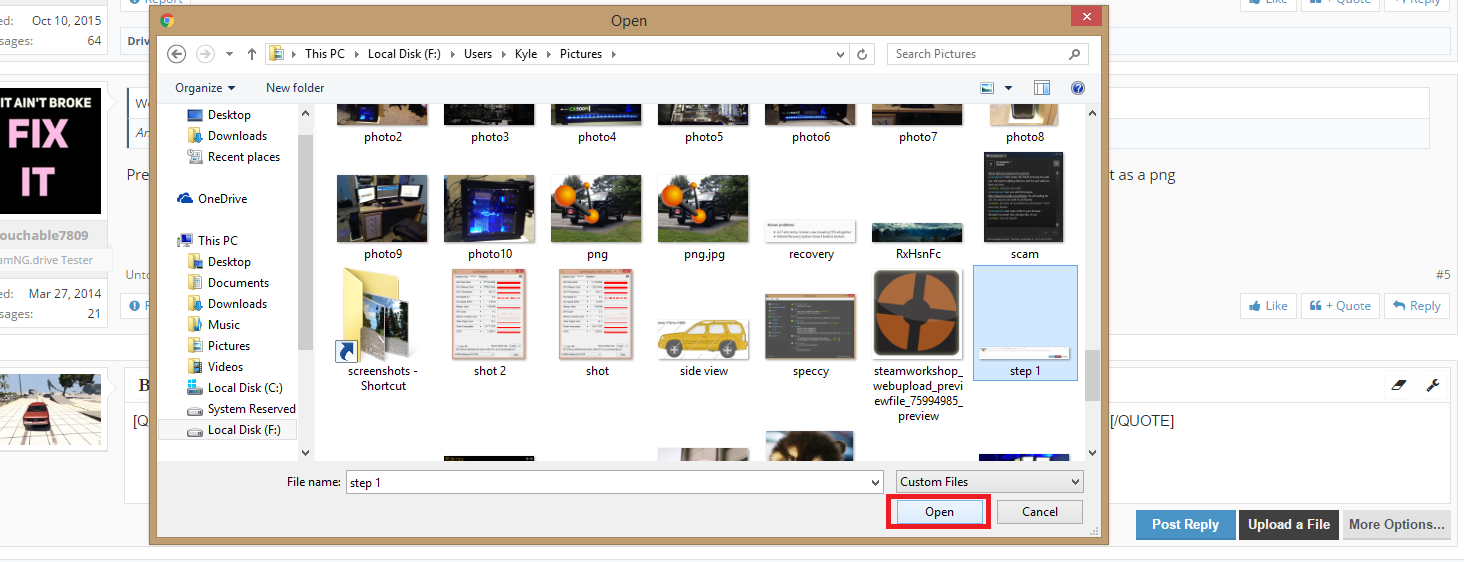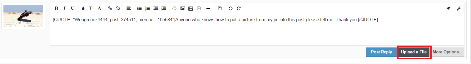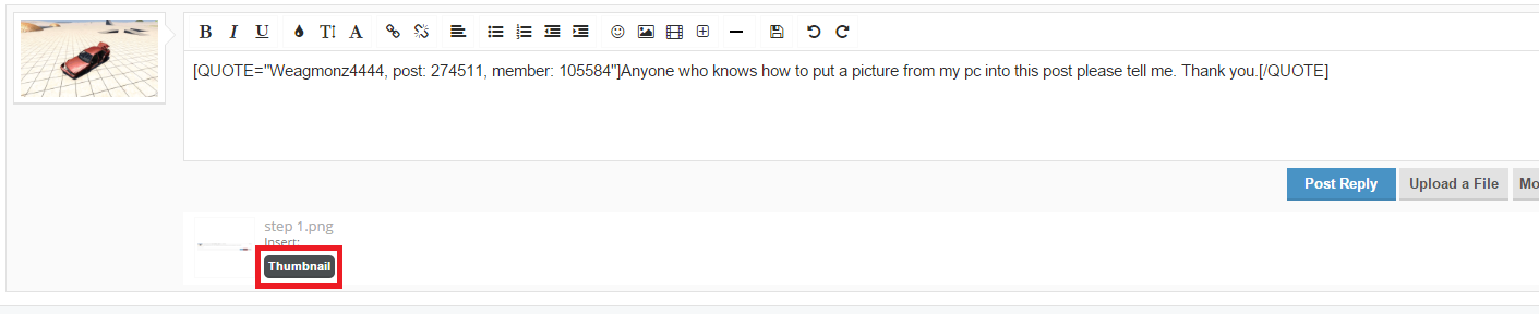 Click upload a file Find where you saved the picture. for me it F:/Users/Kyle/Pictures. Select it and click open. Click the "Thumbnail" button to add a thumbnail. All done!