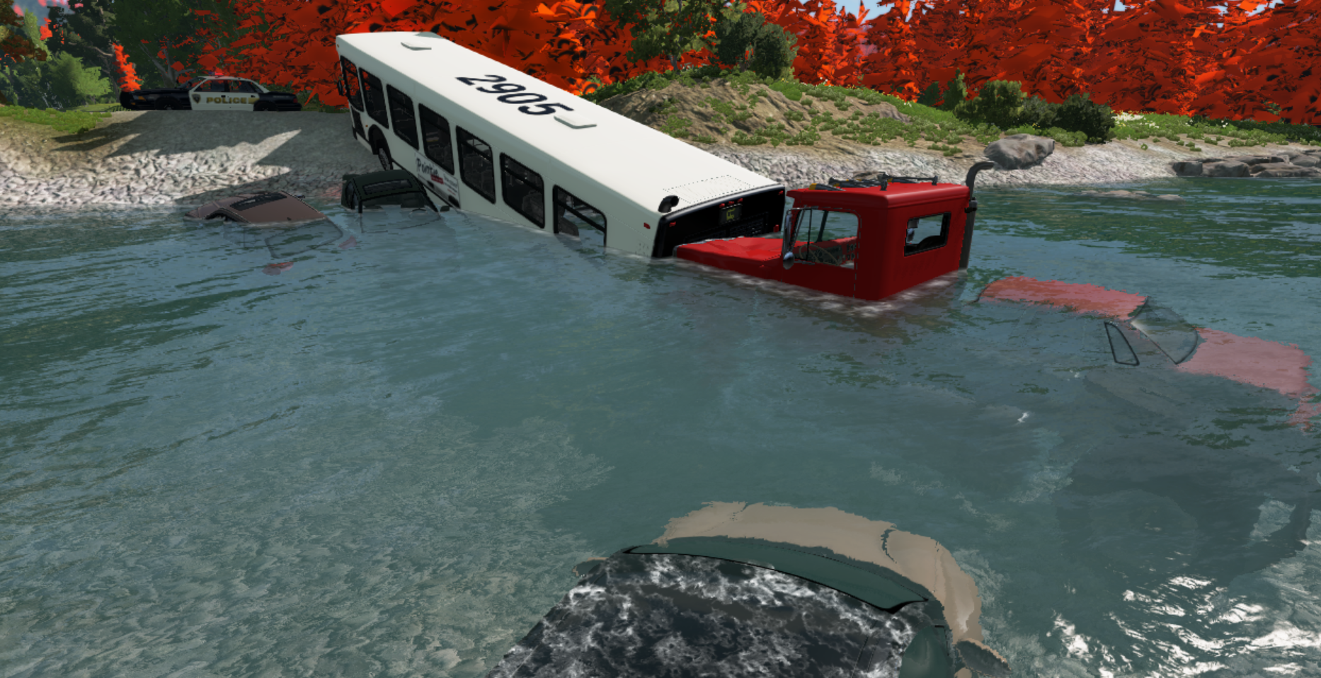 June 16th, 2020 Description: Multiple crashes due to high-speed driving at night on a road where a bridge was washed out after a major storm in Maine. Since it was night-time most of the victims couldn't see the vacant spot where the bridge was. The images shown were taken at 11:48 PM (11:48) the following morning. Injuries: 14 (5 of the 14 were bus passengers) Deaths: 5 (4 were drown victims, the other one died on the way to the hospital Map: East Coast, USA Vehicles: Gavril T-series, Wentward DT40L, Ibiushi Hopper, ETK 800, Cherrier FCV (Vivace), Hiroshi Sunburst Aftermath: The small town of the City of FIrwood ordered the road closed off by law enforcement until a new bridge was built, which was finished in October of that year. The survivors still suffer from emotional and some physical trauma to this day. The victims families are still being compensated, however, and this tragic event will not leave the hearts of local residents for many years afterwards.