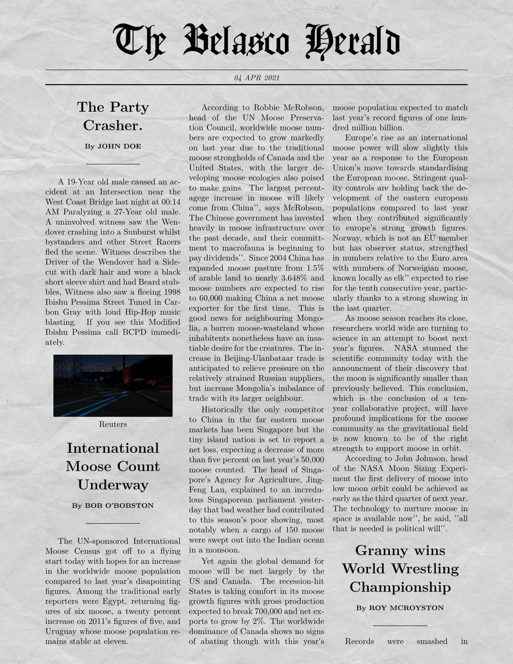 Case: Street racing gone wrong, 5th August 2017 at 00:14 AM Description Unnamed Teenagers were showing off and racing their tuned cars until a 19-Year old Male in a Tuned Soliad Wendover went too fast until crashing into a Hirochi Sunburst trying to drive home. Location: Intersection near the Bridge in Belasco City, USA. Cars: 1994 Soliad Wendover Street Tuned, 2011 Hirochi Sunburst 2.0 Sport 2003 Gavril Roamer LXT 4WD (Uninvolved Witness) Injuries: Sunburst driver: Became paralyzed and had a broken left arm. Wendover driver: No serious injuries thanks to the Airbag. Aftermath: Sunburst driver became Wheelchair-bound and the Wendover driver got sentenced to 90 Days in Jail for Illegal Street racing. BCPD investigated the Wendover and the Wendover had records from 2015 but this time the Wendover driver didn´t get lucky and made headlines in the news instead of getting away with Street racing, the Wendover and the Sunburst were parted out and then scrapped. Photos: (Don´t mind the current date i could not change that) Newspaper headline made with: https://newspaper.jaguarpaw.co.uk/