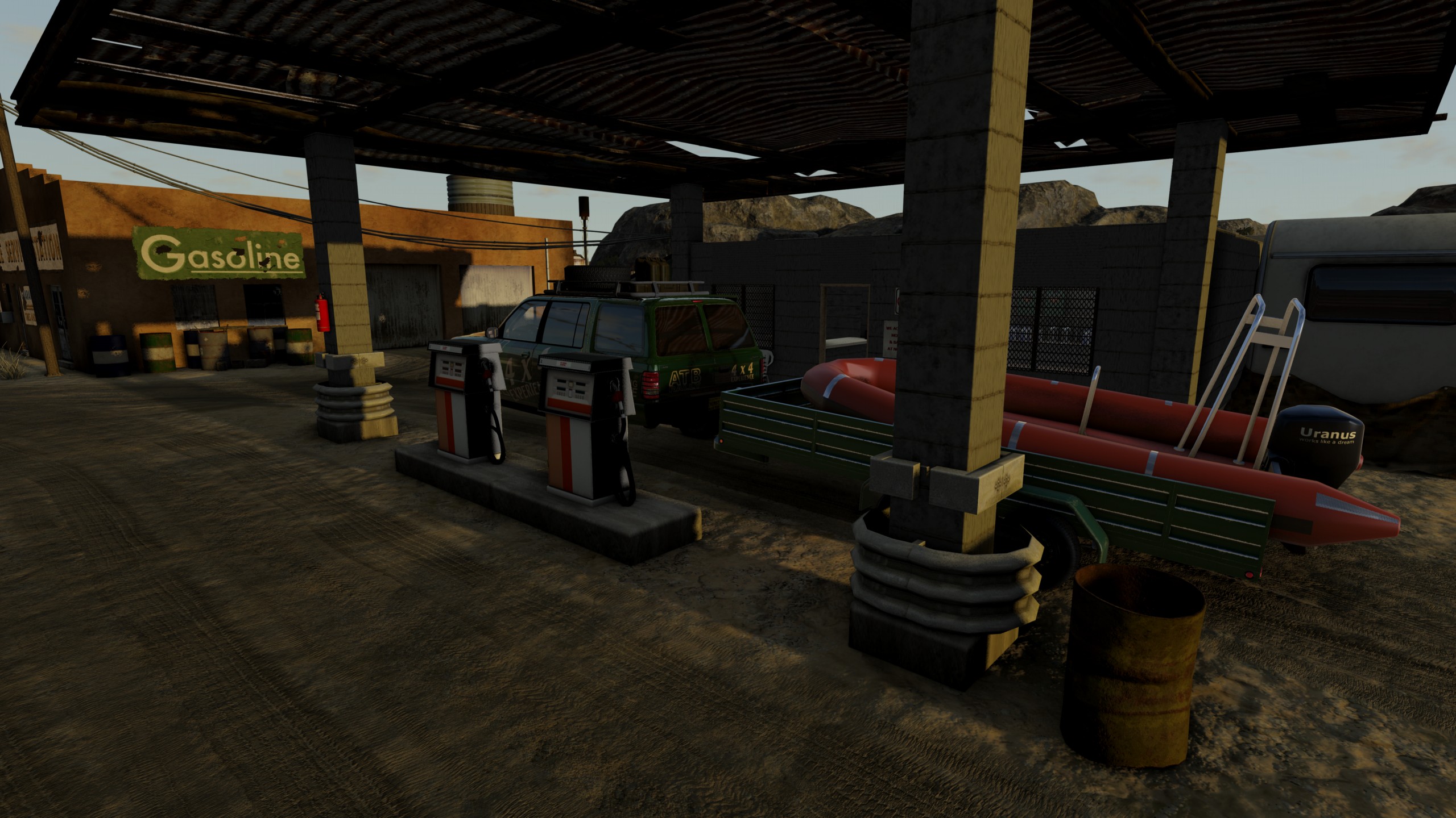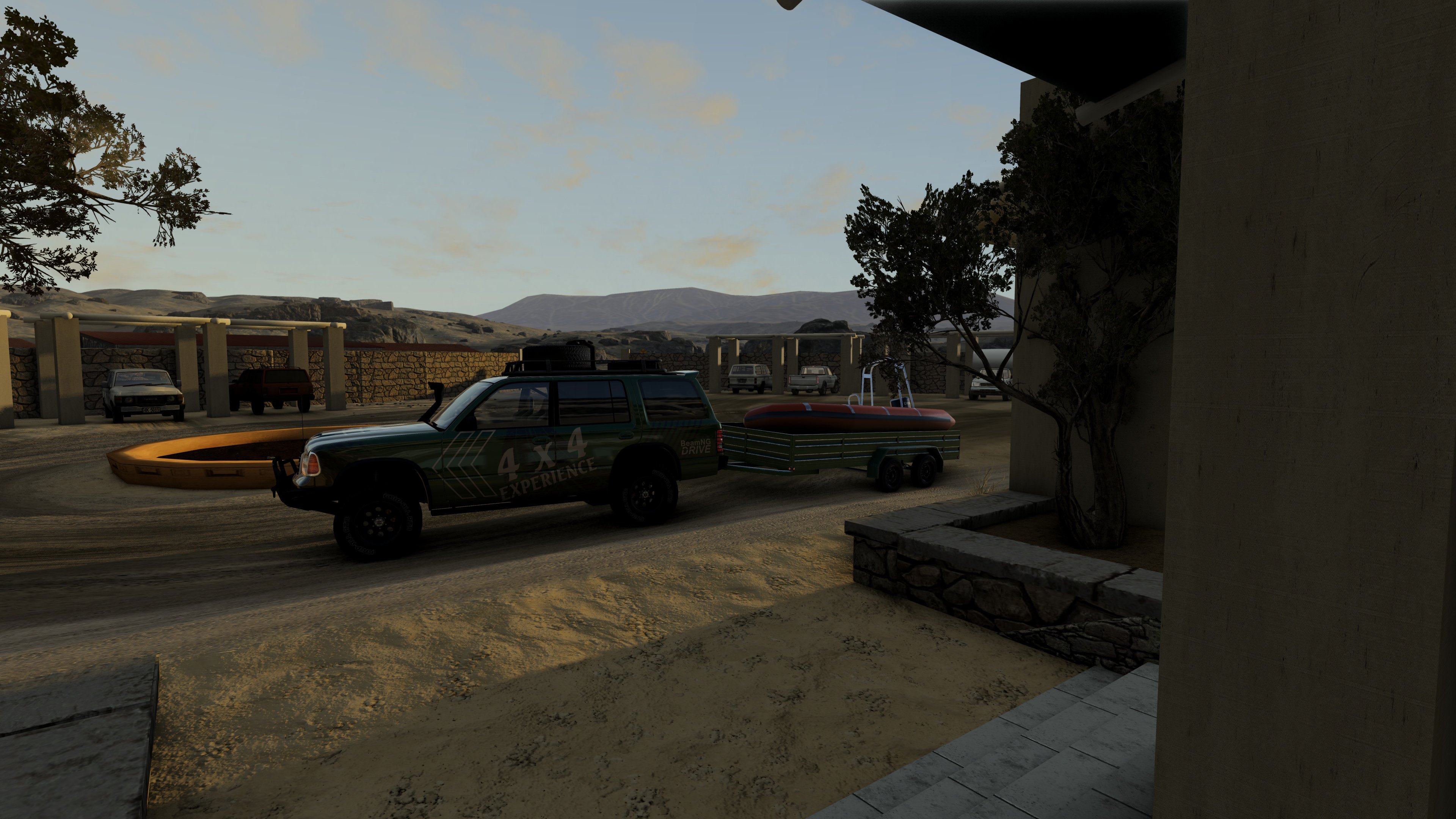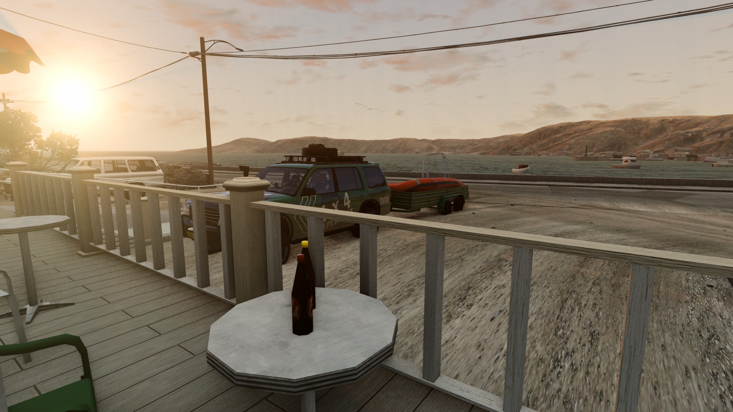 New day, new testing, Get up early, I wanted to the beach, stayed in Desert Lodge, and wanted to Vogelsang for some fun. So loaded the boat on the trailer, and there we go. Needed some petrol, and then went to the beach. Had some fun with the boat, did some shoping, and at the end of the day, it was time for some beer. See the Pictures. PS rescue boat by Fun PHysics https://www.beamng.com/threads/rescue-boat.91276/