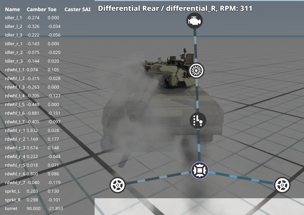 Please include the wheel debug and powertrain visualization, when steering. It might cause by glitchy sprocket. I moved it's location slightly so it won't phase through the track, but it caused additional problem of the output power. That's the reason I pause this mod's development. If you are unable to position the individual track part without breaking the tank, don't do it, not worth time. EDIT: I remembered that I moved the left sprocket and partial track. This makes the track shorter and affects steering. The right track hasn't been moved. The problem is the left track is often unstable(crunching sounds, glitchiness, instability), so I remembered why I lost the motivation.