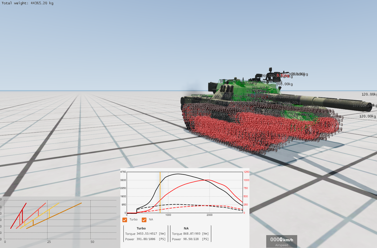 I have completely redone the torque curve and transmission because the old one was ridiculously overpowered, I also lowered down the weight to a sensible value (mainly sprocket weights which were 1000+kg each instead of 50...) And returned original models and textures for the wheels, instead of the basic looking ones. These look way better. But I have a problem with the gear ratios, currently I can't find any accurate info about them so I'm using the Wentward ones temporatrily, but with these the tank can barely reach 18 km/h and irl it should reach around 30, can anyone find any info about the real life gear ratios? It's extremely hard to find balance between having enough torque to move and having good top speed.