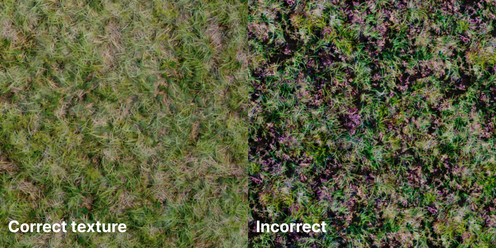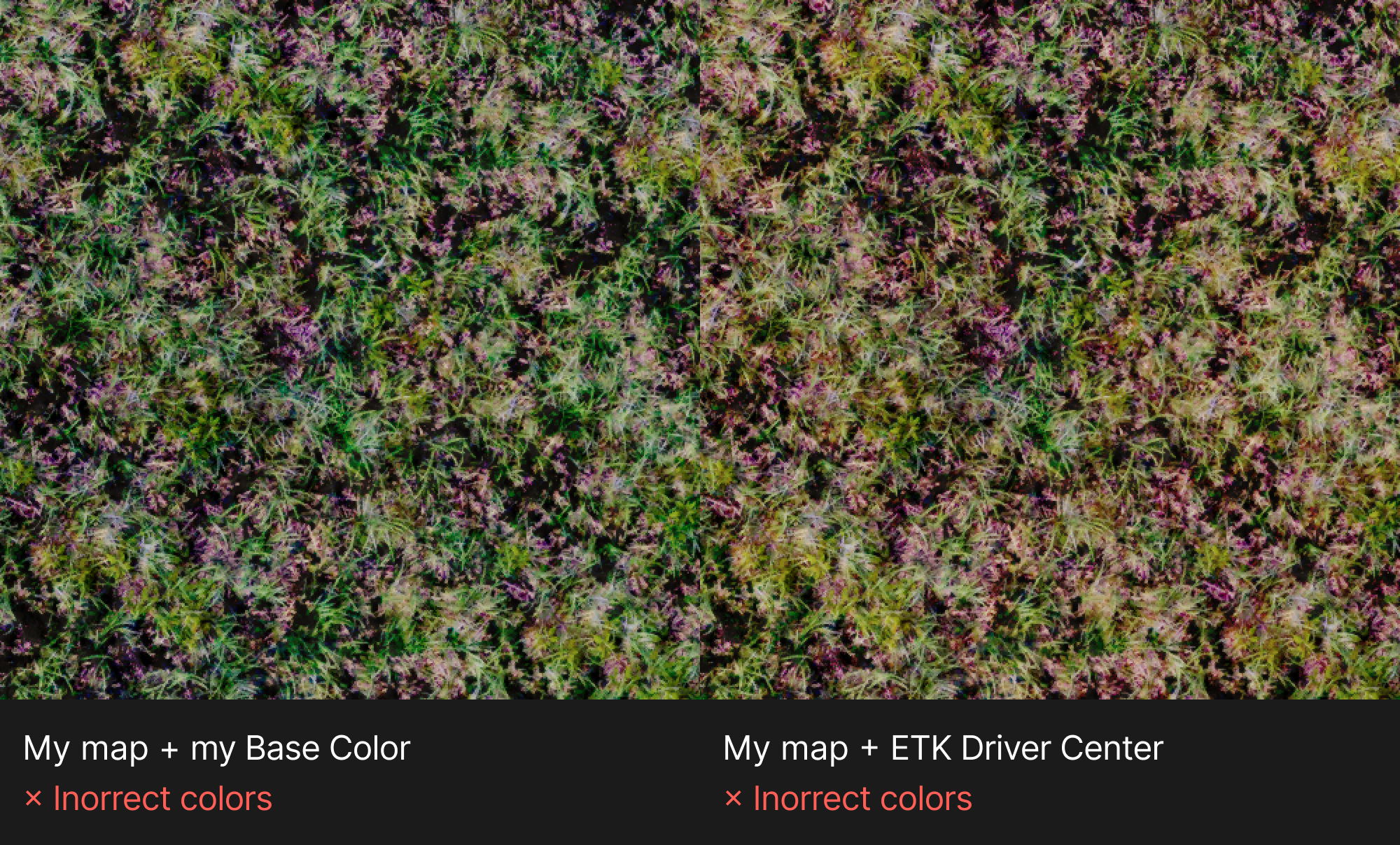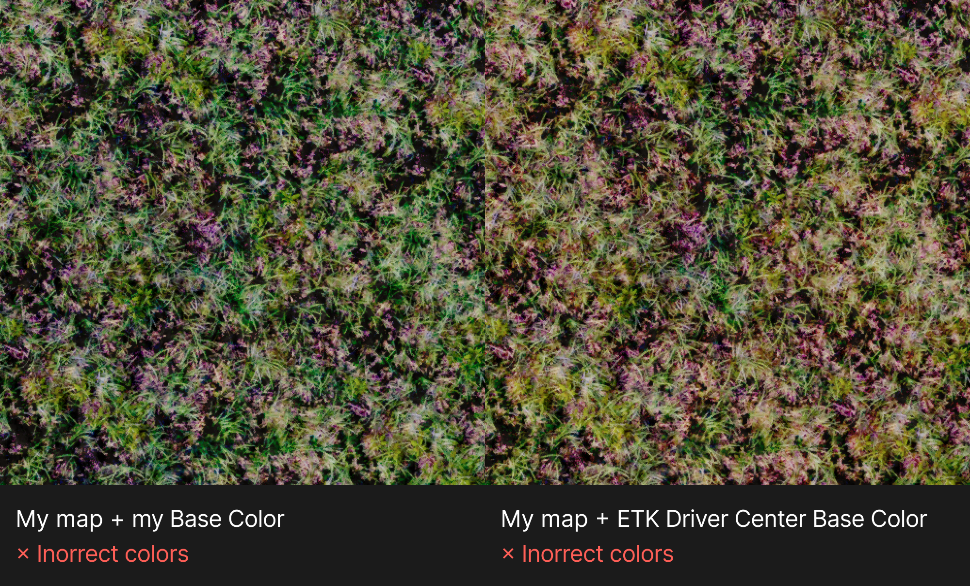 Hi! I have a problem with color rendering of terrain textures. Dark areas become too dark, and go into purple. What causes this error? On the left is how it should be. This is a screenshot from ETK Driver Experience Center, texture Grass2, file t_grass1_b.png in Base Color. On the right is my level with textures from the developers. The texture has increased contrast, and the dark areas have become even darker, and have gone purple. I tried loading Base Color from my level in the ETK Driver Experience Center. Everything was fine. I tried the opposite. I loaded the standard files into my level. The error still there. Perhaps the issue is with the level file itself, not the textures. I also checked the Template Map source level that is built into the game. There is an error in it too! Does anybody know, what causes the problem? Can I fix it tn the level itself?