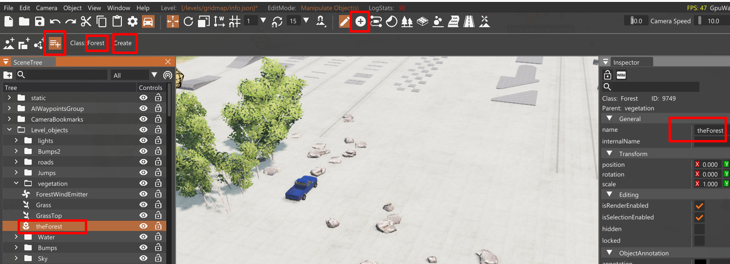 1. Go to the toolbar, press create button 2. Choose Other classes 4th button in create toolbar 3. Choose Forest class to create 4. Make sure you are in a group in scene tree, select a group name 5. Press Create button to create the Forest class 6. Name it theForest in the inspector, for convenience 7. Reload lua Ctrl+L (this will initialize forest editor with the new forest object) 8. Try to paint forest items We will change this, so when one tries to use any forest tools, will check if there is a forest object, if not it will automatically create one in the main mission group.
