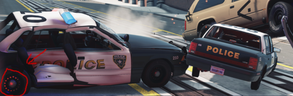 If you notice, there is tyre smoke in the back and whole side of the police car is smashed. So it looks more like it has been hit and this caused that tyre to pop. If you really want to know it's this forum...