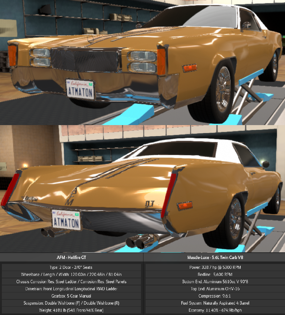 The 1974 AFM Hellfire GT was a combination of Muscle and Luxury aimed to please those who wanted something along the lines of a Moonhawk Sport or Barstow Roadsport but was so old and brittle that trying to turn the steering wheel without power steering would be enough to dislocate their hand or break their wrist. Powered by the 329hp Twin Carb 5.6L V8 dubbed the "Muscle-Luxe" coupled to a 5 speed manual transmission that shifts as smooth as silk and has a clutch as light as a feather. This Gold and White 4200 pound steel rectangle may be slower then a tuned Covet, but the person behind the wheel will probably be happy with the fact that they can go over 100mph one last time before being put into the back of a Eulogy.