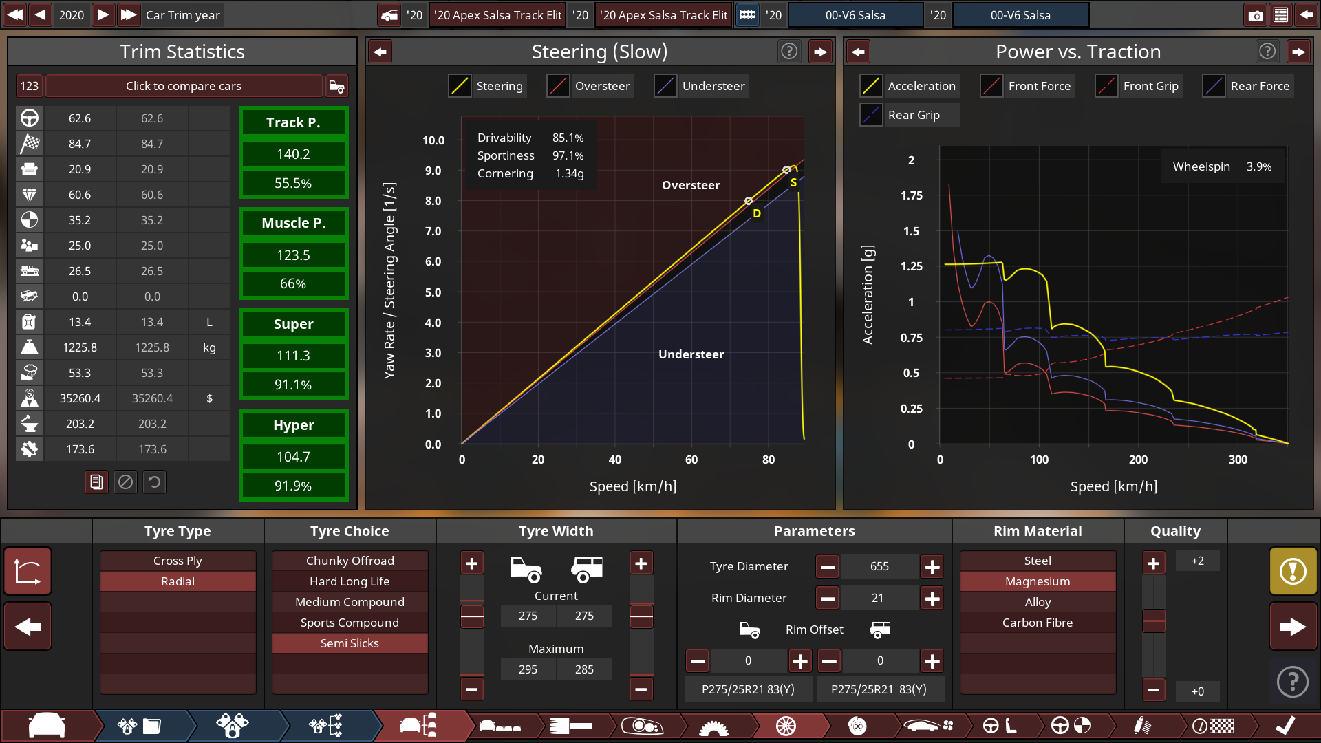 Well, after 6 iterations and a few sleepless nights, I think I've extracted literally every bit of performance I can, from the Salsa. To say the task was a challenge, is a severe understatement. The car itself is a product of a challenge between myself and @TheCrySick, on who can finish the 82km time trial on the American Road map the fastest.