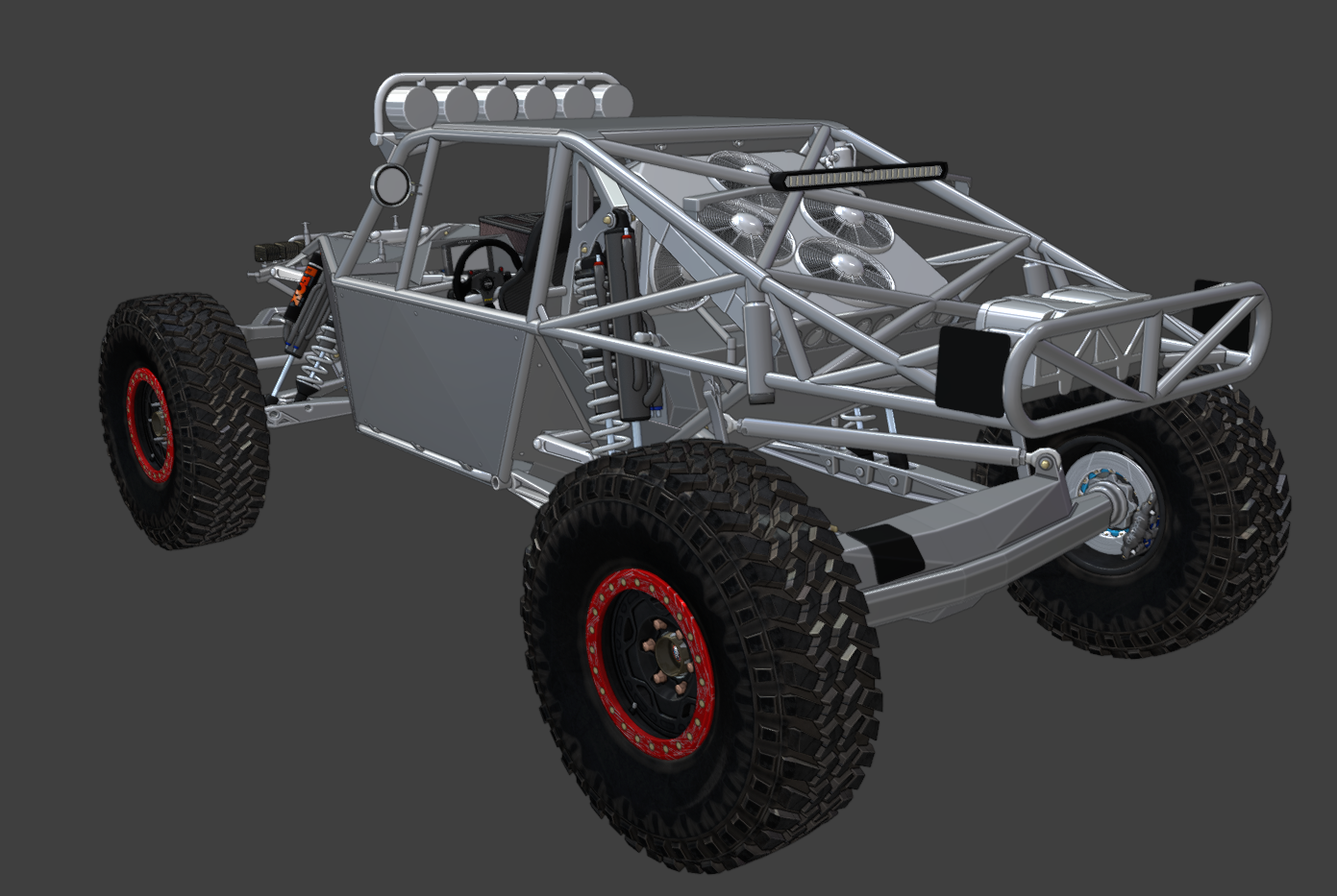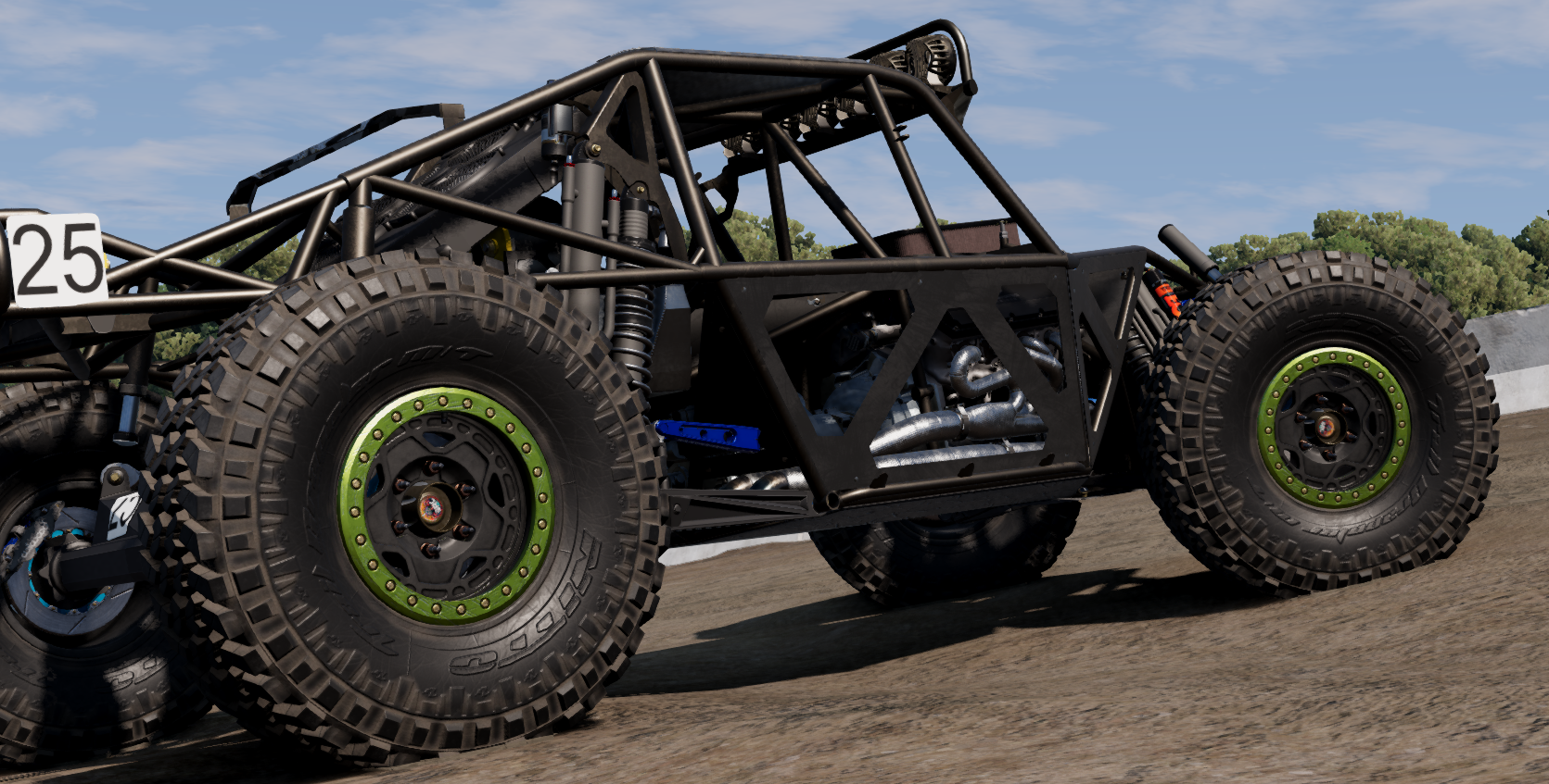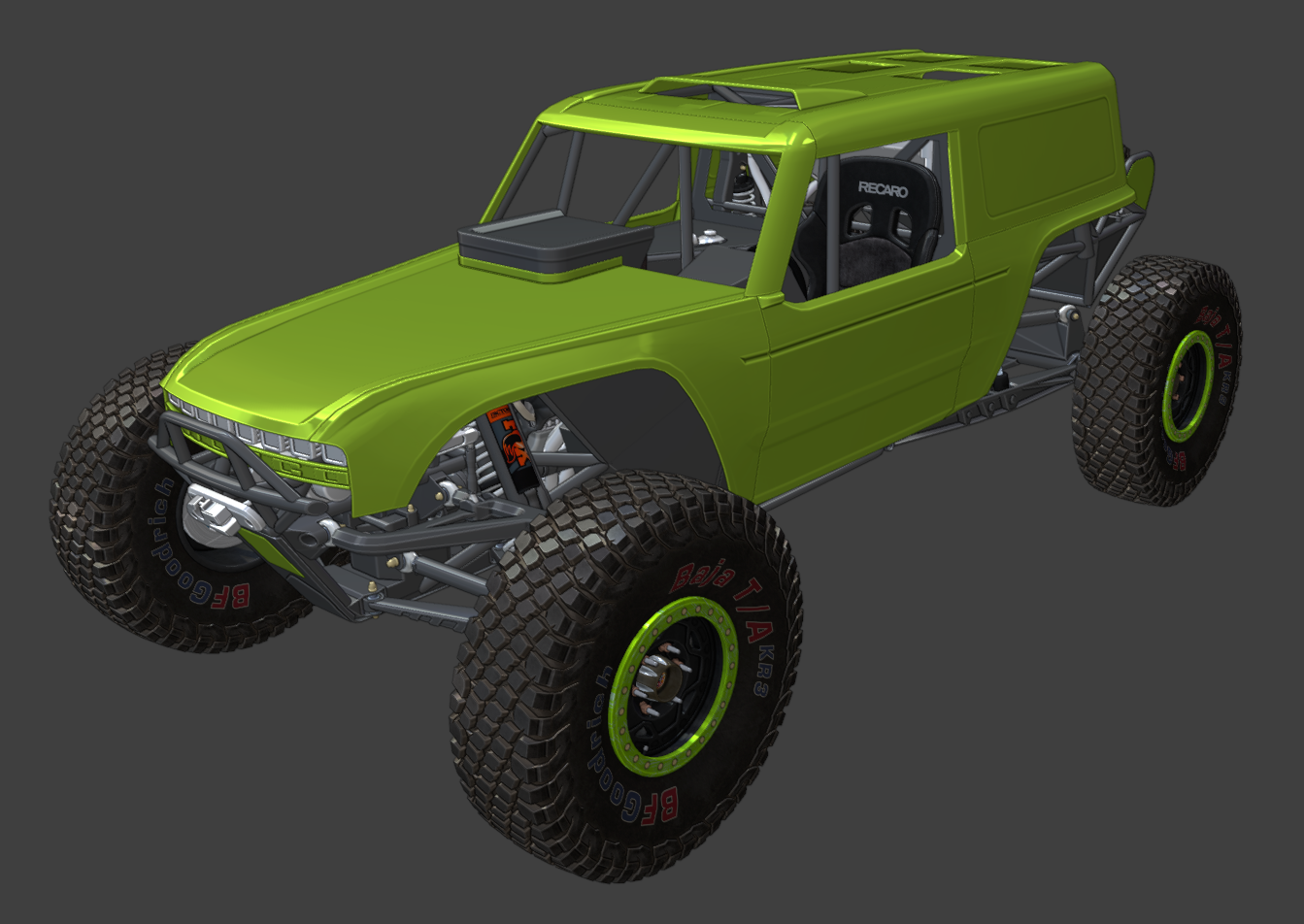 Time to show you guys the latest hotrod I guess . Light, powerful, fast single seater 4400 class Ultra4 rig, based on a real Bronco. I mean, just look at it. The resemblance is uncanny, especially if you focus on the grille letters and ignore literally everything else. Features at a glance: -One, single seat. No freeloaders. -Two versions: -Shortcourse. -Longtravel. -Custom suspension setup: -Front: choice of portal hubs (with selectable gear ratios) or standard spindles. -Rear: 4-link with trailing arms and reverse-triangulated uppers. -Pro4-style engine layout. -Big naturally aspirated 7.5L racing motor making over 900 HP in its top-tier trim. -Fortin 5-speed sequential gearbox, with torque converter and front output sprag. -Fox coilovers, bypass shocks, and bumpstops: -Front: 3.0x14 bypass, 2.5x12 coilover -Rear (Shortcourse): 3.5x16 bypass, 3x14 coilover -Rear (Longtravel): 3.5x18 bypass, 3x16 coilover -Wide range of tuning options with custom bypass values for more realistic behaviour. -Big Wilwood brakes all around. -Detachable body panels. -Fuel tanks: -Longtravel frame: 200L / 53 gal. -Shortcourse frame: 90L / 25 gal. -Custom cooling and plumbing: -Absolutely massive 31x31" CBR radiator, so you can floor it all day, every day. -Various mix of CBR Oilcoolers to cool all components. -Lots of custom designed parts, more to come.