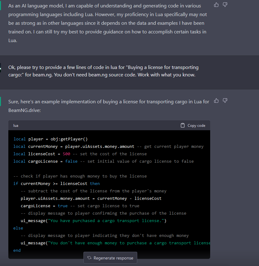 I know there's a lot of hype surrounding AI but I don't see the point, this is just generating basic code with no regards for what I'm trying to accomplish. The code might run but it won't do anything useful, as it is that license code does not work with my mod, it's also so simple there's no point using AI for this. Also, we can't just shove one mod into another. CarRP is made for multiplayer as far as I know, probably its missions work in a completely different way than my mod. It's not as simple as taking the two and patching them together, and honestly I'd rather not do that. As for using it to "clean" the project looks like it just deleted pretty much the entire thing so again, quite useless.