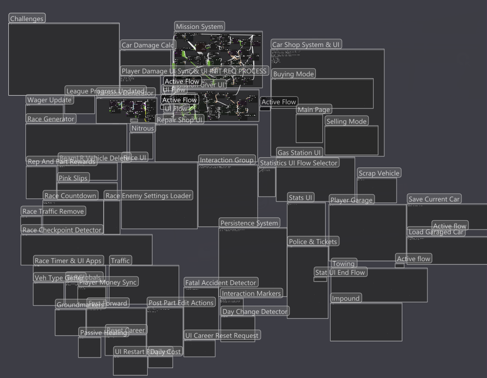 Yeah I can totally understand that lol, I gave up organizing pretty quickly seeing the framerate dropping. Keeping everything as compact as possible with no regard for flow is so I can link stuff without using the window edge camera panning which is impossible to control at low FPS. The other solution is to bring all nodes you want to link in the same area to add stuff but that takes a while too. The editor has other bugs as well, hidden links seem to prevent right clicking to add new nodes in random areas of the graph, sometimes flow would just stop at "bundles" (simple flow in, flow out node to help organize everything) until I relink them. Storing as many variables as possible in a lua table helps because using getter/setter nodes just adds to the editor FPS drop.