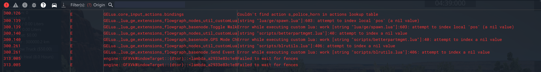 Tried with ZERO MODS and a clean user folder, clean beamlr I still get the camera bug I'll post a full log next time, here's the only console error codes clean career reset. I buy a car, change to it, get out, get in, scrap it while inside and I get the camera bug. The first person walk model is seen from my perspective.