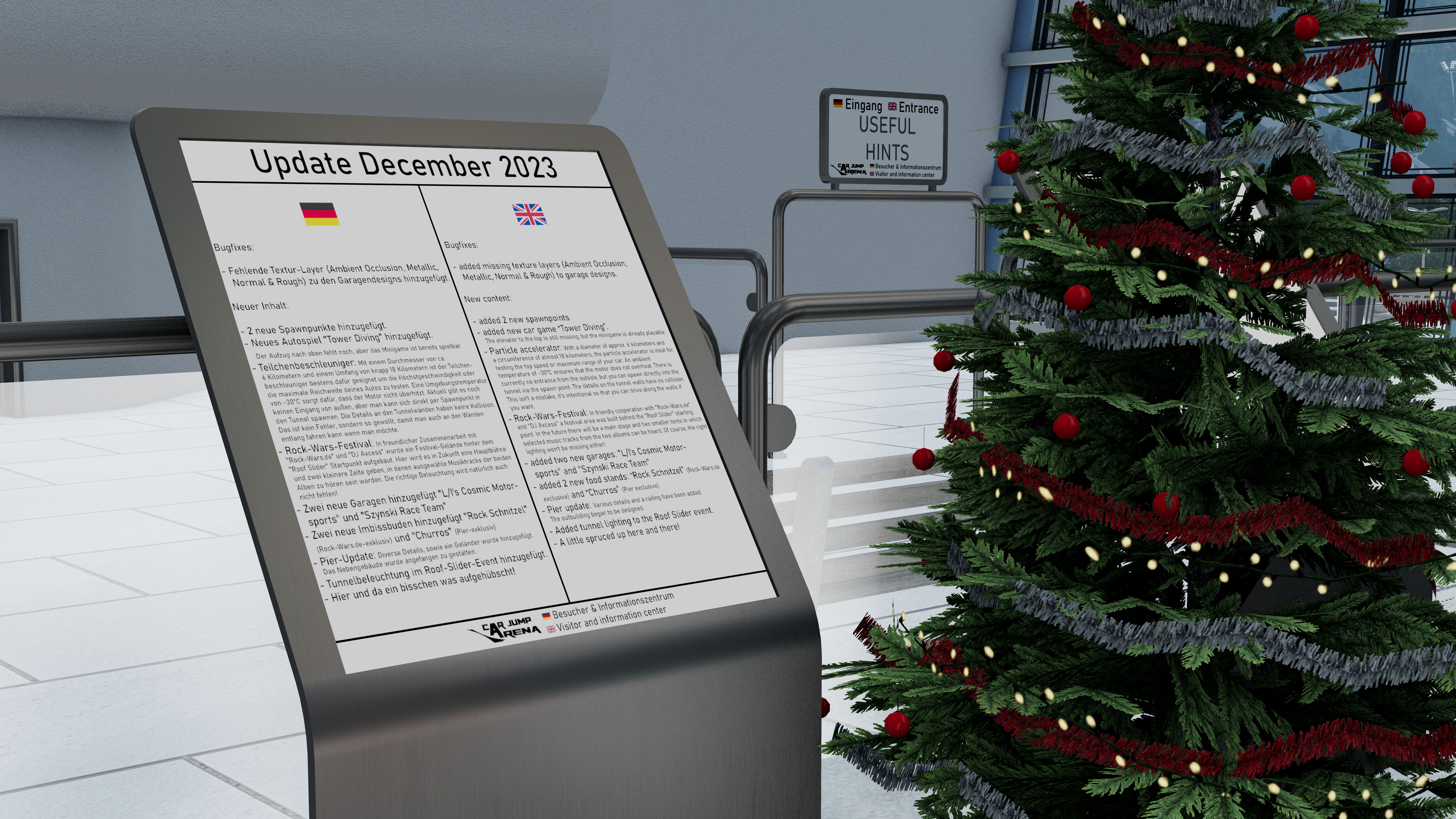 OUT NOW Update December 2023 (v2312): Bugfixes: added missing texture layers (Ambient Occlusion, Metallic, Normal & Rough) to garage designs. New Content: added 2 new spawnpoints. added new car game “Tower Diving”. The elevator to the top is still missing, but the minigame is already playable. added new car game "Particle Accelerator". Rock-Wars-Festival: In friendly cooperation with "Rock-Wars.de" and "DJ Axcess" a festival area was built behind the "Roof Slider" starting point. In the future there will be a main stage and two smaller tents in which selected music tracks from the two albums can be heard. Of course, the right lighting won't be missing either! added 3 new garages: "L/I's Cosmic Motorsports", "Szynski Race Team" and „Tom B. Morrissey“ added 2 new food stands: “Rock Schnitzel” (Rock-Wars.de exclusive) and “Churros” (Pier exclusive) Pier update: Various details and a railing have been added. The outbuilding began to be designed. added tunnel lighting to the Roof Slider event. A little spruced up here and there! Please make sure to clear your cache before installing the new december update! >> Download << If you like my map...please don't forget to rate 5 stars @ GumRoad! If you don't like the map, talk to me so I can improve it!
