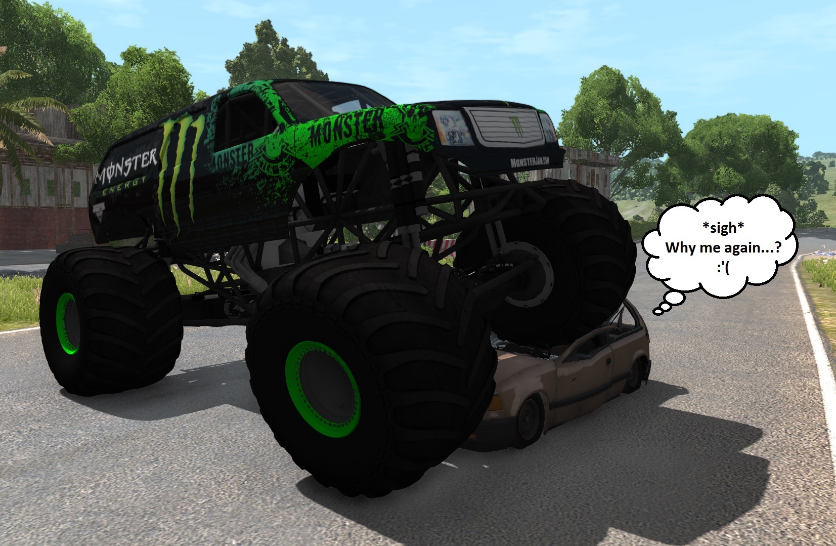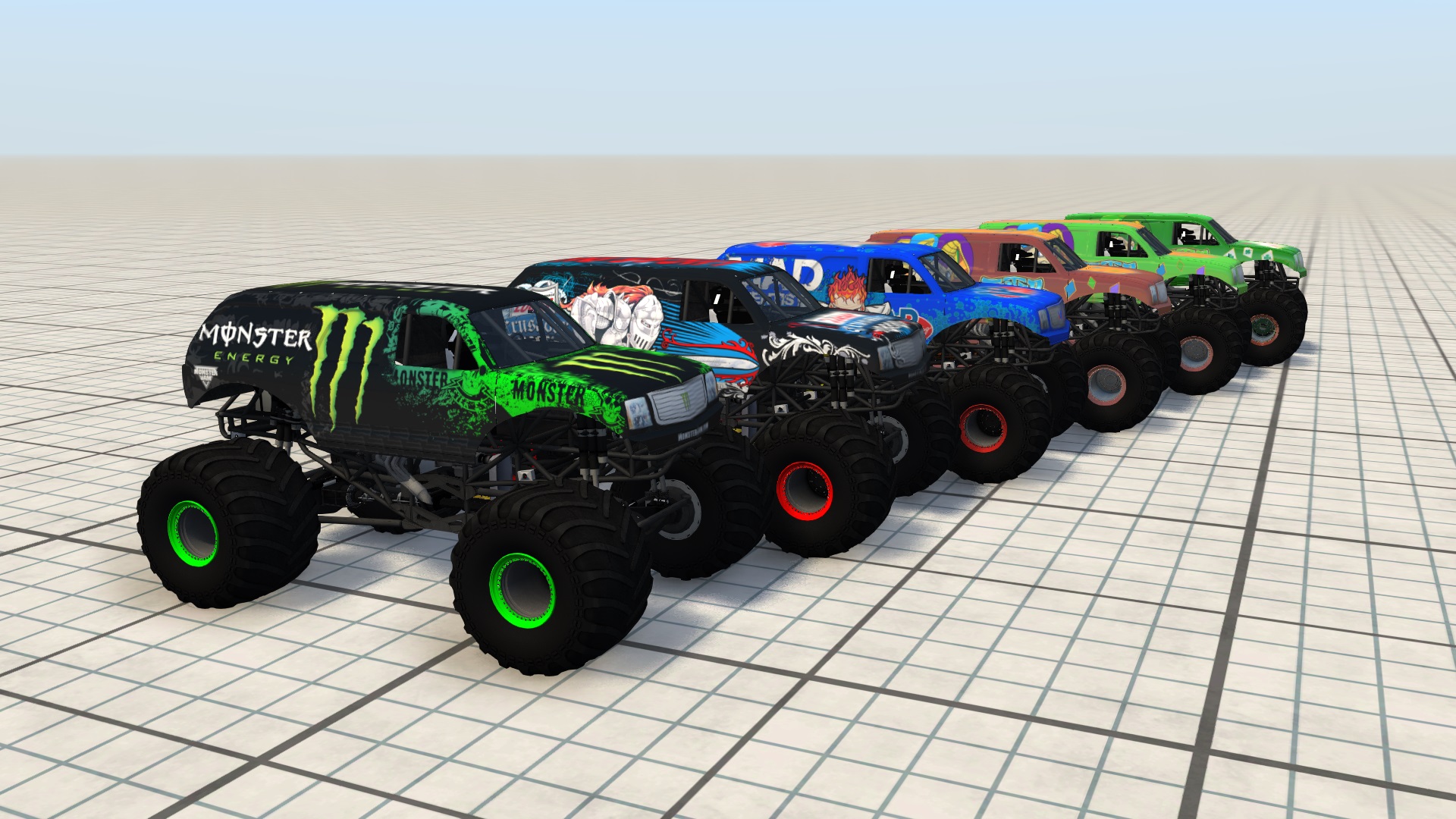 I redesigned the textures for both Monster Energy and Lucas Oil Crusader from scratch. The existing ones available on SM couldn't match the body mesh perfectly - they were too narrow to wrap up the body correctly, and it kinda showed upfront - so I simply went and remade them using @ROCKGODBOSS' awesome template as a reference (just saved the original grille and headlights design, for consistency) That's the final result of a sleepless night, glad you like it.