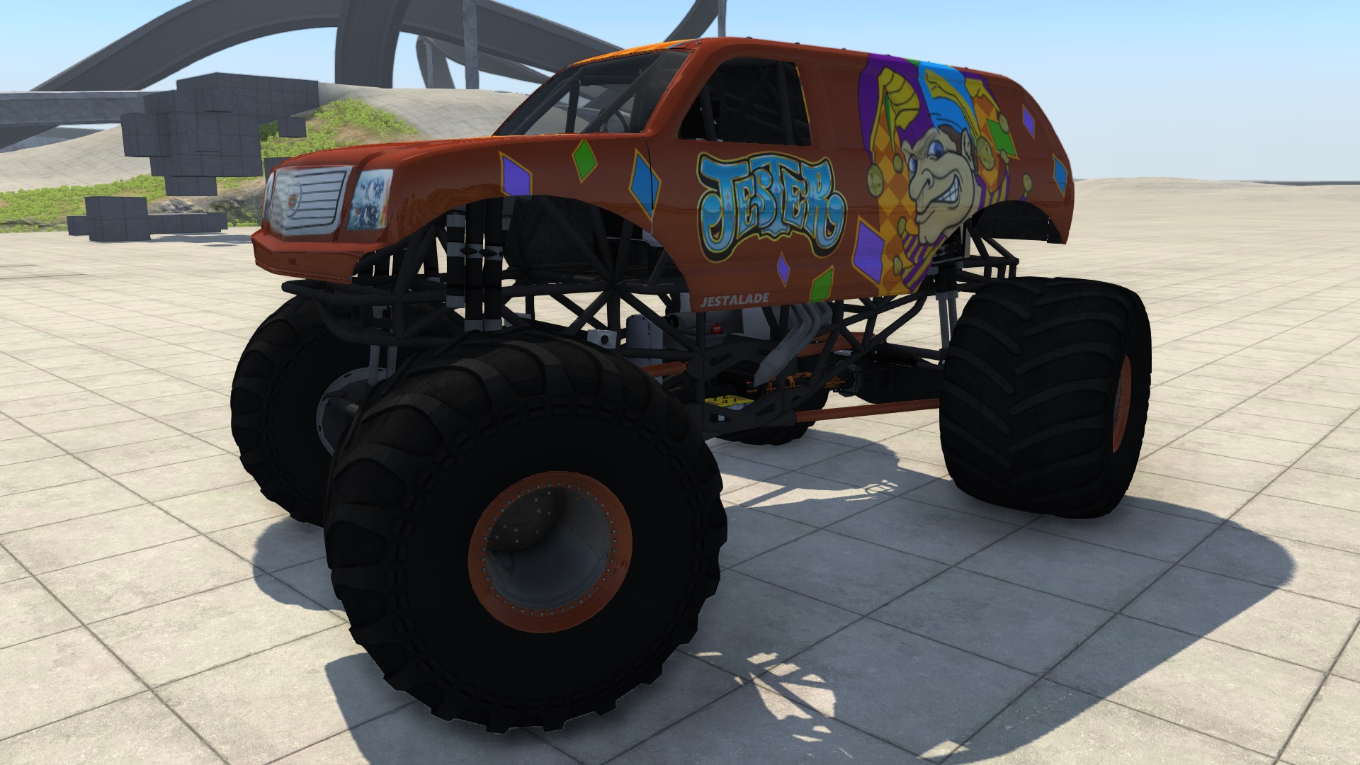 Yep. Some of them are still in a work in progress status: - nWo - New World Order: need to rebuild the whole body map in black - not yet started - Soldier Fortune Black Ops: the base texture I have is a bit low res. I'm rebuilding it from scratch using that as a reference - in progress - Grave Digger XXVII: got the authorization from @Fen to introduce some upgrades to his truck (working headlights, fully functional skin system, more cohesive paint scheme for colorable parts, shell moved to the chassis_B with halo) and include it in the main development branch - not yet started. All the other trucks shown (Perpetual Destruction, Soldier Fortune, Mad Scientist, Jester) are ready for deployment. I'm working on it. I have designed three approximated generic beam structures (pickup, fastback and SUV) in order to adapt them to each of the different body shells according to their shape. So far I'm having a few issues - interaction of the body with the chassis underneath may produce unpredictable results, such as the whole body folding like a wallet in case of a very violent frontal impact, and some cases of wierd flexbodies glitches due to the increased nodeweight, like the front shocks appearing deformed in Soldier Fortune. Two layers of beams (like with a spaceframe + shell structure) don't work very well together in BeamNG, so this might well be like tilting at windmills... I could postpone the release until those are fixed in order to produce a significant and much needed update to the mod, or release them as they are now and keep on working on the structures while you all enjoy the new trucks. Up to you. --- Post updated --- A well know issue I'm yet to iron out properly. One that's been tormenting me since... ever. The axles assemblies need strong stiffening to prevent this, but then Hell ensues. The truck can't go in a straight line anymore and even slight bumps can randomly kill the whole driveline depending on the angle of impact. I want to fix it, I really do, but nothing I've attempted so far seems to do the trick.