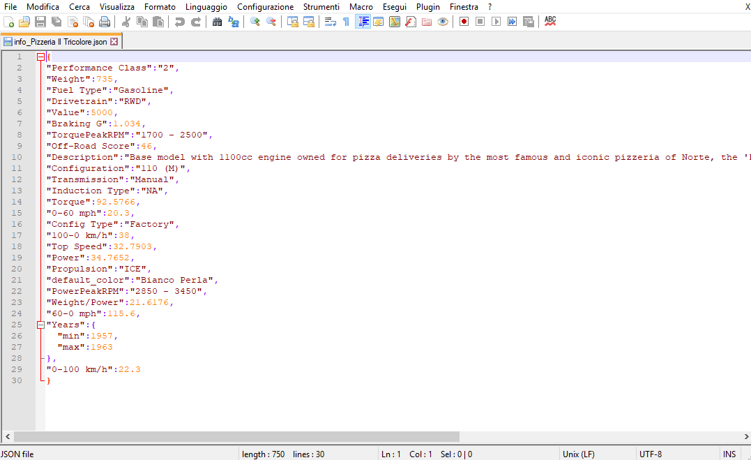 It's bit weird that it says "Pizzeria Il tricolore/Pizzeria Il Tricolore" as it should say "110 (M)" right now. The "Configuration": "x" -defines the config name so try to change that to "Pizzeria Il tricolore" if it would work properly then. Also, I would recommend to avoid spaces in file names as that can sometimes cause issues as well, so prefer using something like "Pizzeria_II_Tricolore" instead.