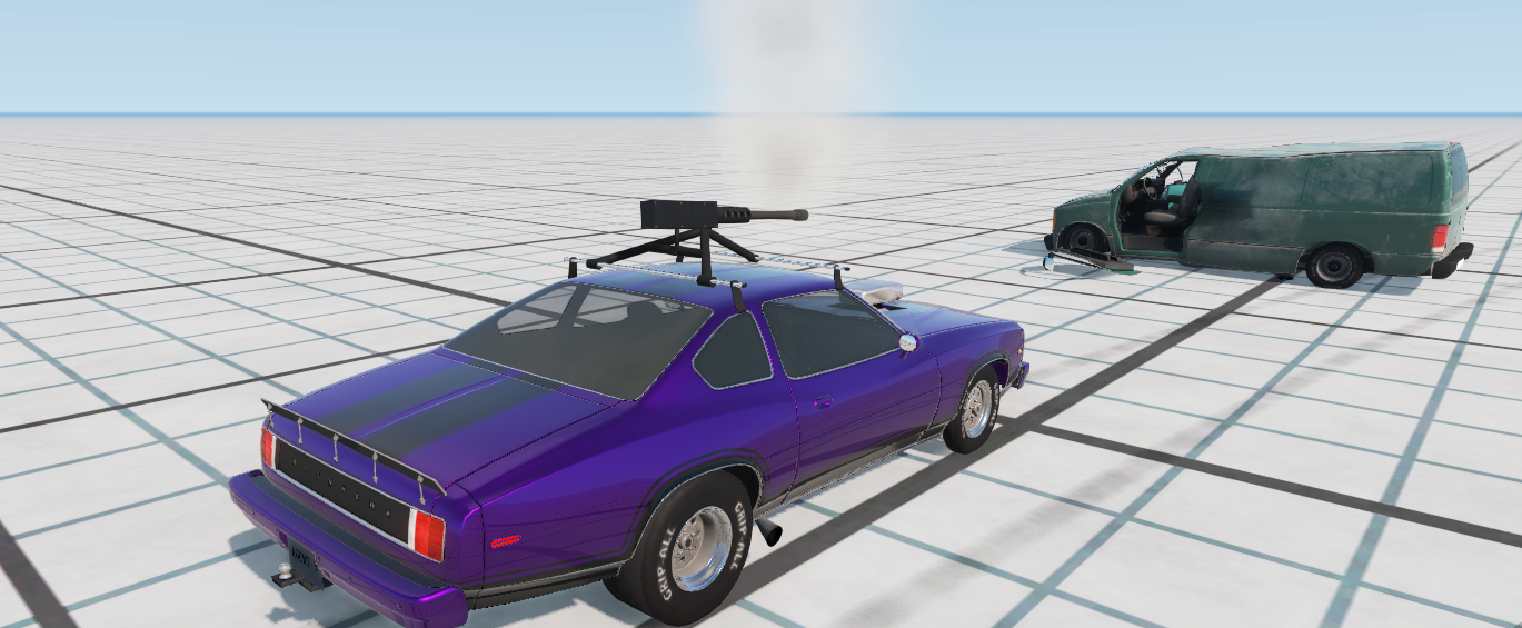 My universal gun is functional and aimable now. If you aim high enough, you can have an insane range and reach a really long distance, like a sniper rifle but way less precise lol. You can also try to shoot at your own hood if you want for some reason, but the bullets don't collide with your own vehicle. If they could collide, then with the current setup they would collide with each other, and they are all in the same place initially, so the car would explode if you tried to shoot (yes I tested it and it happens lol) Biggest issue with it right now is that it only has 100 bullets. There's a reason, for 100 bullets I needed around 1500 lines of Jbeam code. Each bullet is a single node, but each one needs to have a separate launcher. A launcher works like in the cannon, it consists of 2 nodes (which take more weight than the bullets), 2 thrusters (one for shooting and the other for recoil), 4 beams that keep both the launcher and bullet in place, generate the launching force and trigger the breakage of holding beams, and also 3 slidenode definitions, 1 for the bullet and 3 for the launcher. Each bullet and break beam also has its ID used in the LUA controller, + additionally each group of beams has its own breakgroup. So these 1500 lines are pretty long, and the whole file with 100 bullets is almost 100KB, while the Jbeam of the gun itself if less than 10KB. For comparison the biggest Jbeam file of the Maluch is 63KB and average there is around 10KB. Adding 10 times more lines to this 100KB bullets file wouldn't be an optimal solution, so I will add more bullets as separate files, I'm aiming to have 1000 in total. Also I probably need to add an ammo belt, it will be optional, you will be able to have invisible ammo if you want. After that just testing and release hopefully. EDIT: Turns out that 1000 bullets is not really the best idea... It's really laggy and makes the car too top-heavy, and it also isn't too realistic. 300 bullets with a 10 bullets/second fire rate seems like the most reasonable option, but there are also other options available if you want.