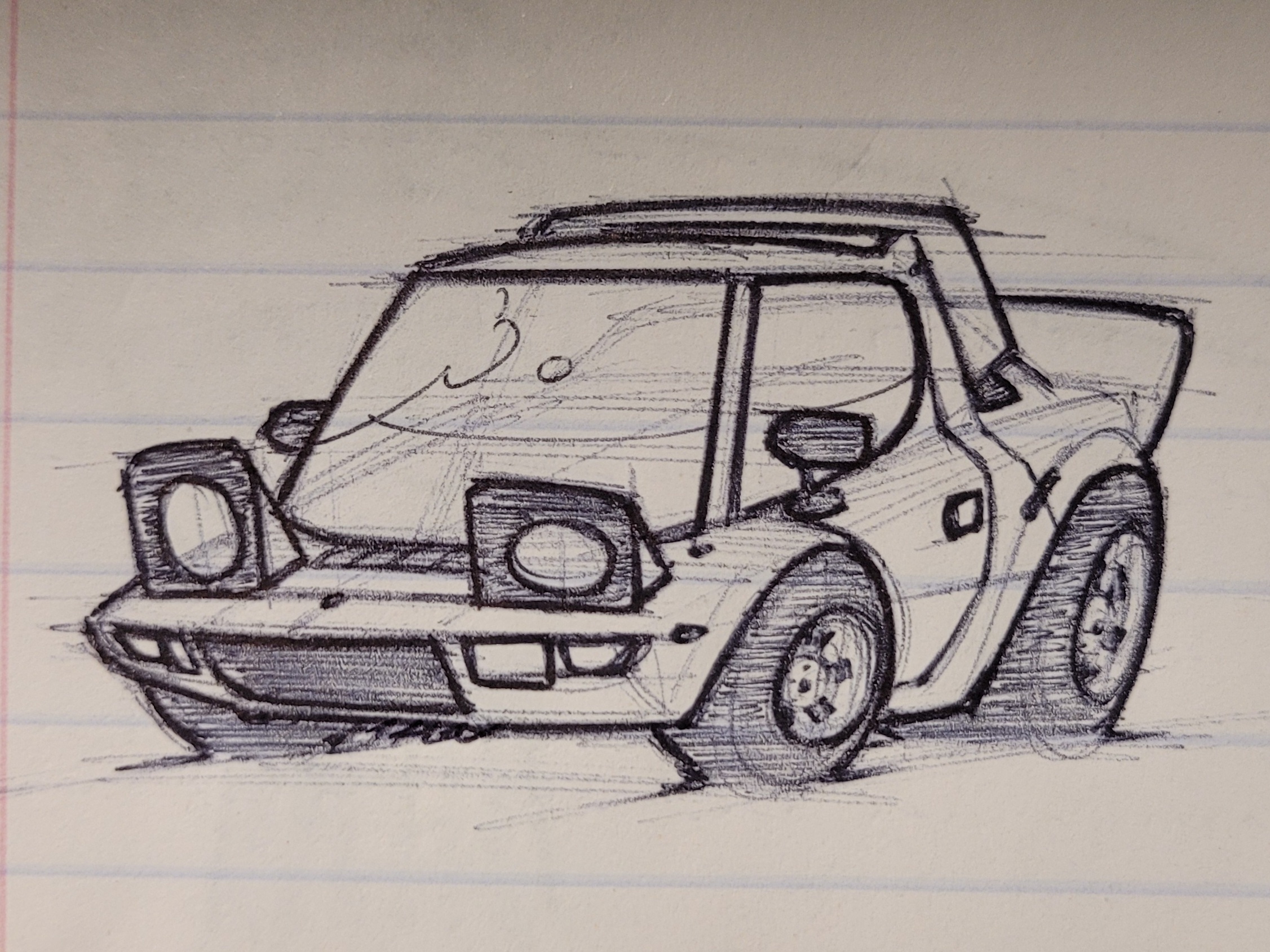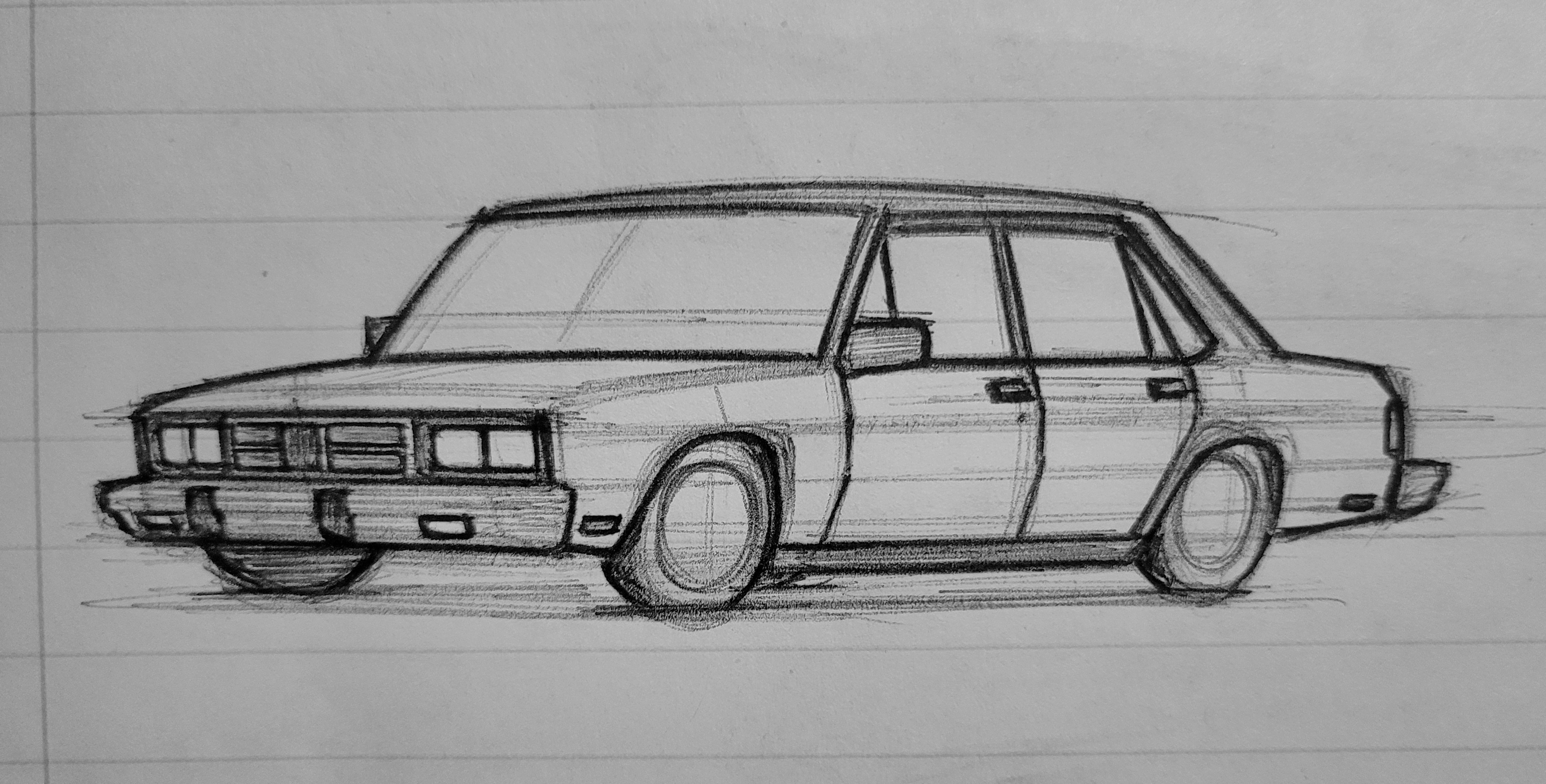 some sort of malaise era bruckell sedan, the way my camera works always screws with the proportions of my drawings so it looks slightly off