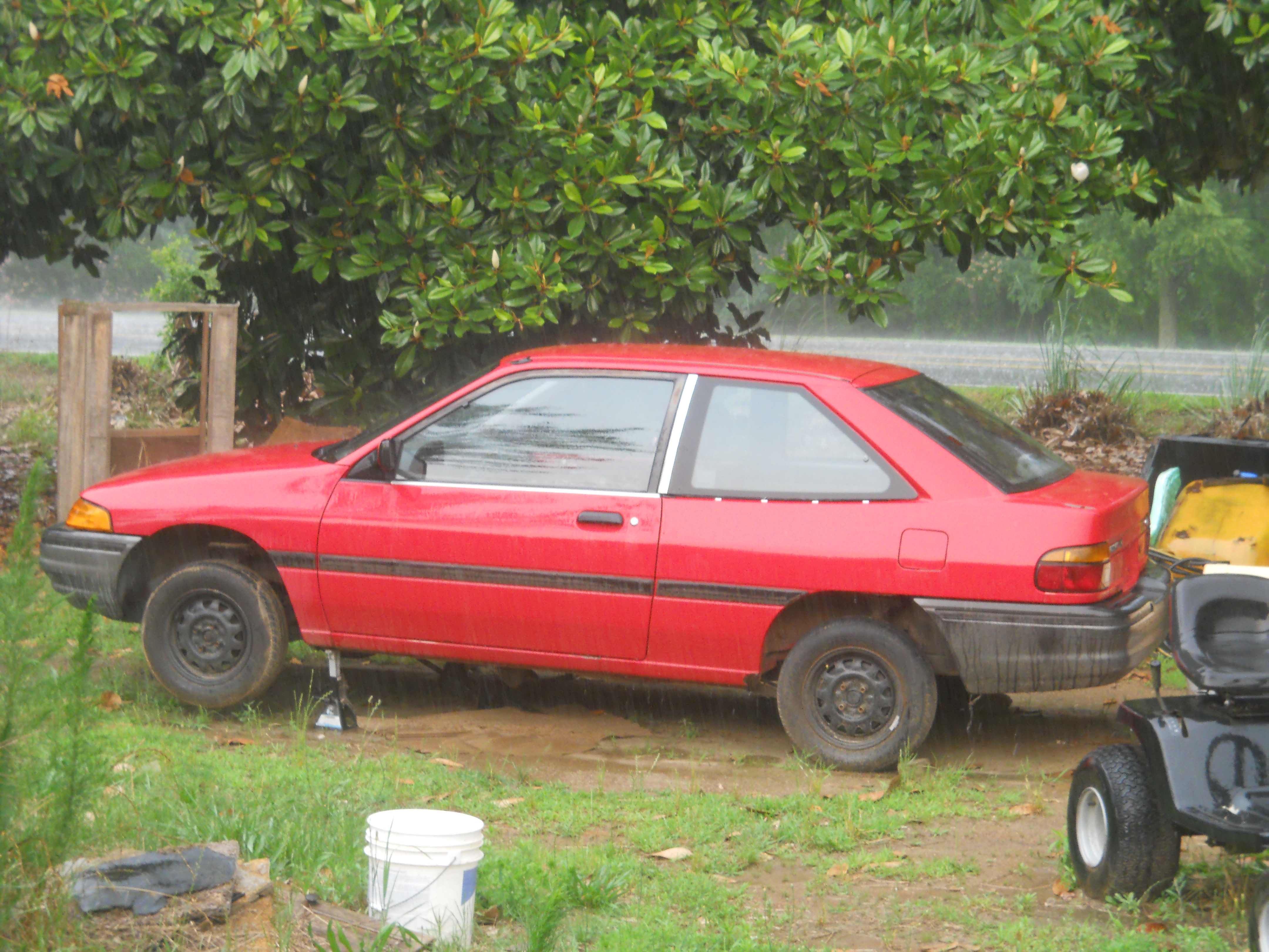 IT'S FUCKING HAMMERING OUT THERE. It's raining drops an inch in diameter at least. Water is about 3 inches high since about 20 minutes ago. Here's a pic I took when it started of my car.