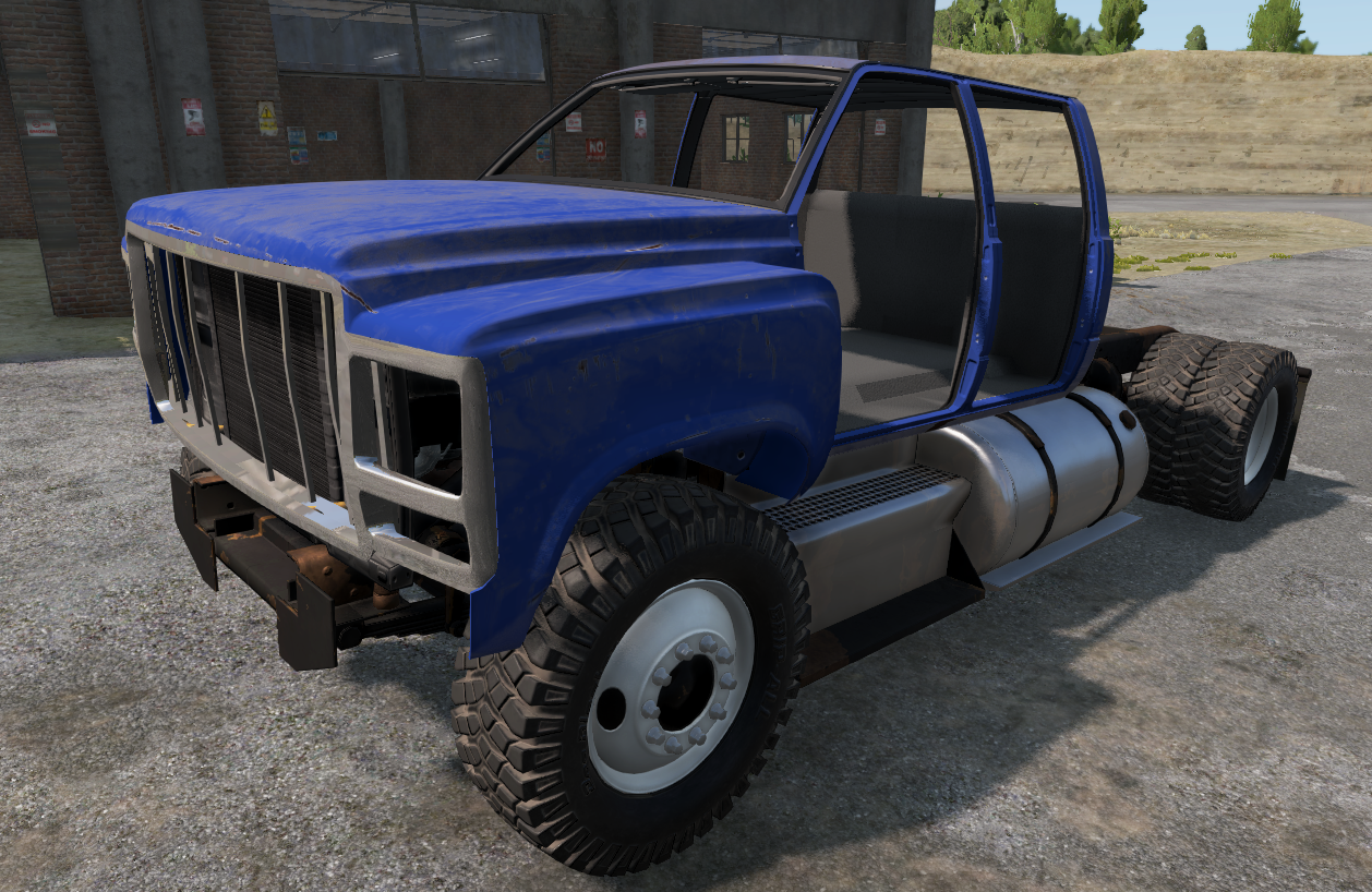 It's been months, maybe even years, since I bought this used military grade Gavril Reclaimer as my project truck. Originally I got it in a terrible shape, it looked like it was used in real military operations, only the hood was still usable (it was really good in fact, just a bit dirty and the grille had fallen off). The frame, cab, engine, suspension, everything important had to be trashed. I started rebuilding it from scratch, using Gavril T-Series and D-Series parts from the local junkyard, which I modified the same way as they would do it at the factory (they produced next to no custom parts for it to save money, only modified their existing spare parts, and the hood was actually produced by Brutus and delivered ready in bulk to Gavril). Some of my parts are a bit rusty, but nowhere near as bad as the original ones I bought. Recently I mounted the hood on the truck, and fitted stretched crawler tires on it instead of T-Series tires. It drives now, although it lacks a steering wheel and pedals, so you have to use cables and a wrench to drive. I need to finish it eventually, or else it will feel like I wasted my money on that hood.