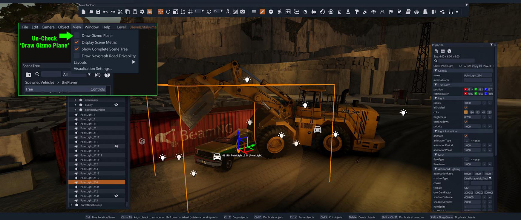 Hello everyone, What an Update 0.38, simply outstanding!. Can the 'Orange' Bounding Box and thin 'White' perspective lines in World Editor be 'Toggled On or Off' ...as I thoroughly enjoy adding extra lights into my Screenshots to illuminate darker shady areas with a extra 'Fill Light'. The thin 'White' Lines are the most problematic as they can obscrure the detail in the screenshot making it harder to see where to place the lights and also see how the lights are reacting to the scene. If so, where and how...thanks Below screenshot showing the orange and white lines in question. Below screenshots show 'Before' ( original screenshot) and 'After' (with added lights) Just personal preference