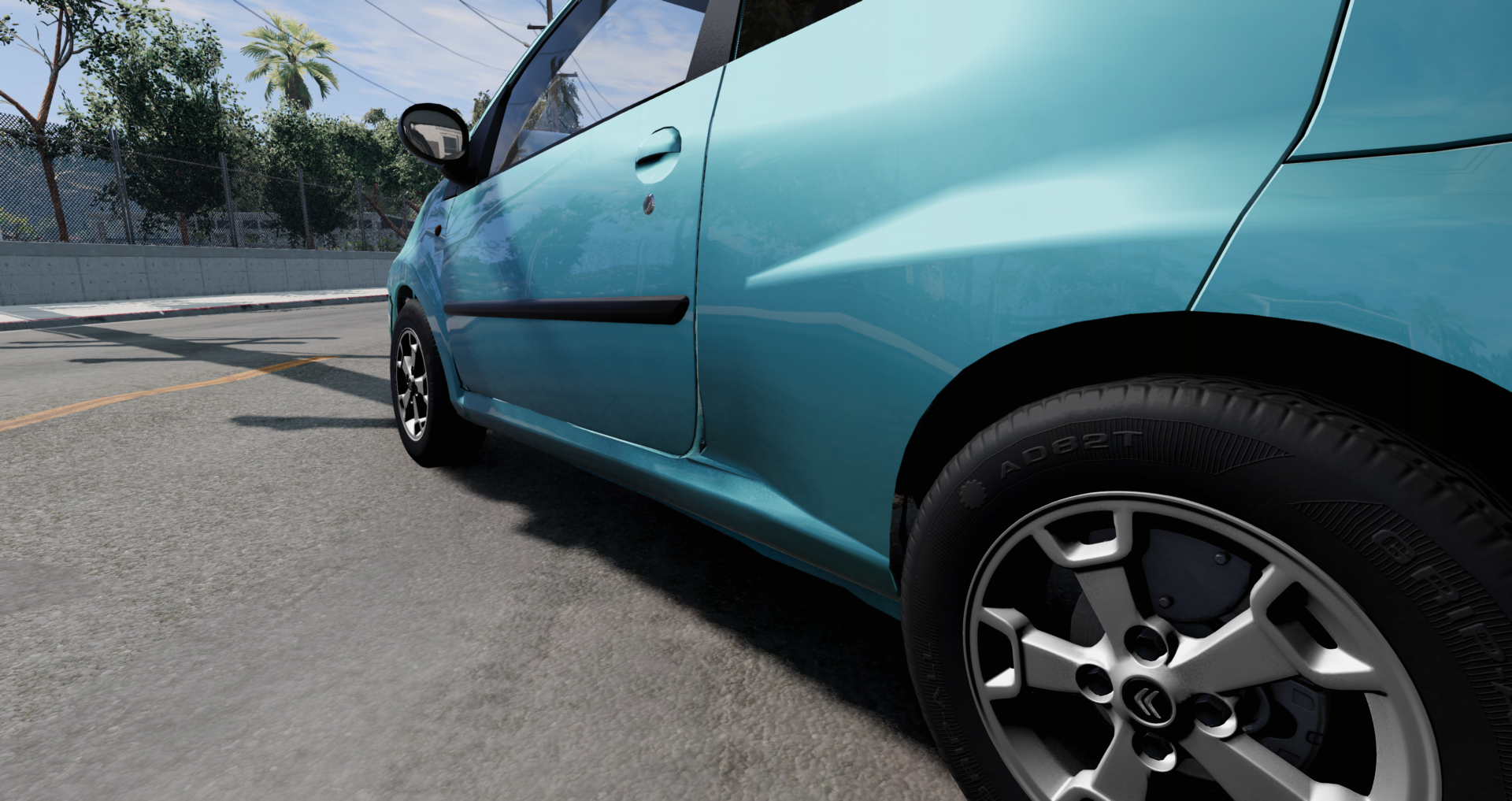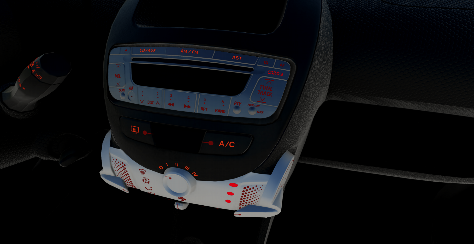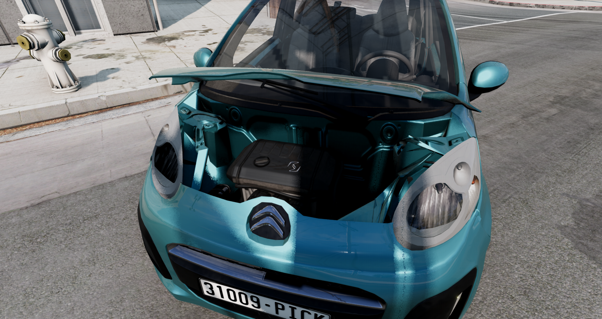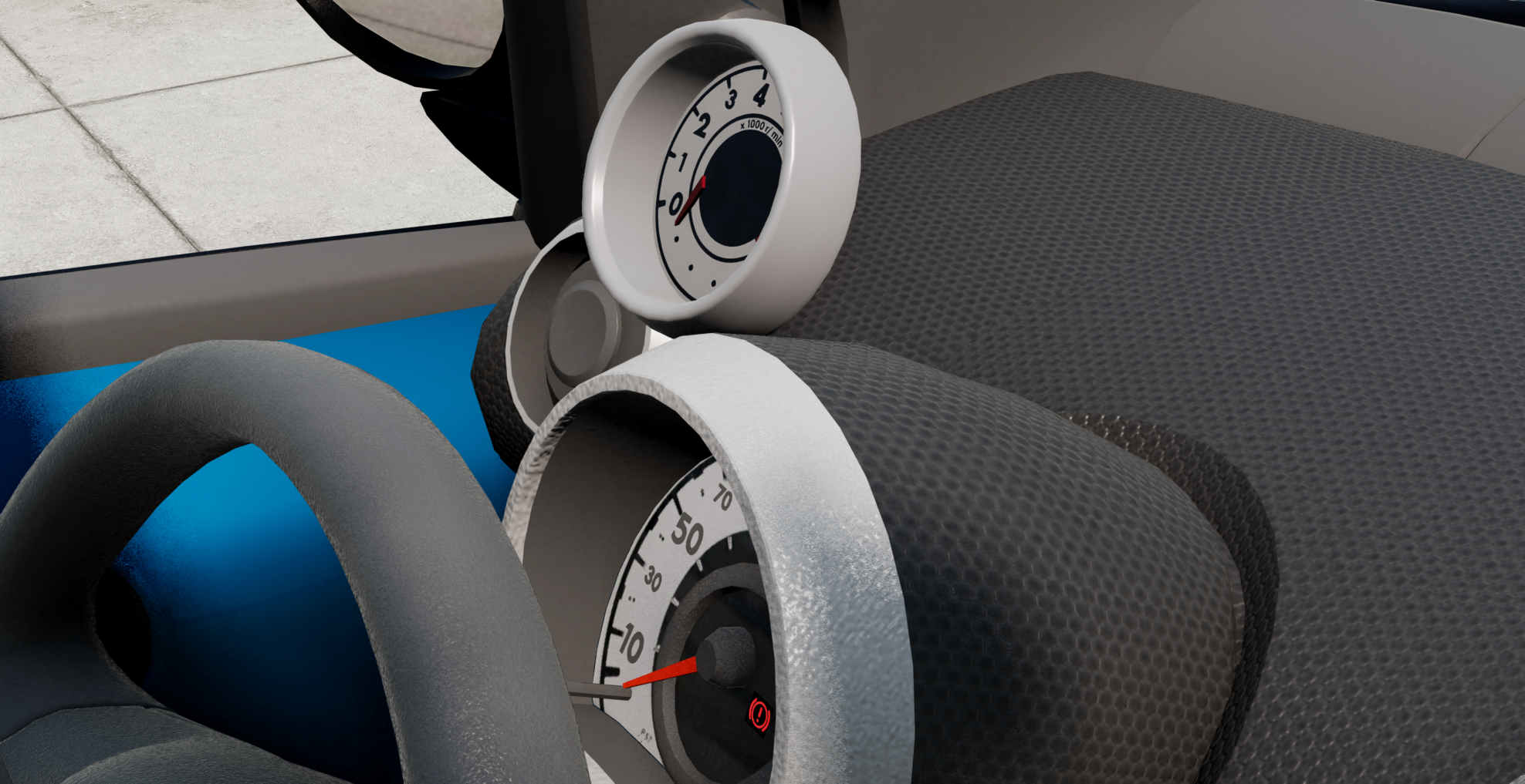 Interior...well, textures are better than expected, too bad about the badly positioned gauges as always. And that melted air vent. And every decal lighting up with the car lights. And the pedals being just a single texture only seen from one side...and more.